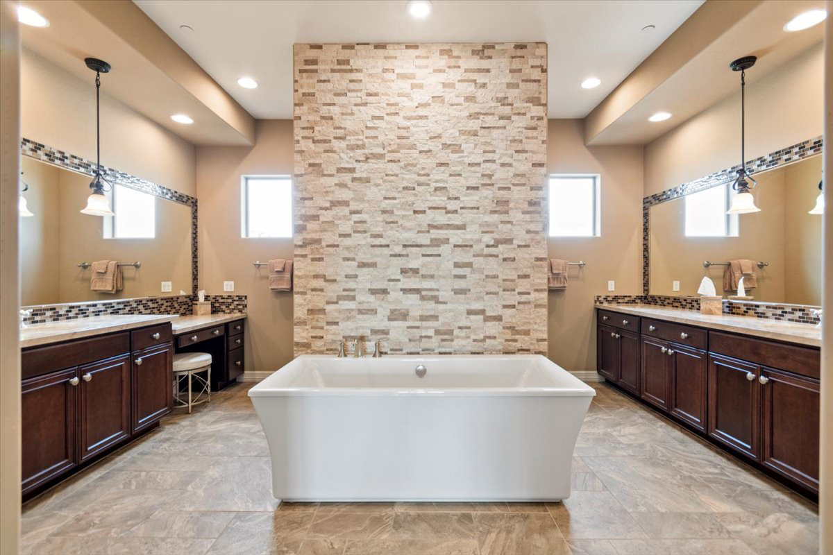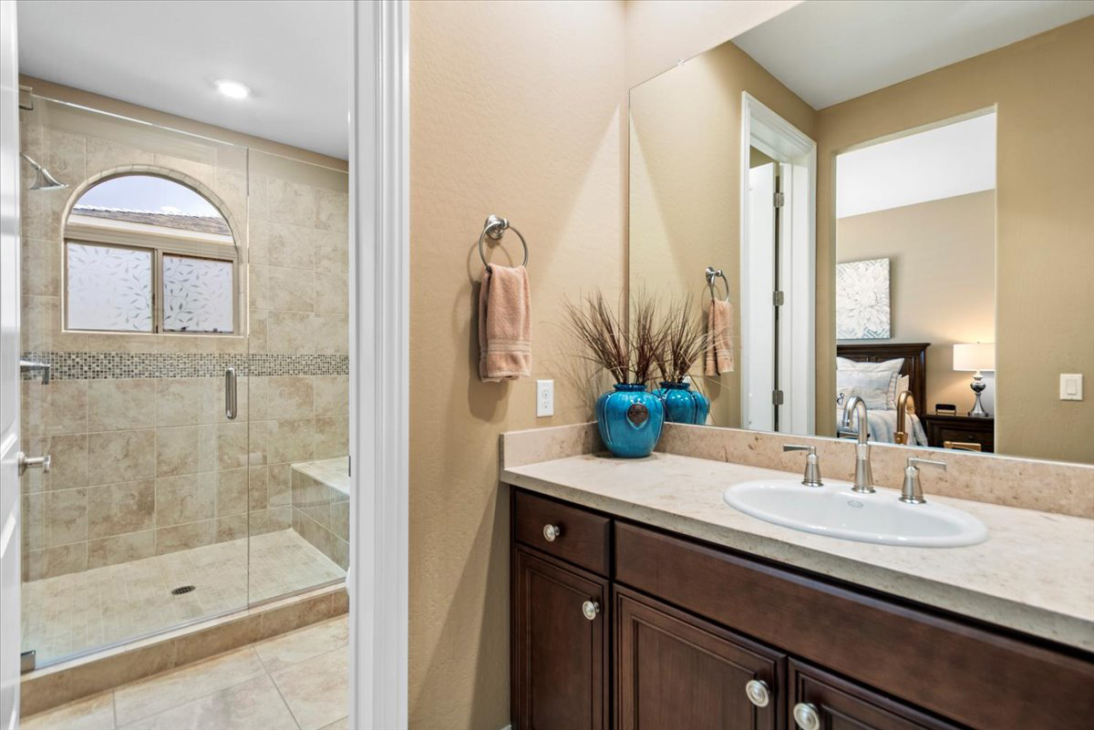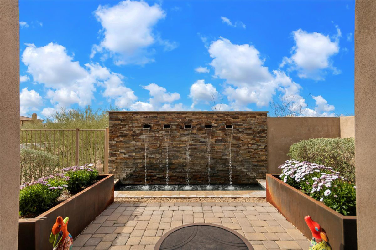 A separate secondary family room, accessible from the outdoors, includes clerestory windows and provides the perfect space for game days or casual gatherings. The primary suite is a serene retreat with its own private patio, accented by a stacked stone water feature and lush planter boxes. The spa-like primary bath includes dual vanities (one with a makeup area), a luxurious soaking tub, and a dual-entry walk-in shower.