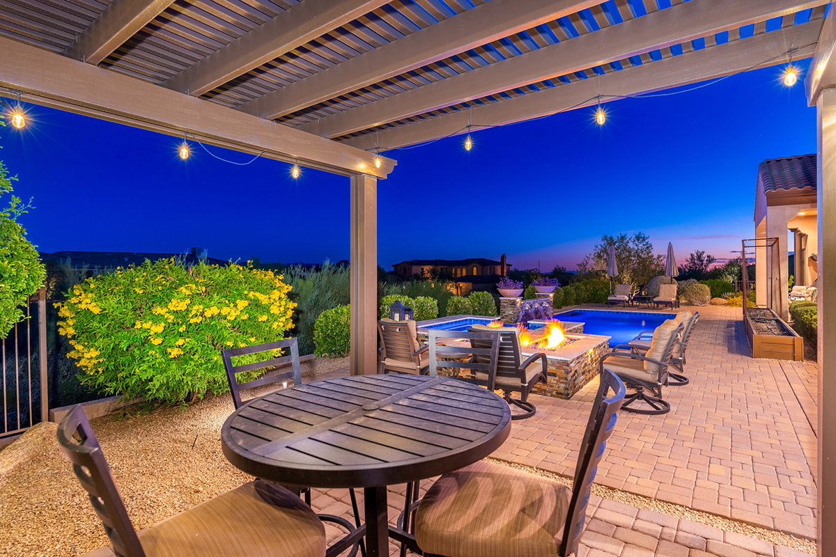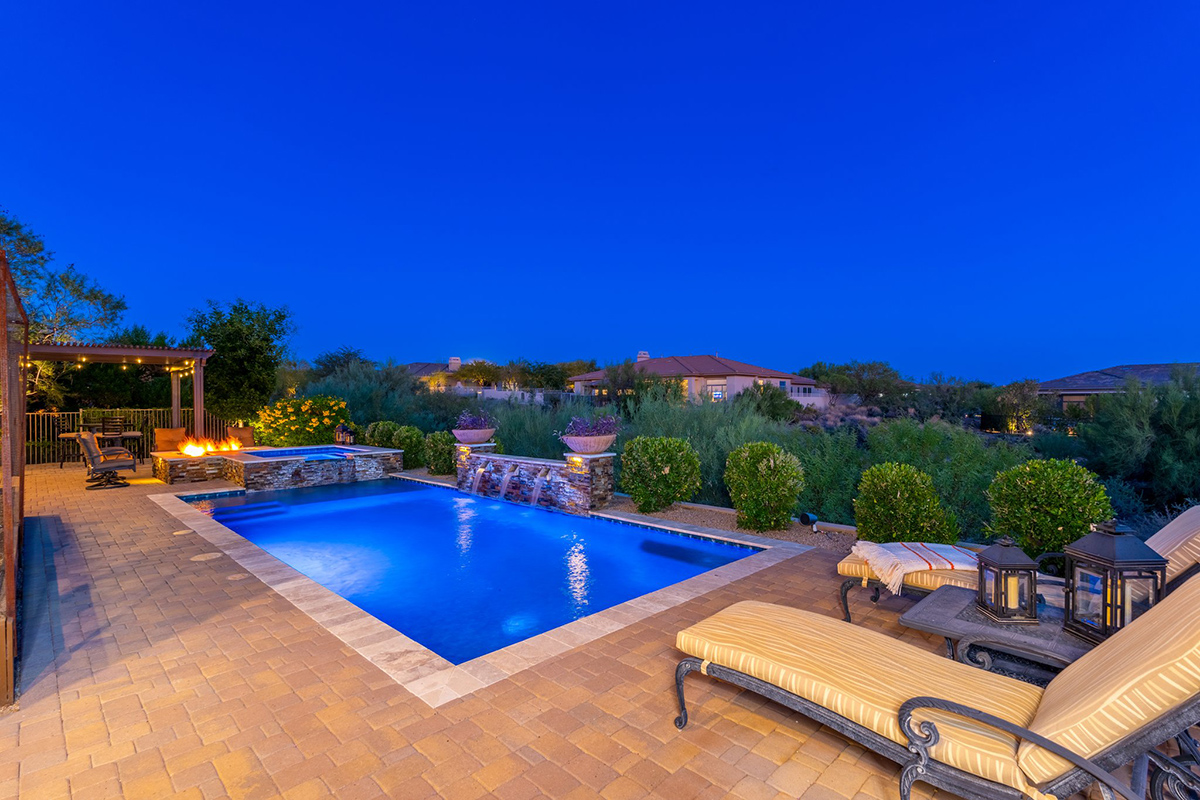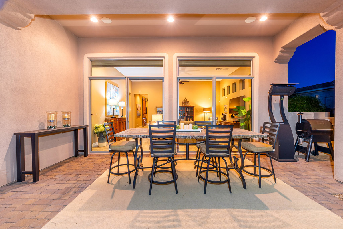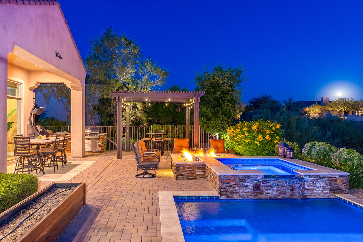 Situated on a corner lot while backing to an open area, the backyard is an entertainer’s paradise. It features a sparkling pool with a water feature, an elevated spa with a fire pit that wraps around the spa for added ambiance, and paver-lined covered patios and lounge areas. A built-in BBQ, raised garden planters, and a charming pergola complete this inviting outdoor space. Most of the exterior furnishings are available with the house, if desired.