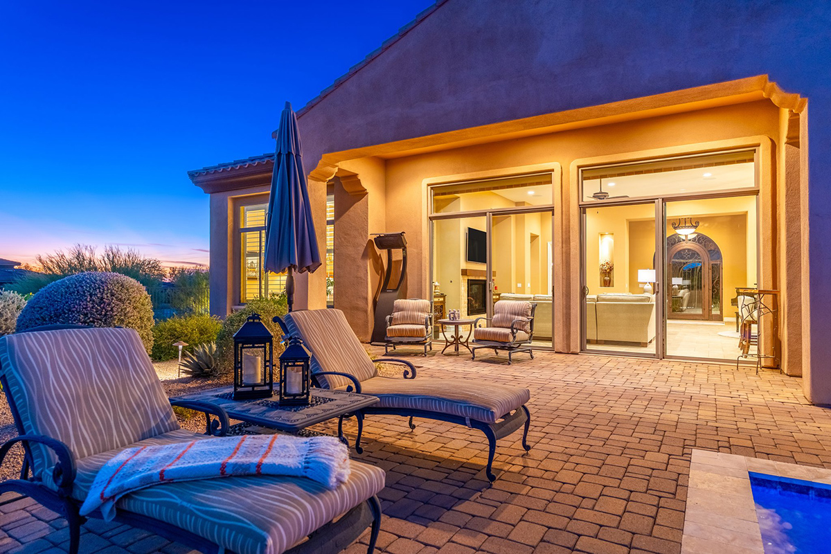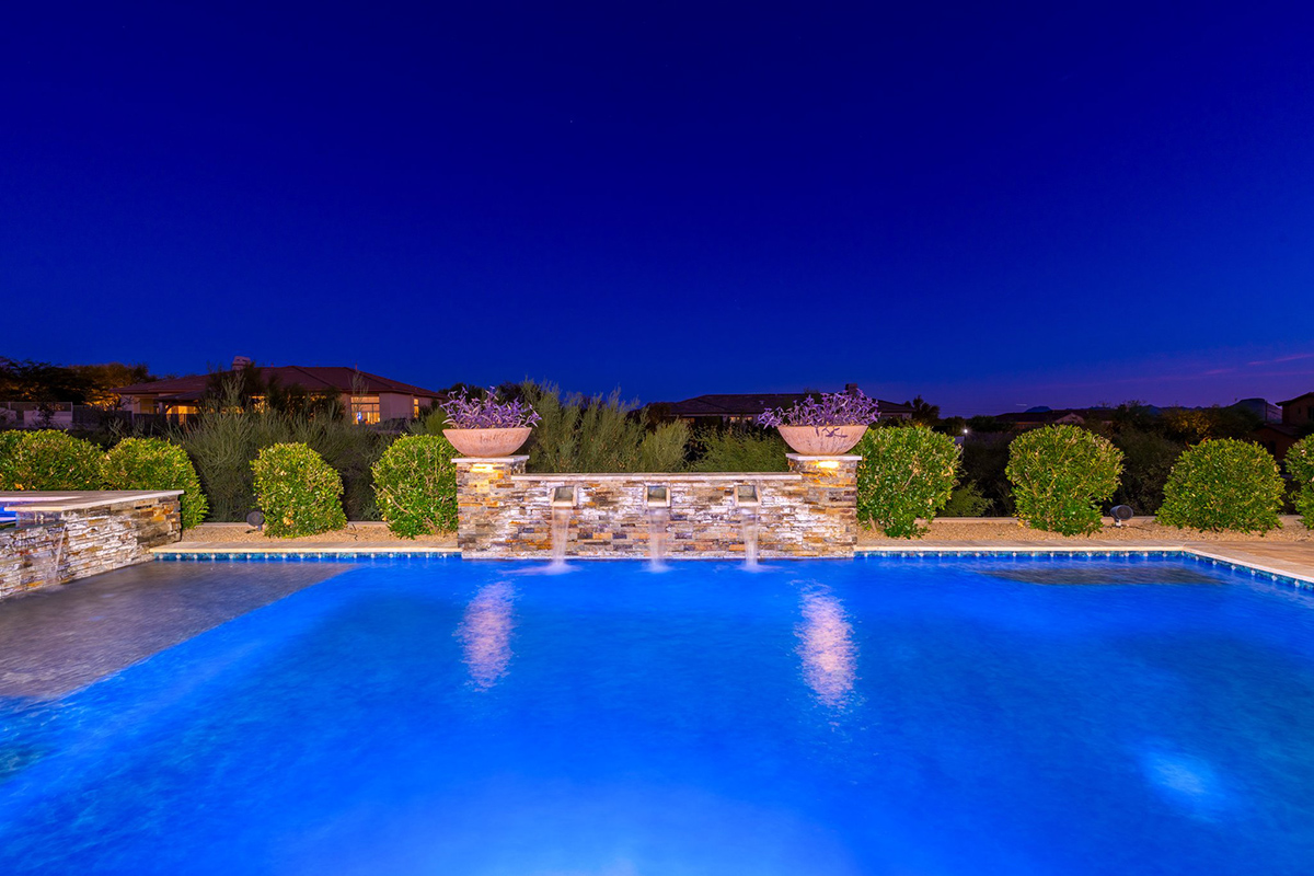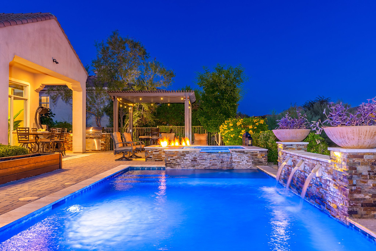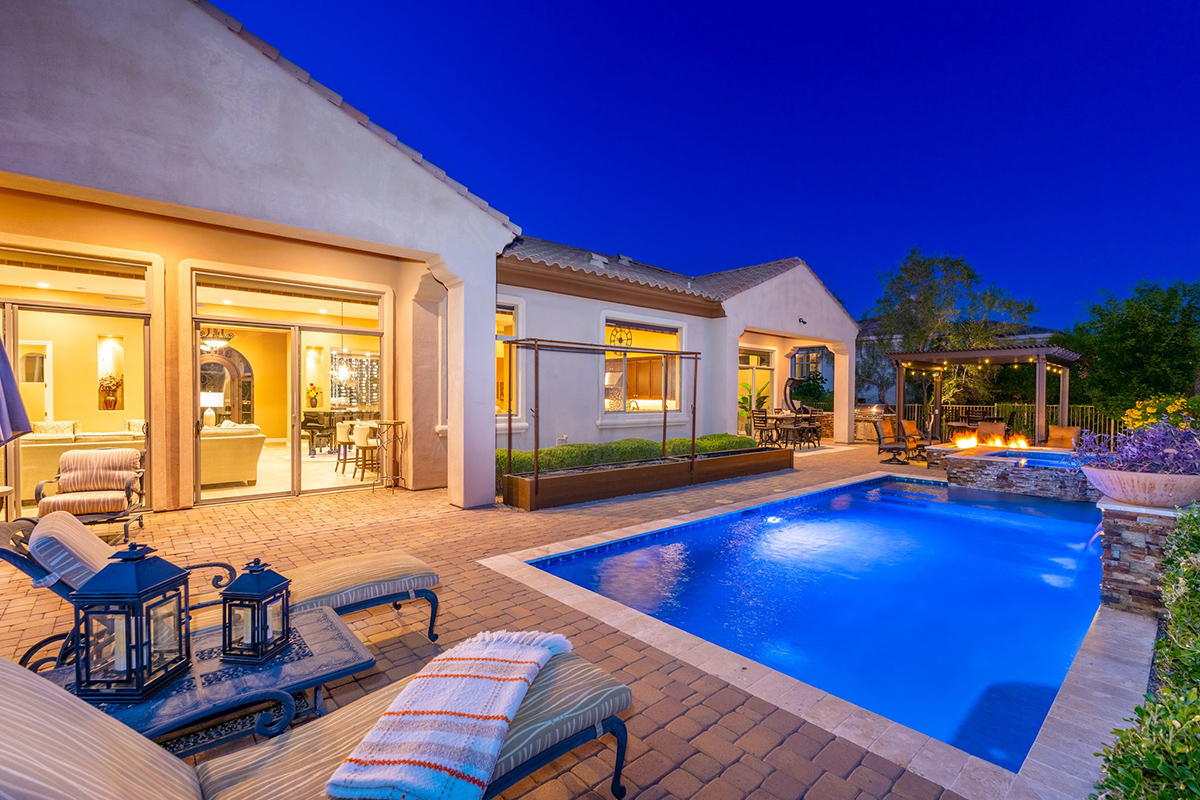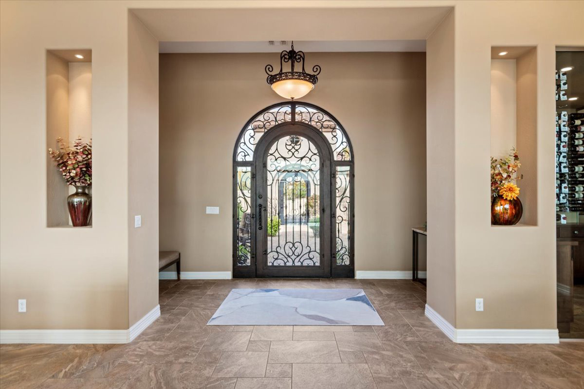 Situated on a corner lot while backing to an open area, the backyard is an entertainer’s paradise. It features a sparkling pool with a water feature, an elevated spa with a fire pit that wraps around the spa for added ambiance, and paver-lined covered patios and lounge areas. A built-in BBQ, raised garden planters, and a charming pergola complete this inviting outdoor space. Most of the exterior furnishings are available with the house, if desired.