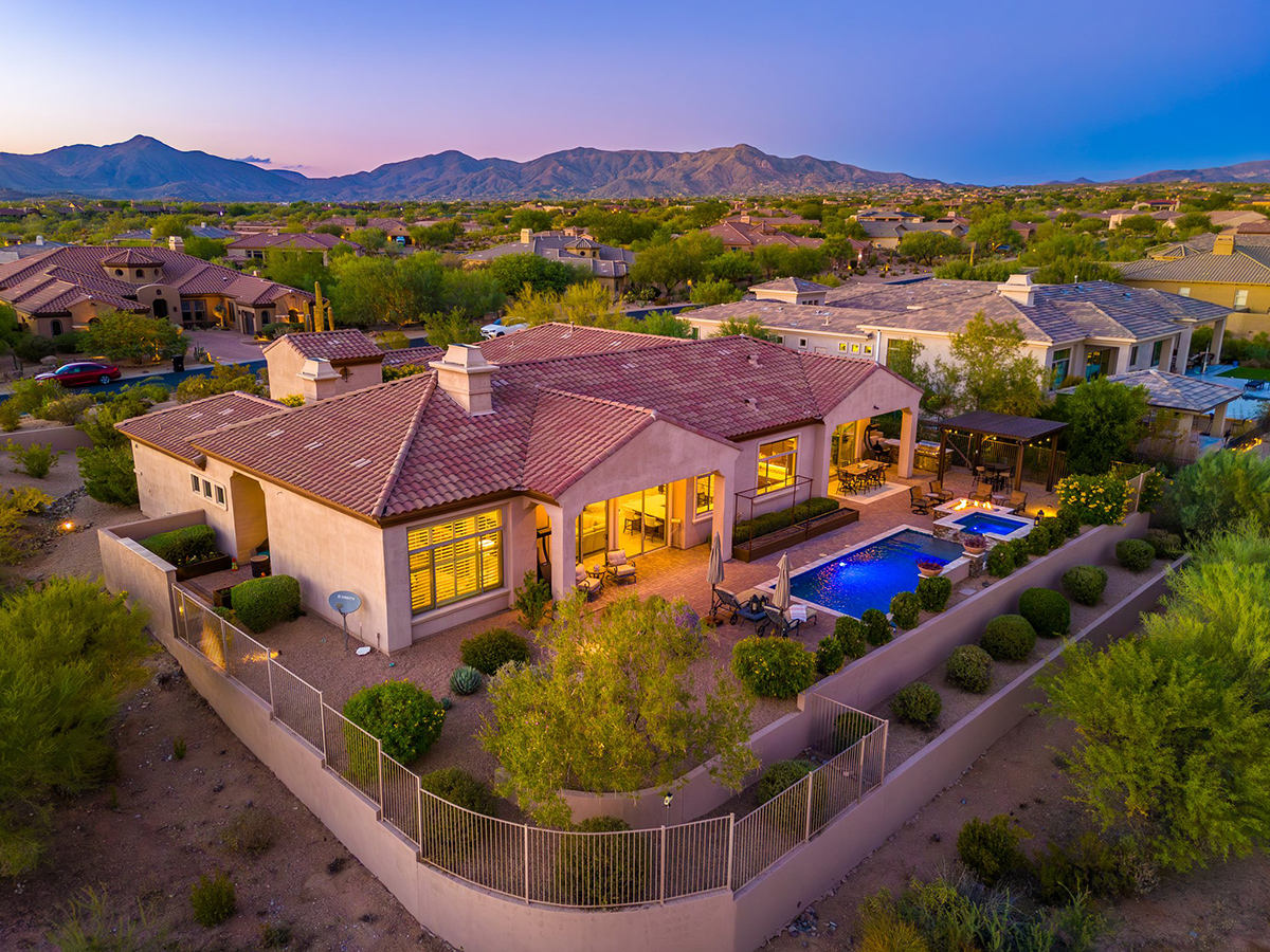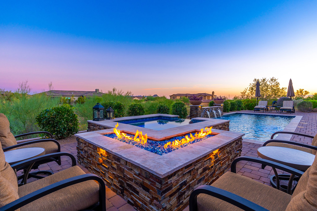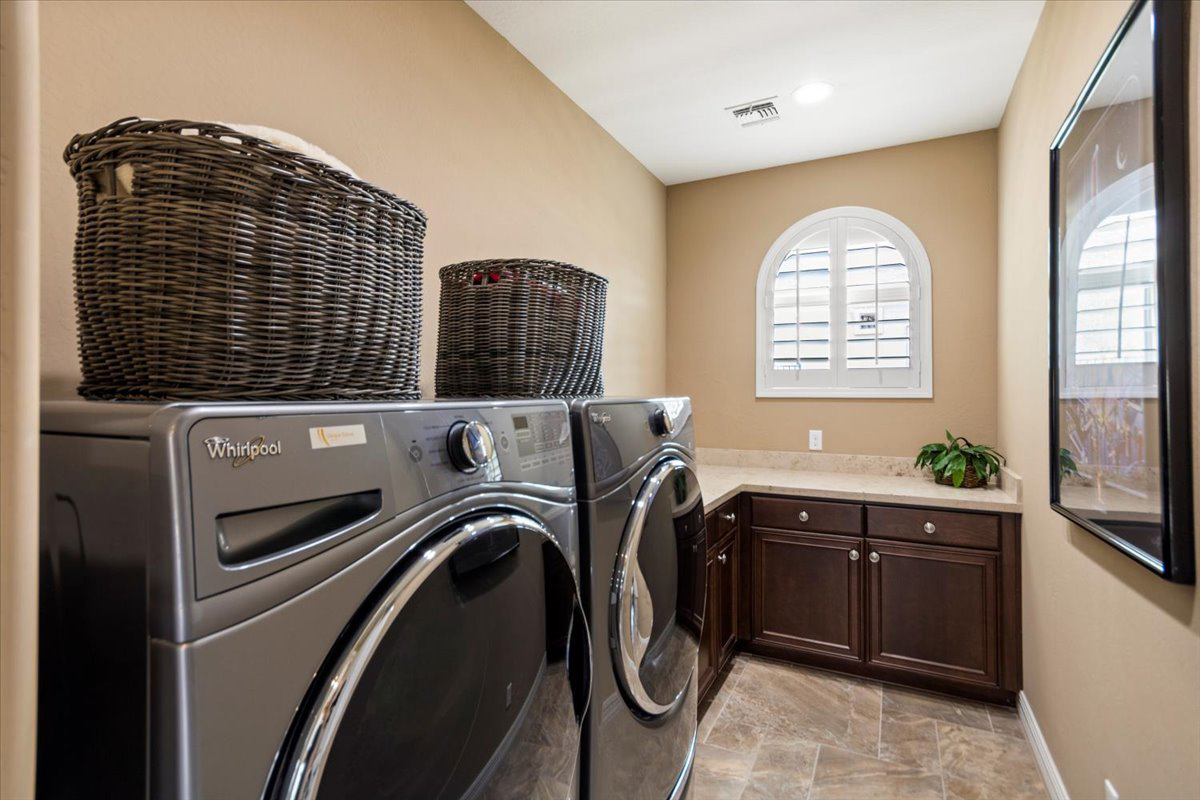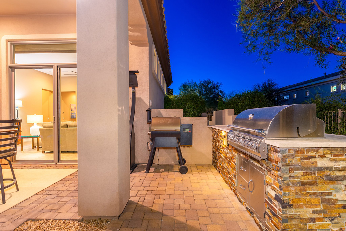 Situated on a corner lot while backing to an open area, the backyard is an entertainer’s paradise. It features a sparkling pool with a water feature, an elevated spa with a fire pit that wraps around the spa for added ambiance, and paver-lined covered patios and lounge areas. A built-in BBQ, raised garden planters, and a charming pergola complete this inviting outdoor space. Most of the exterior furnishings are available with the house, if desired.