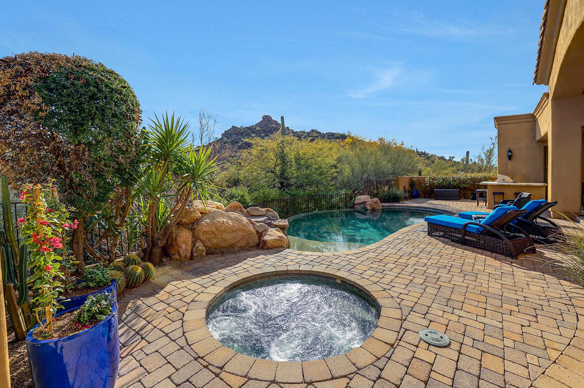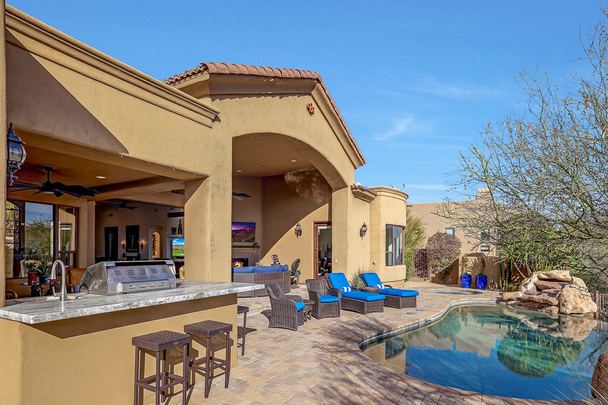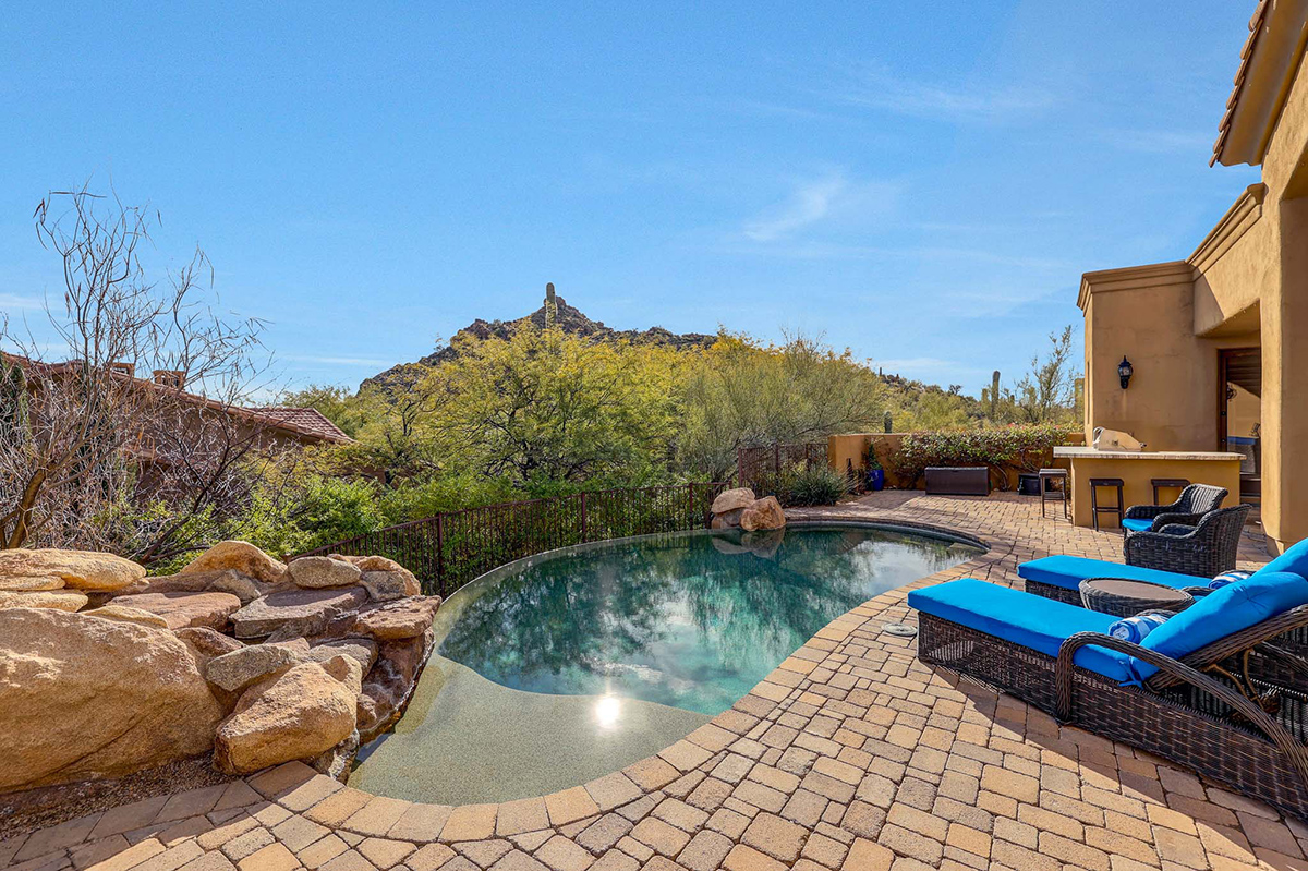 The residence offers breathtaking views of the McDowell Mountain Range from both the front and back. The outdoor oasis beckons with a pool, spa, outdoor kitchen featuring a modernized BBQ area with a new countertop and a fully reconditioned BBQ, fireplace, covered patio and panoramic mountain views. New irrigation system and new landscape lighting around the exterior. A full paver drive and backyard paver hardscaping add a custom touch.