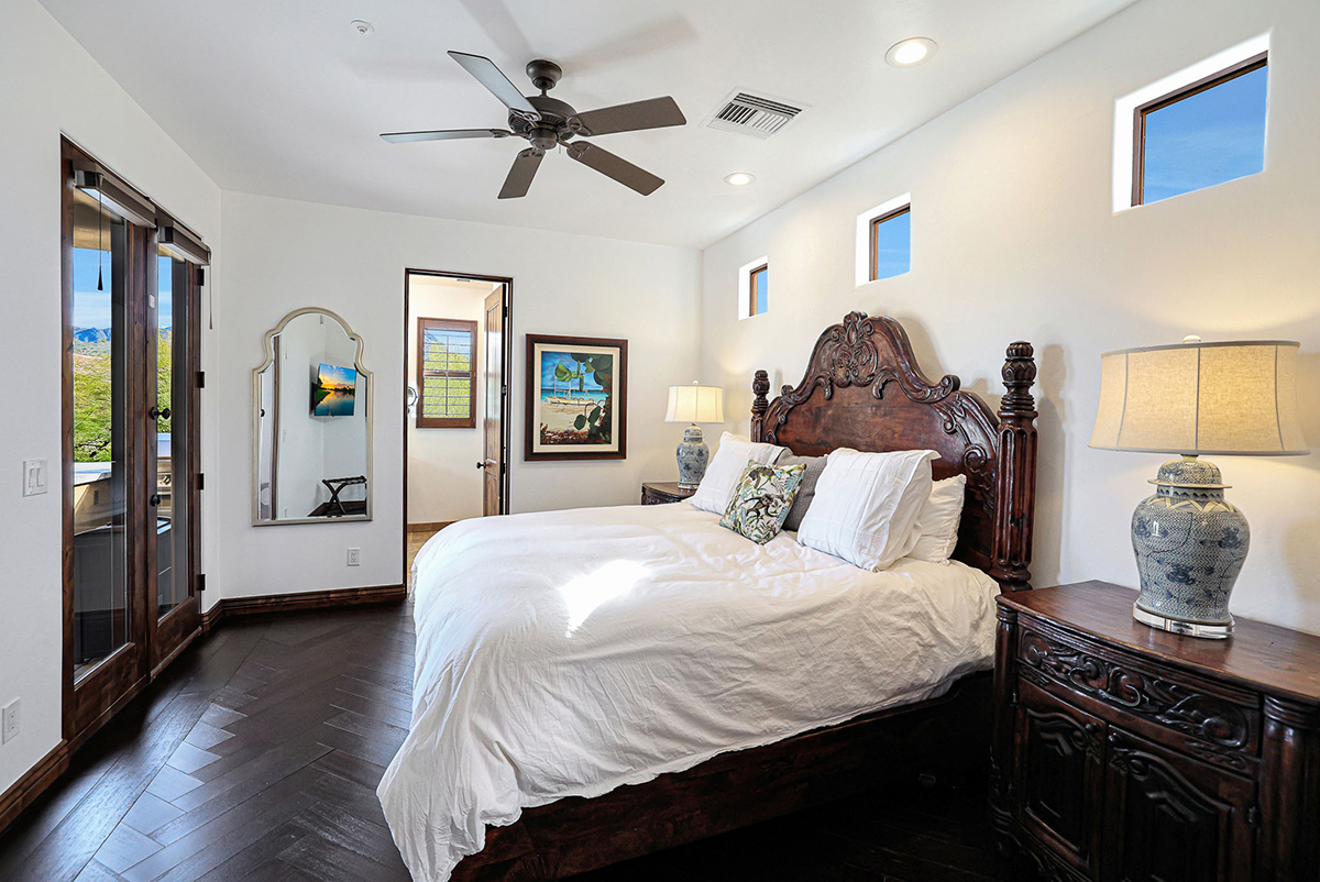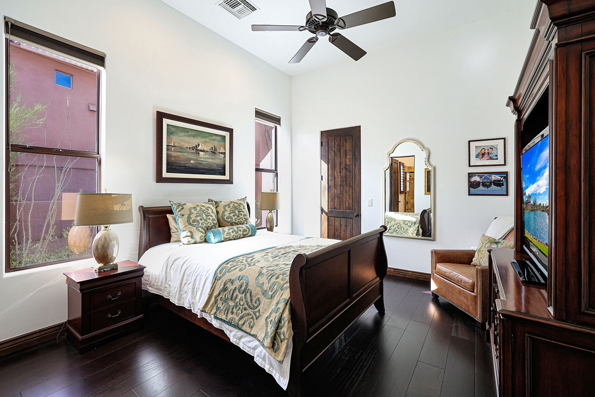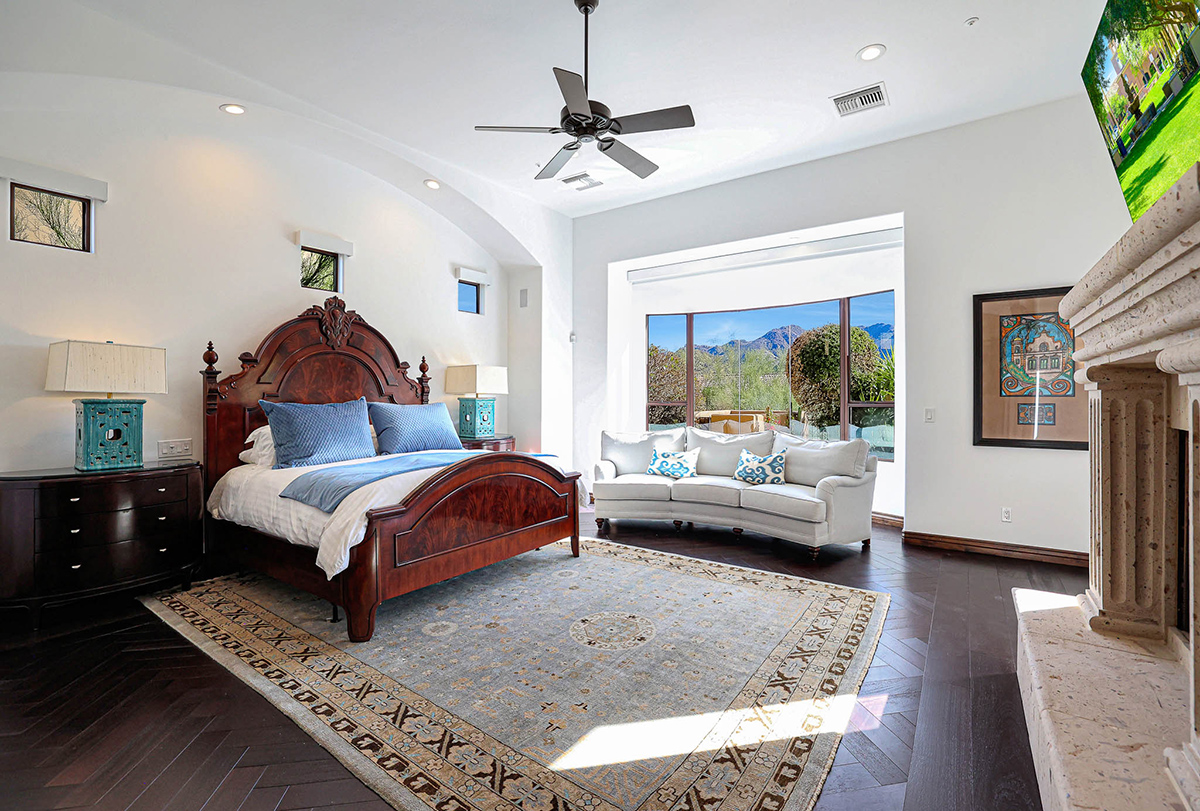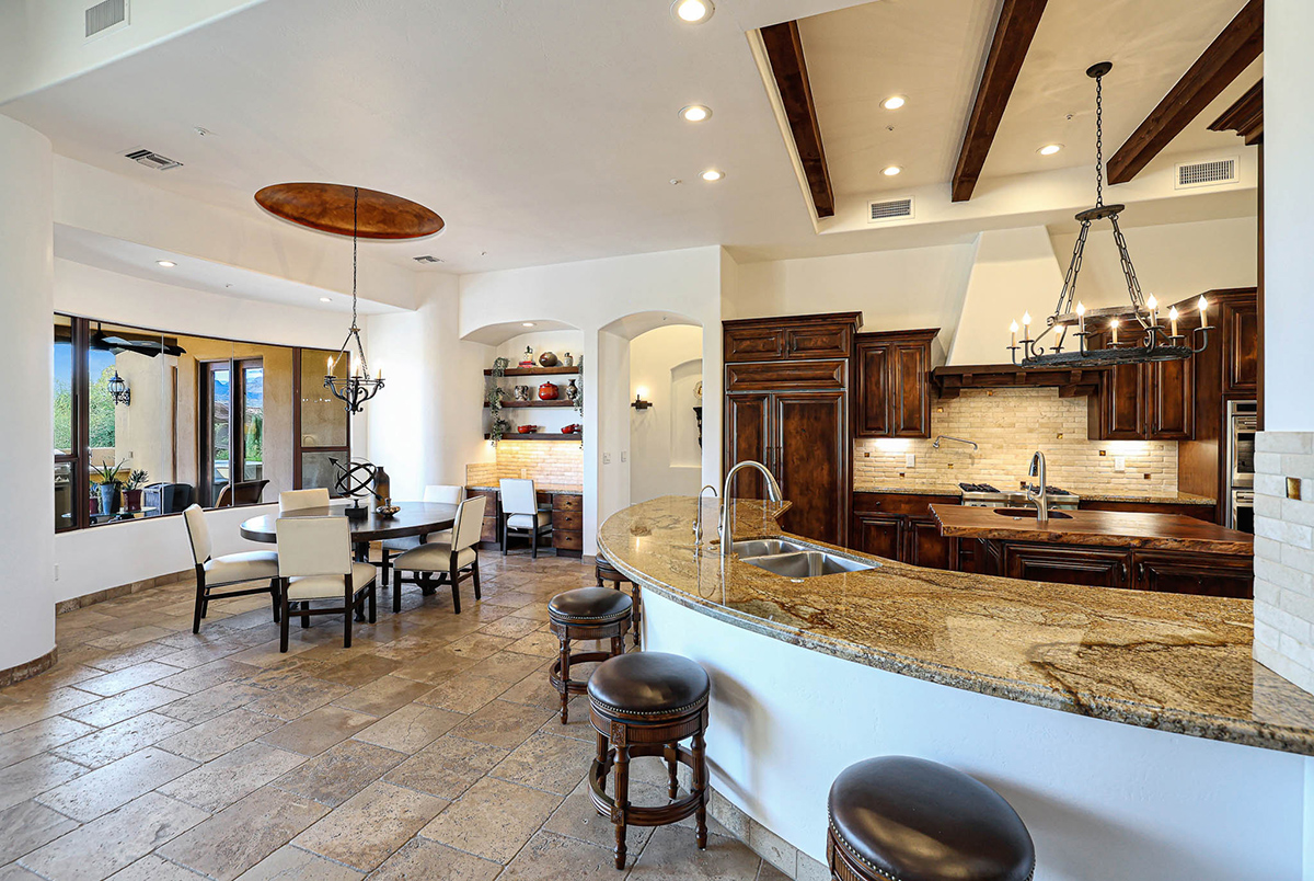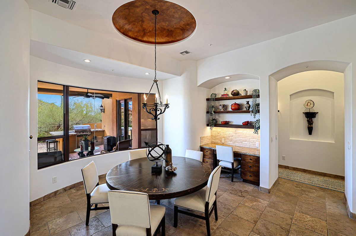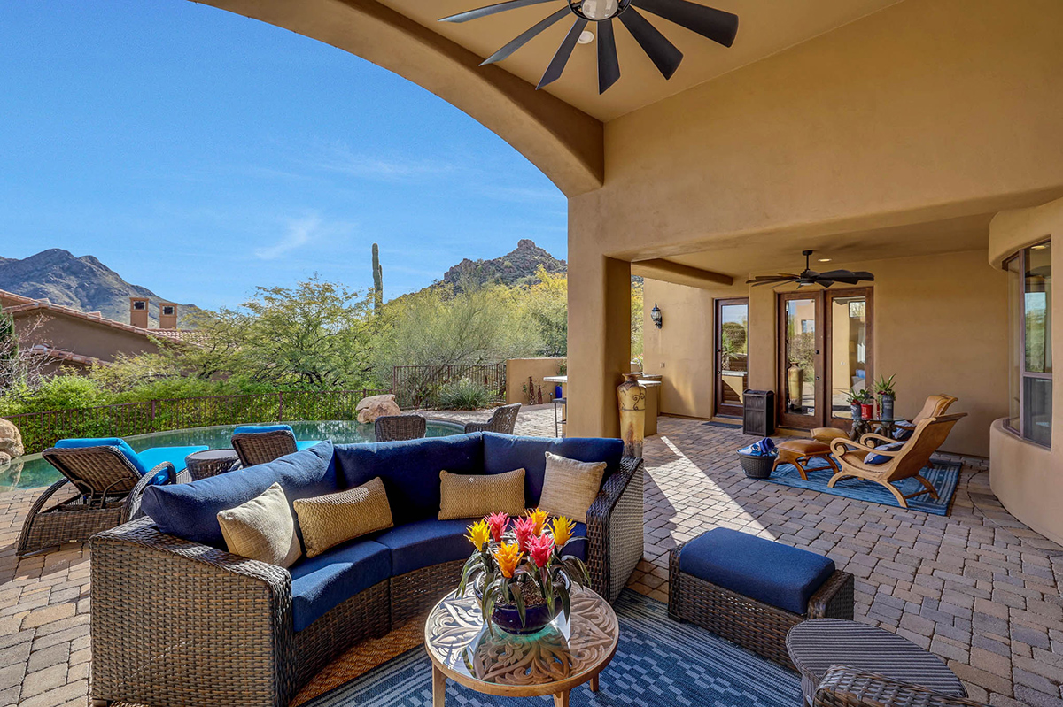 Premium finishes, including Wolf appliances, granite countertops, and tumbled travertine flooring, grace the interior. The property is equipped with an ELAN wireless control system for audio and shades, offering modern convenience. With its perfect balance of sophistication and comfort, this Troon Village residence is a captivating retreat for those seeking the epitome of luxury living.