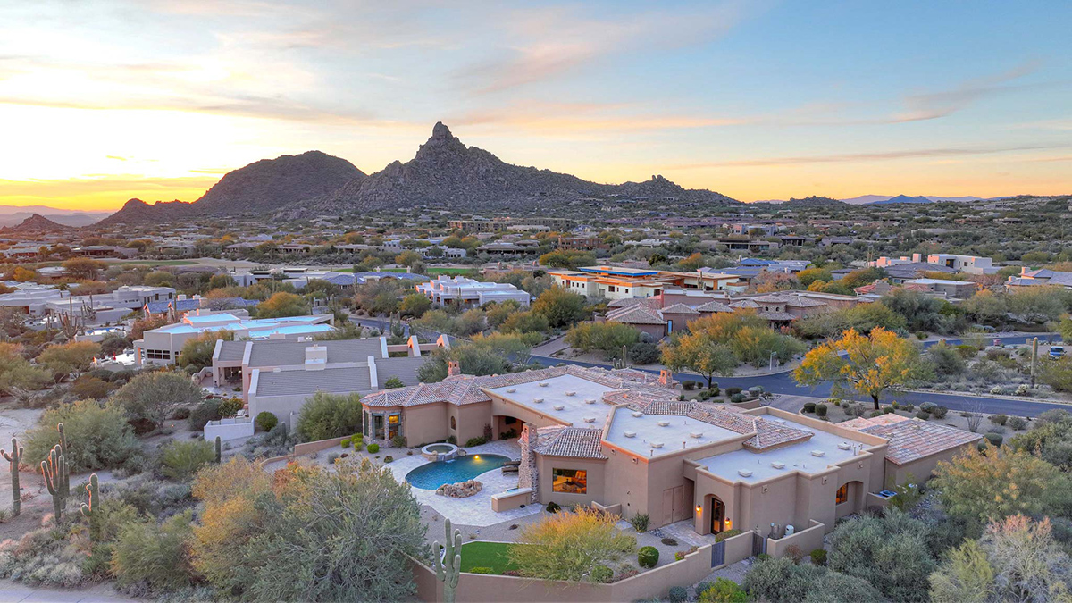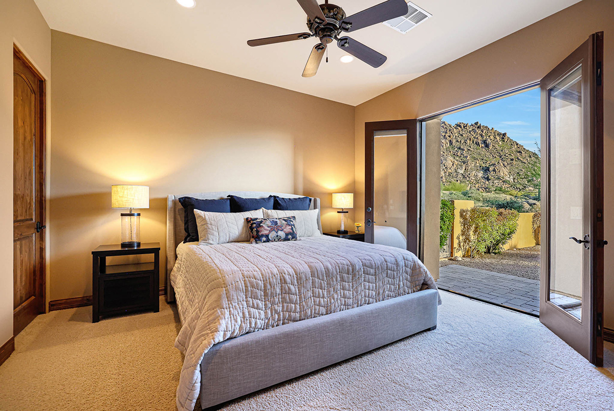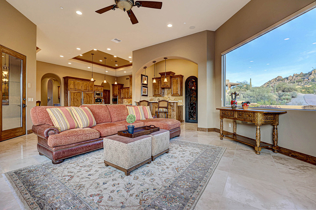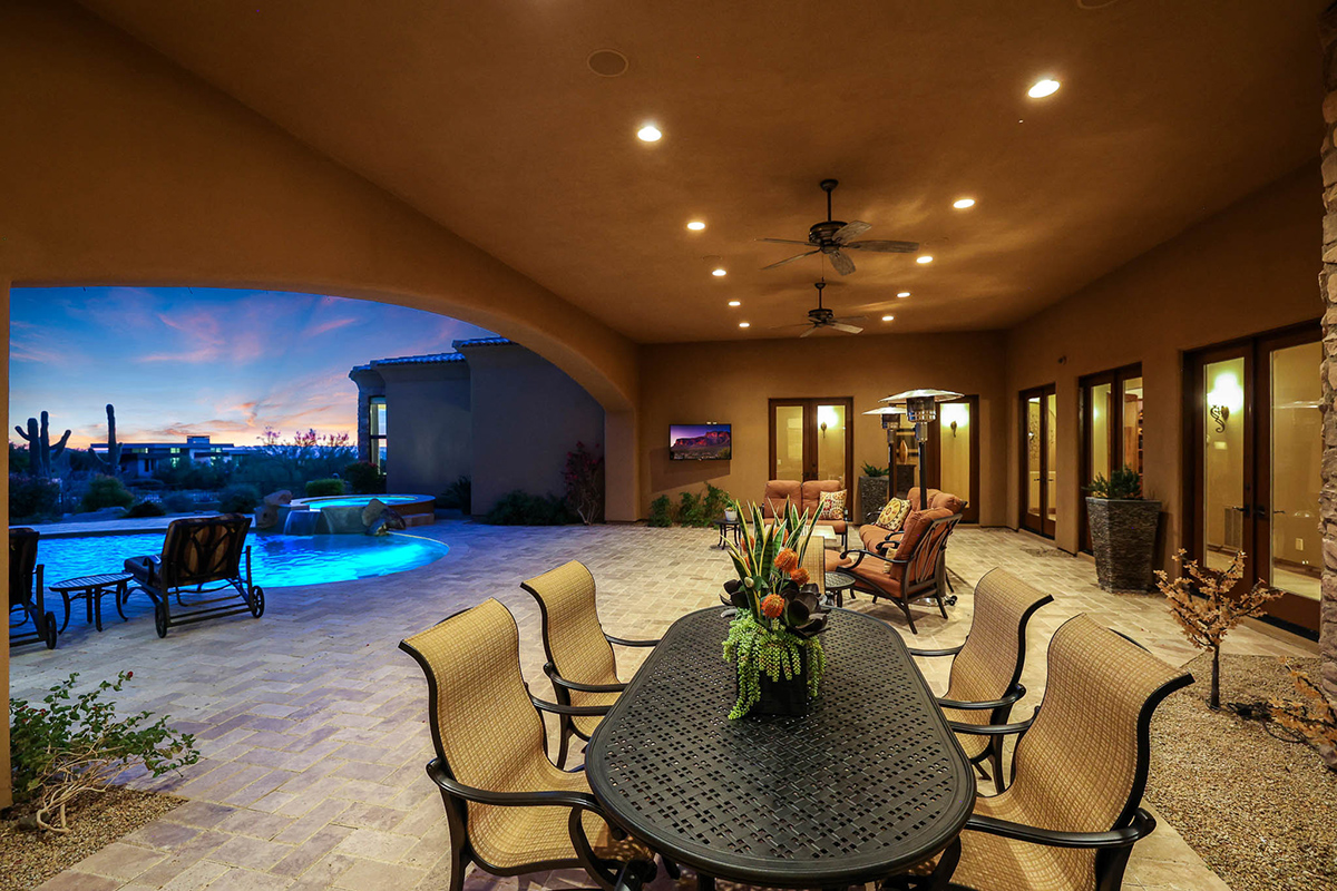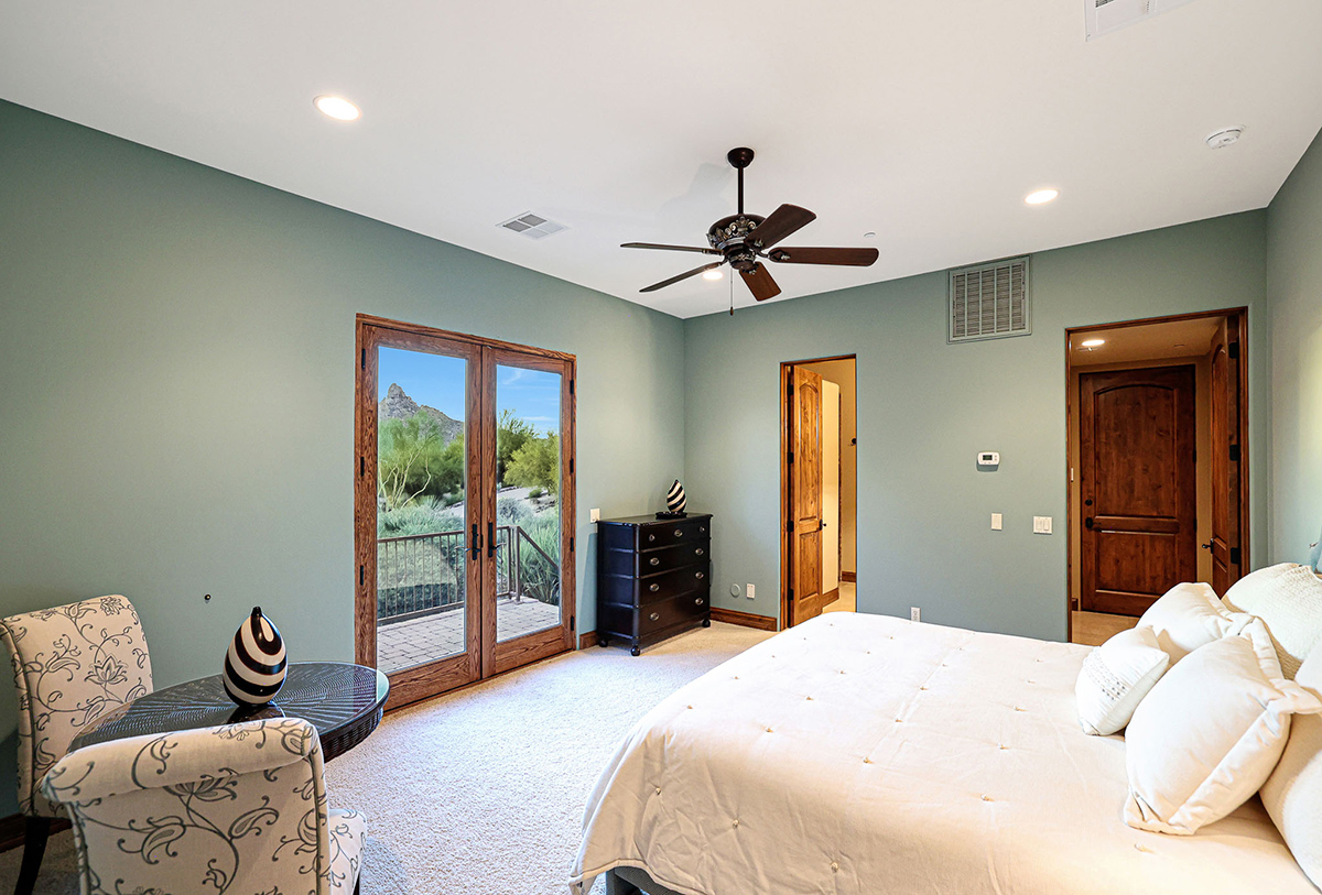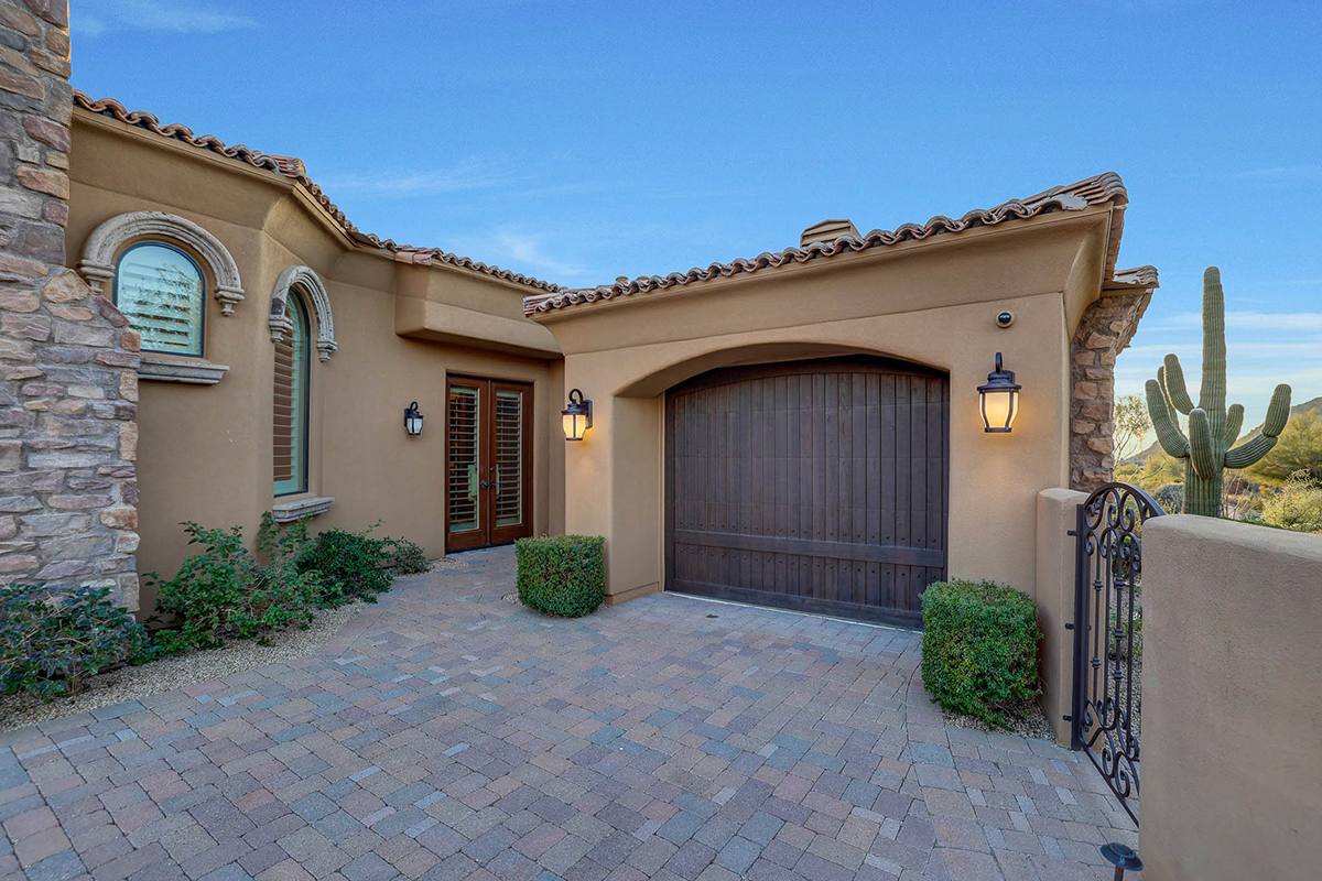 Boasting a thoughtfully designed floor plan spanning 5,821 square feet, this residence features five bedrooms, four and a half bathrooms, a private office, formal living and dining rooms, and a kitchen/family great room. With three laundry rooms and a four-car garage equipped with a mini-split for climate control in the three-bay side, convenience is seamlessly woven into the fabric of daily life. An attached guest house with a separate entry, its own garage, and up-close views of Pinnacle Peak is perfect for long-term guests or serving as mother-in-law quarters.