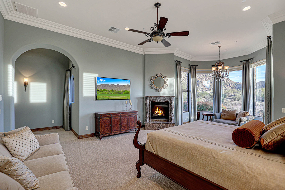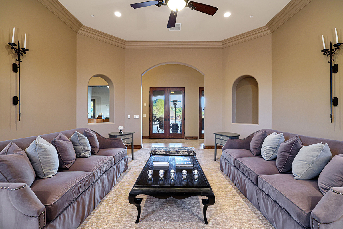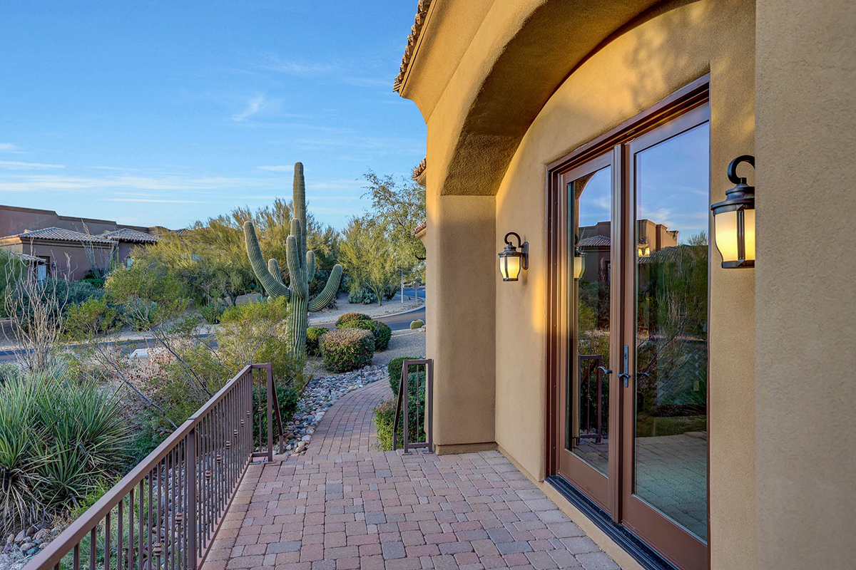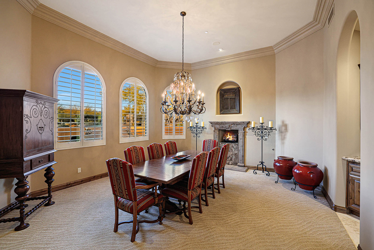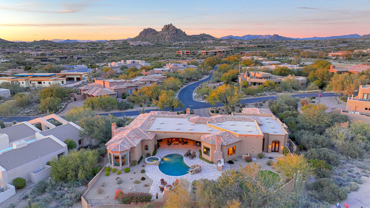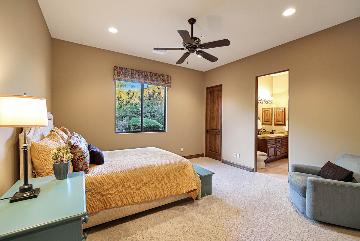 Boasting a thoughtfully designed floor plan spanning 5,821 square feet, this residence features five bedrooms, four and a half bathrooms, a private office, formal living and dining rooms, and a kitchen/family great room. With three laundry rooms and a four-car garage equipped with a mini-split for climate control in the three-bay side, convenience is seamlessly woven into the fabric of daily life. An attached guest house with a separate entry, its own garage, and up-close views of Pinnacle Peak is perfect for long-term guests or serving as mother-in-law quarters.
