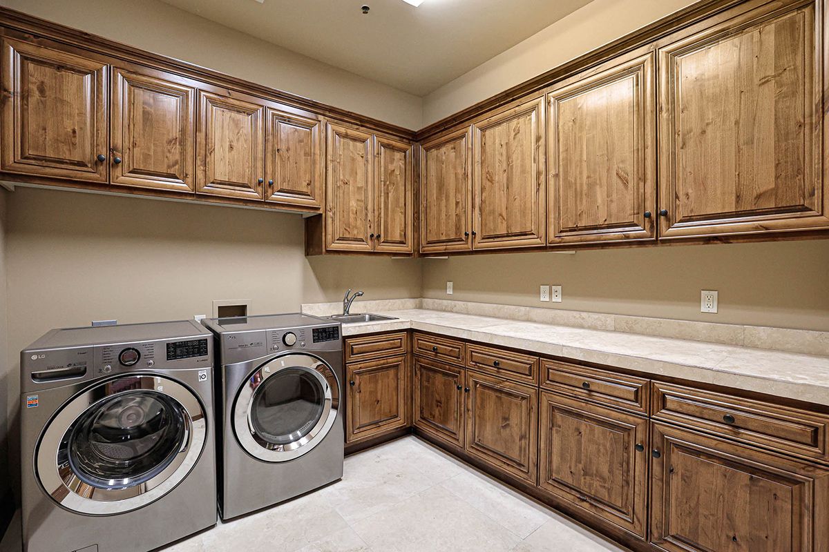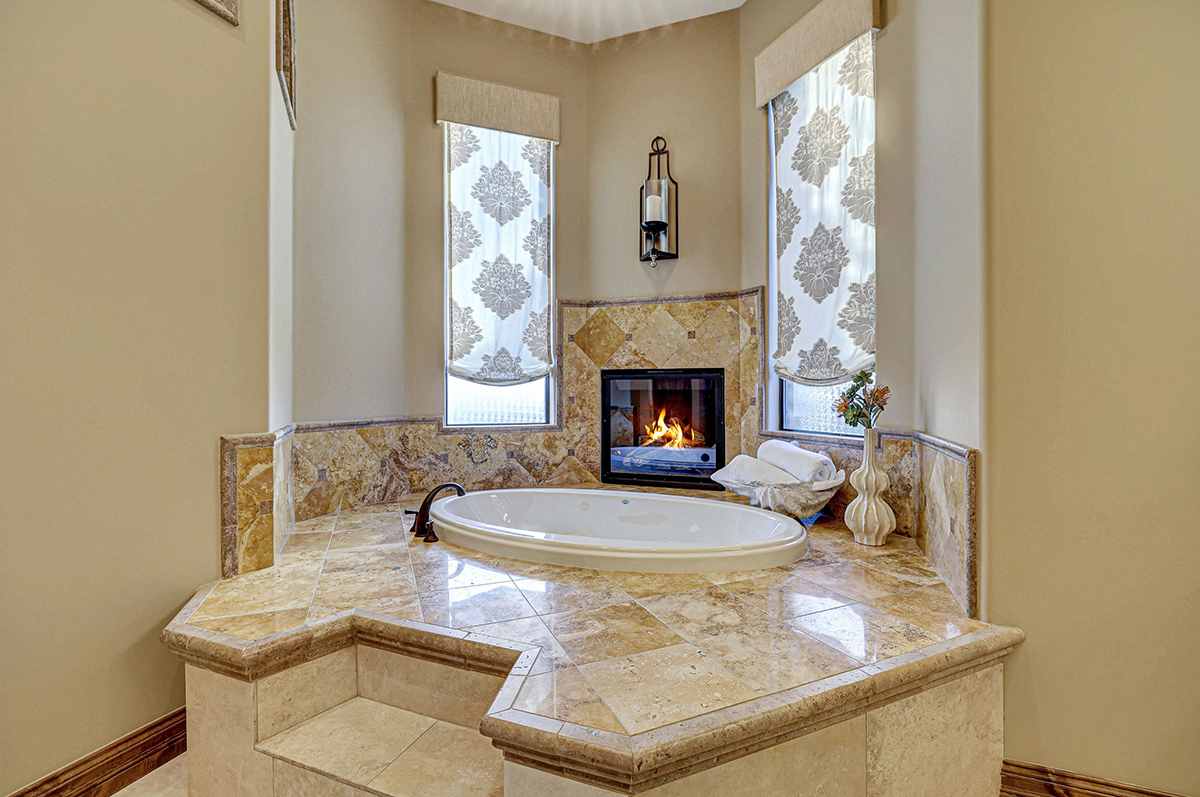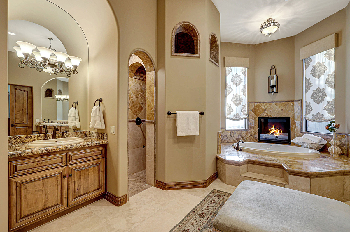 The primary suite is a sanctuary of indulgence, featuring a bedroom with a fireplace, a sitting area, and a spa-like bath with a raised jetted soaking tub adorned with its own fireplace. The expansive walk-in closet is fitted with a custom organizational system, and an attached laundry hook-up station with sink which enhances convenience.