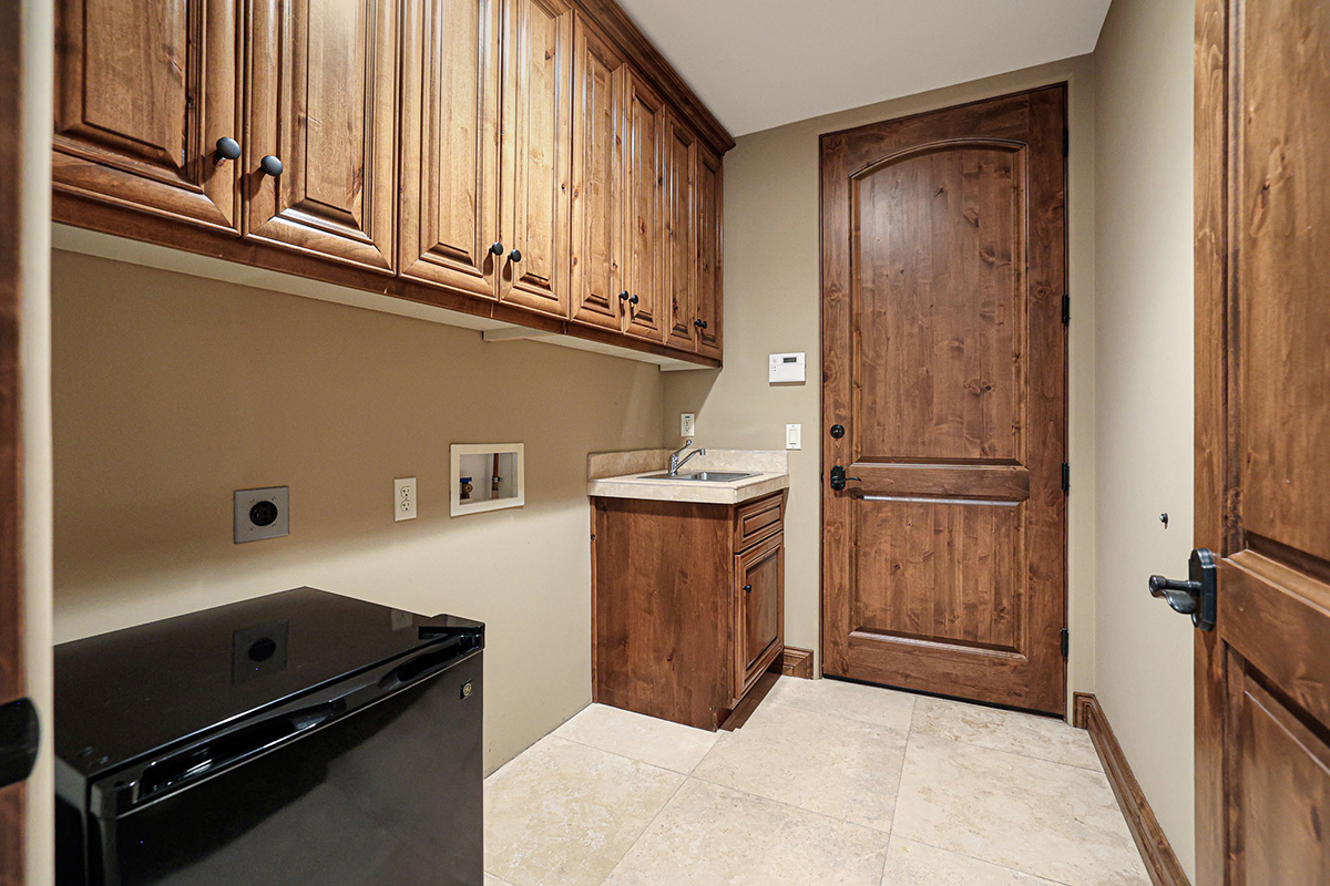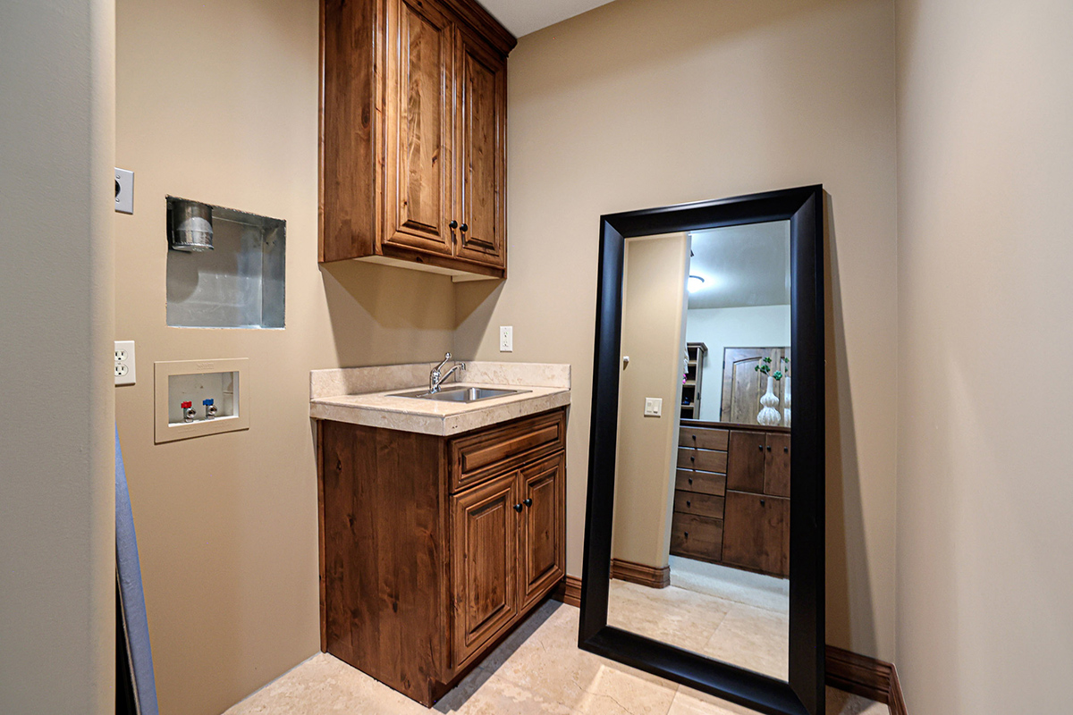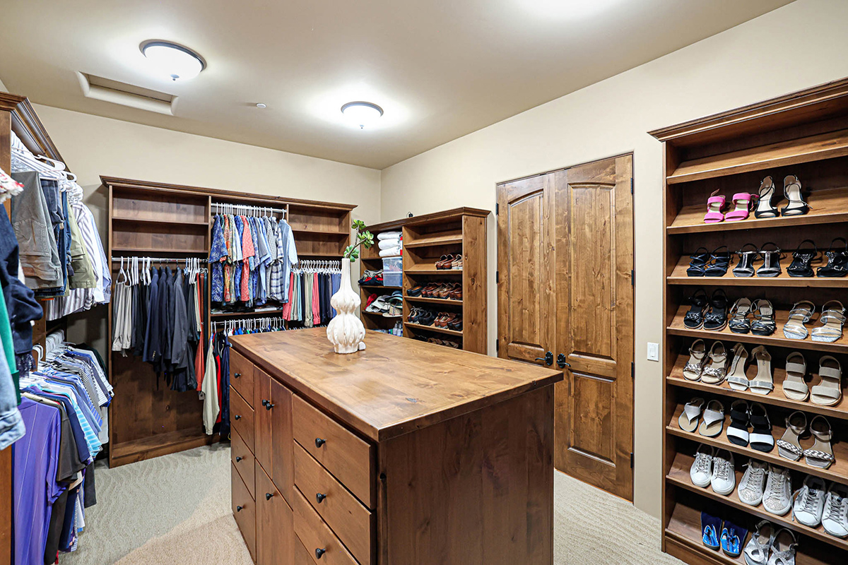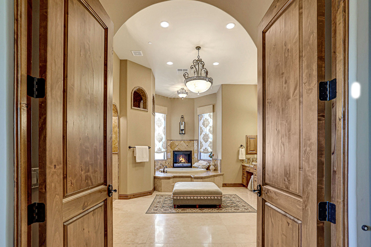 The primary suite is a sanctuary of indulgence, featuring a bedroom with a fireplace, a sitting area, and a spa-like bath with a raised jetted soaking tub adorned with its own fireplace. The expansive walk-in closet is fitted with a custom organizational system, and an attached laundry hook-up station with sink which enhances convenience.