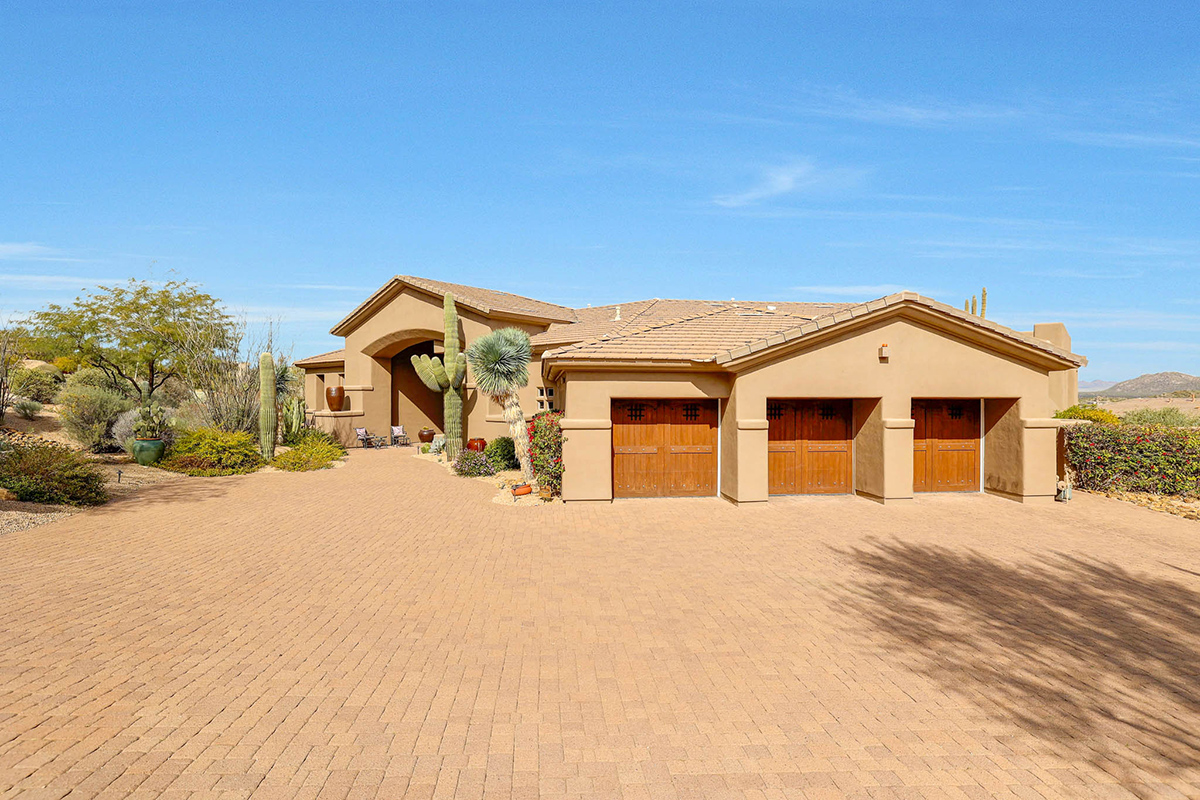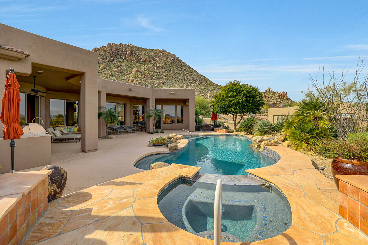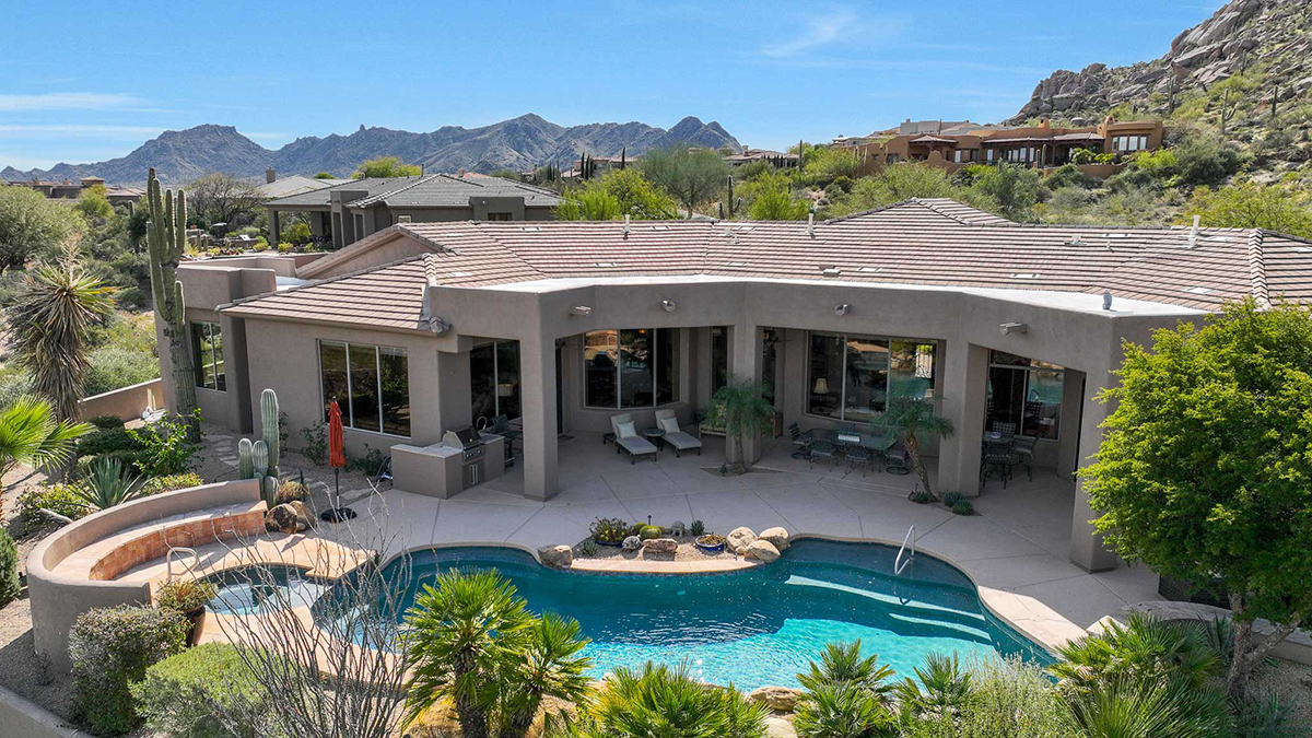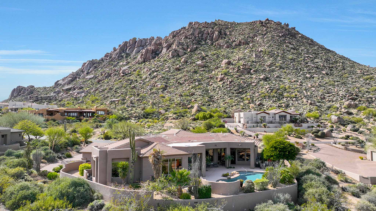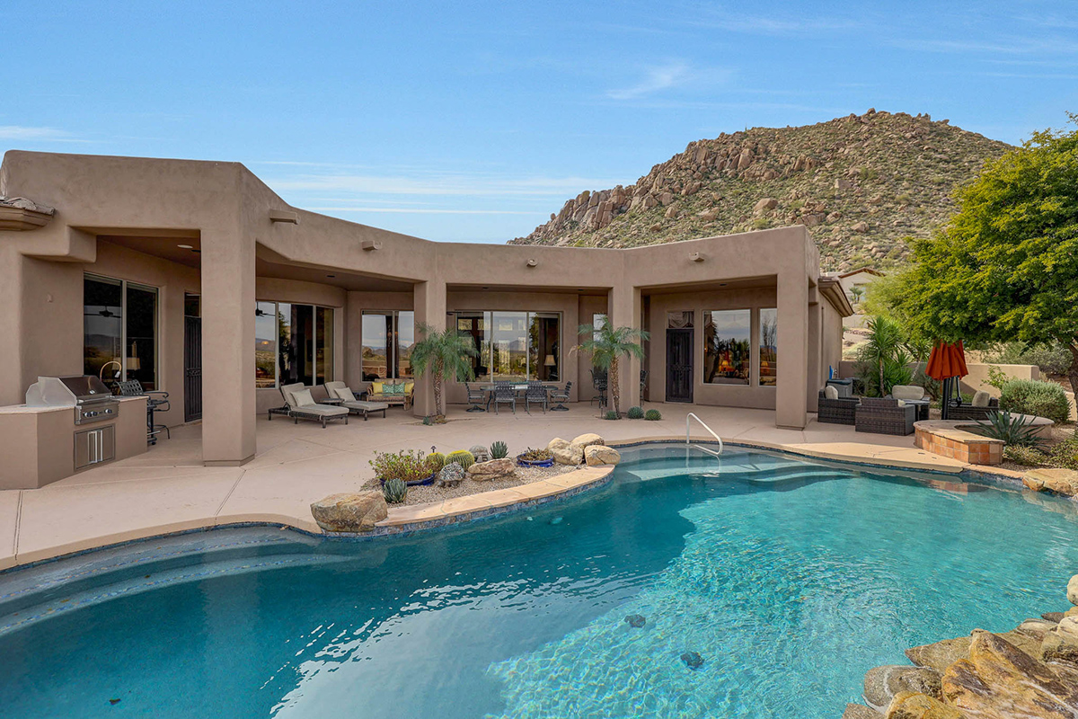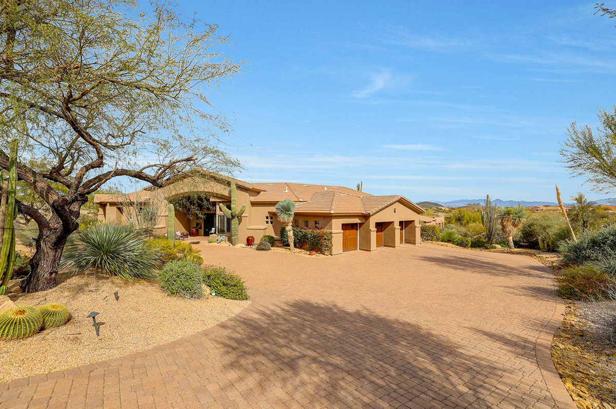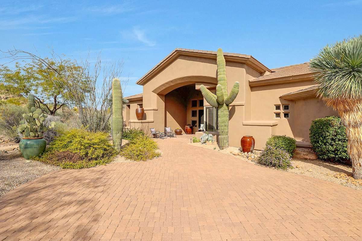 Views, Views, and more Views! Perched majestically on an elevated position within the exclusive guard-gated Troon Village, this exceptional residence offers an unparalleled visual feast, showcasing breathtaking views that span from up-close boulders and Troon Mountain to the distant beauty of Four Peaks—all seamlessly unobstructed. The home features four bedrooms, all ensuite, a powder bath for guests, a three car garage, and 4,602 square feet of living space.