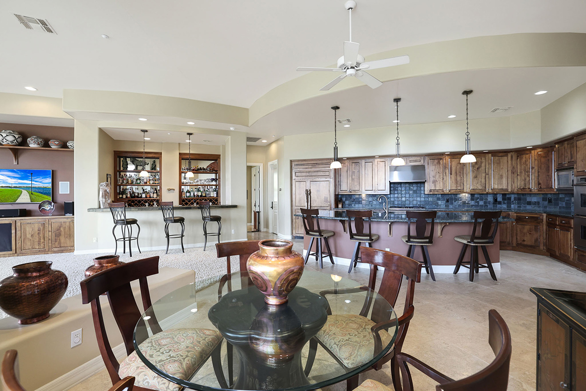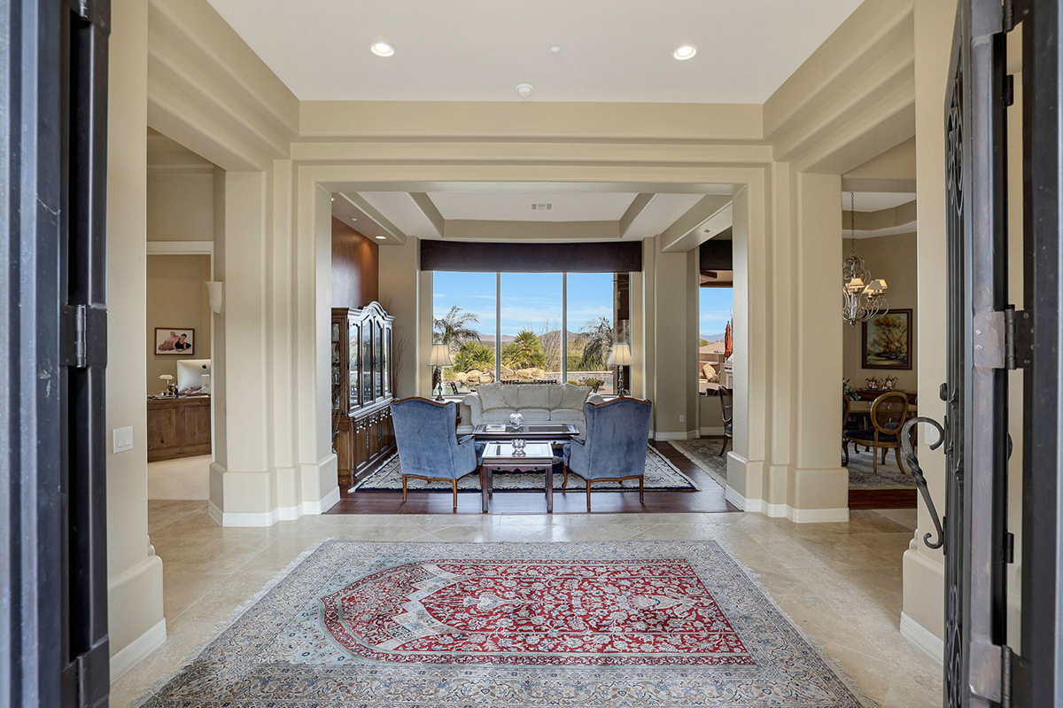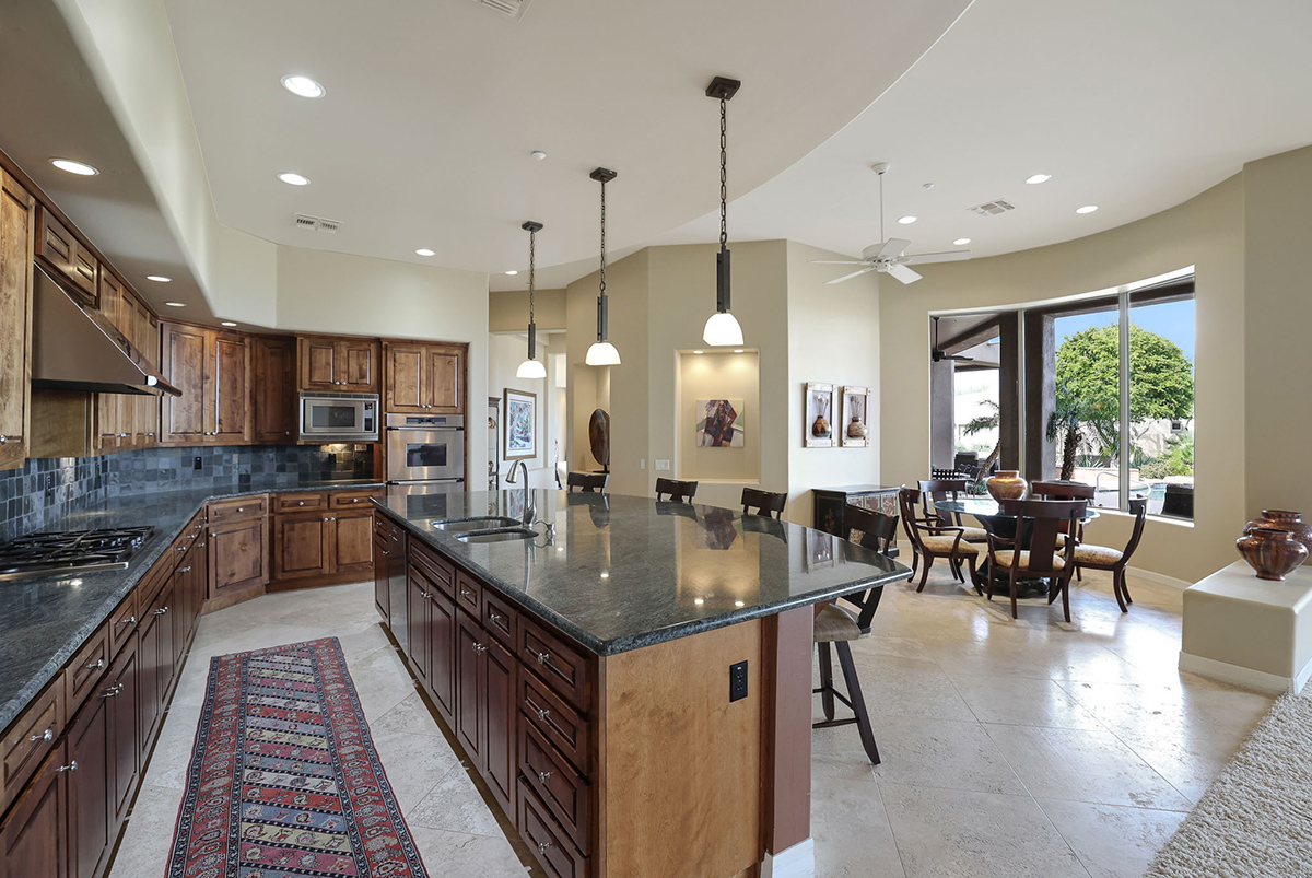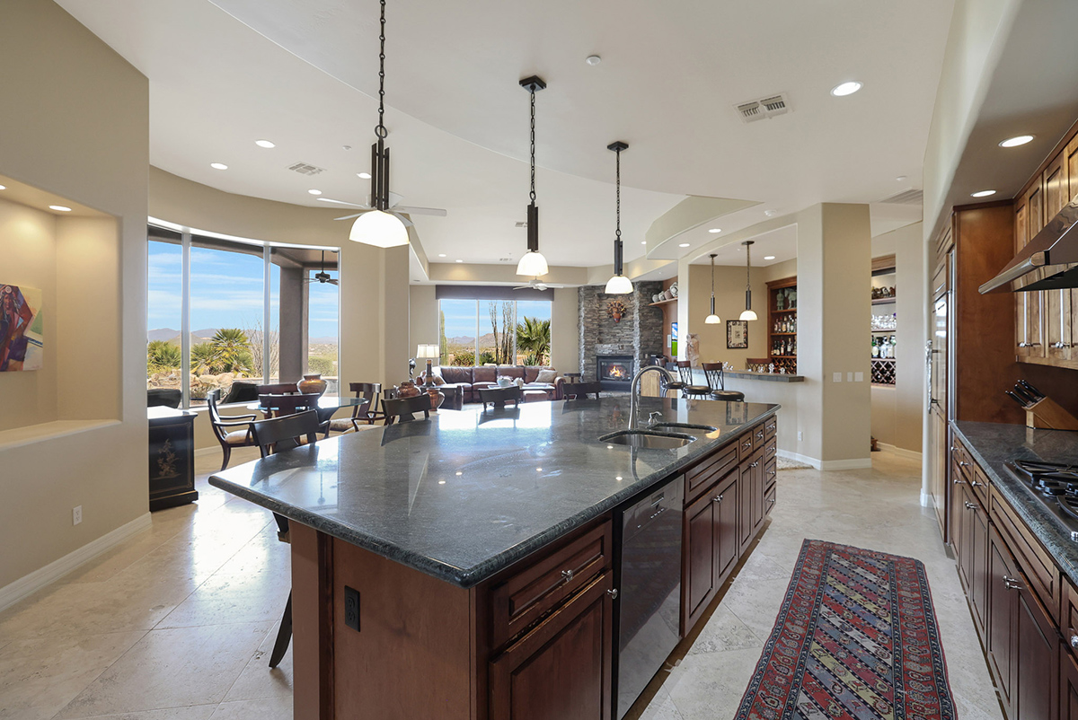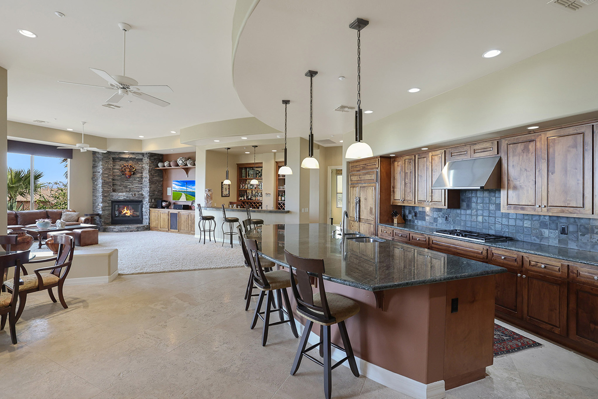 A testament to thoughtful design, the home is strategically oriented to maximize these awe-inspiring views, creating an atmosphere of tranquility and natural beauty. The interior boasts flowing living spaces that are both light-filled and spacious, characterized by high ceilings and expansive windows that capture the essence of the surrounding landscape. The heart of the home is an entertainer’s dream, with an open kitchen and family room that form a central hub for social gatherings.