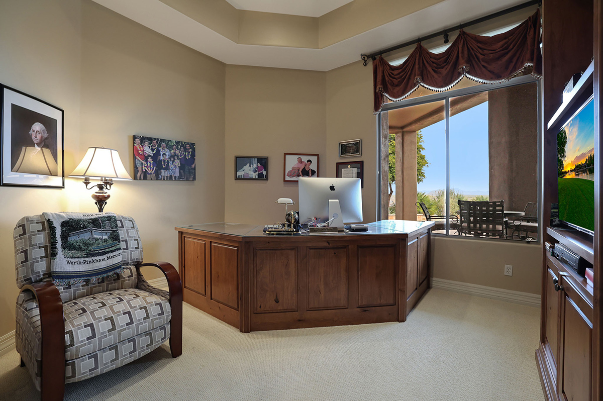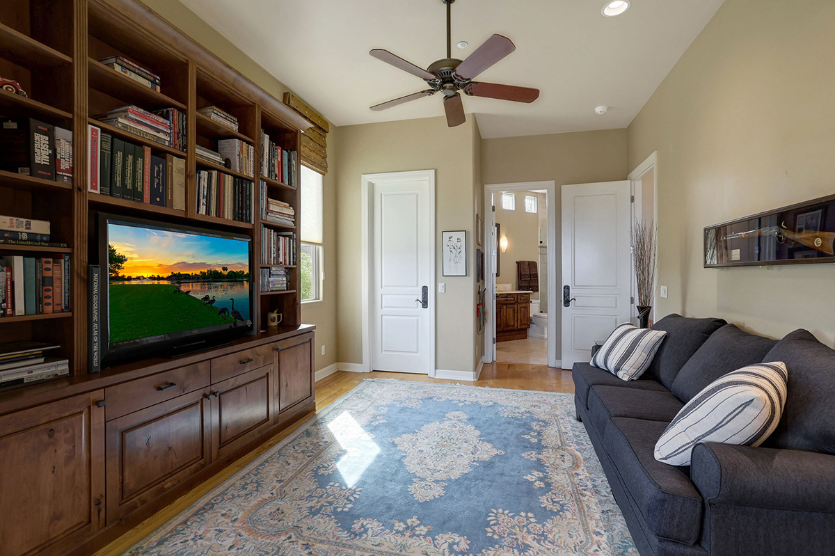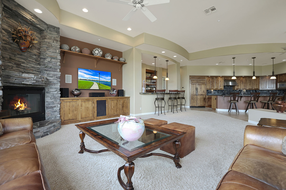 The kitchen features stainless steel appliances, a hooded gas range, a generous island with a breakfast bar, a dedicated dining area, and a full bar equipped with a wine cooler, fridge, and additional seating at the bar. A stacked stone fireplace and built-in entertainment sideboard add warmth and sophistication to the space. For those seeking additional entertaining or relaxation spaces, the formal living and dining rooms provide an elegant retreat. The primary suite and office (with built-in bookshelves) are thoughtfully situated, separated from the secondary bedrooms to ensure privacy and a sense of retreat.