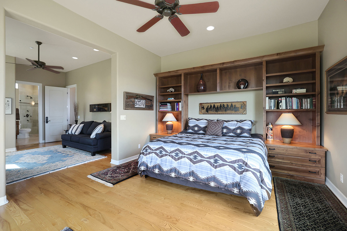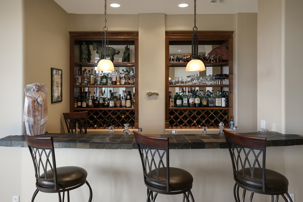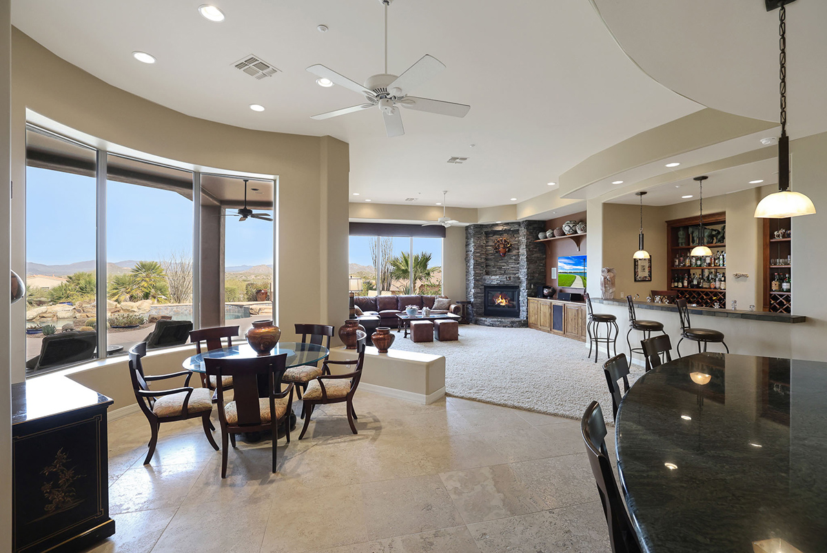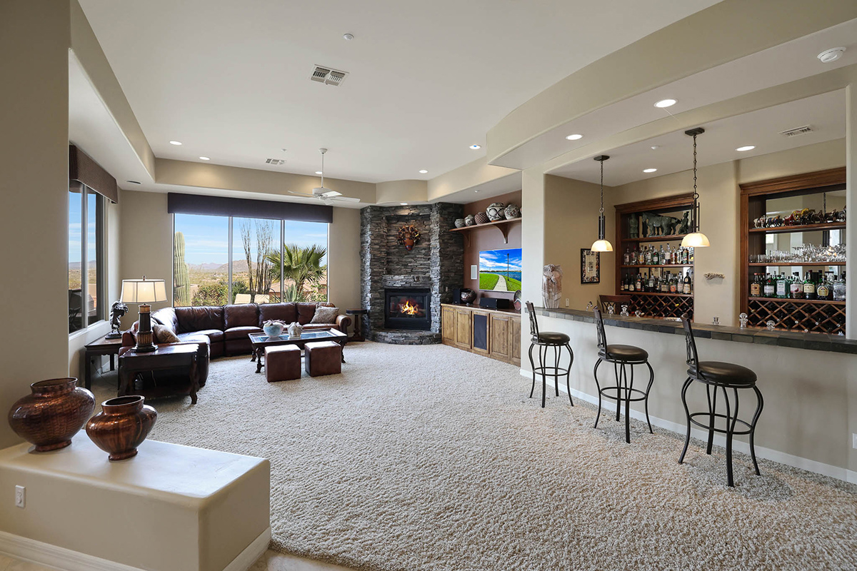 The kitchen features stainless steel appliances, a hooded gas range, a generous island with a breakfast bar, a dedicated dining area, and a full bar equipped with a wine cooler, fridge, and additional seating at the bar. A stacked stone fireplace and built-in entertainment sideboard add warmth and sophistication to the space. For those seeking additional entertaining or relaxation spaces, the formal living and dining rooms provide an elegant retreat. The primary suite and office (with built-in bookshelves) are thoughtfully situated, separated from the secondary bedrooms to ensure privacy and a sense of retreat.