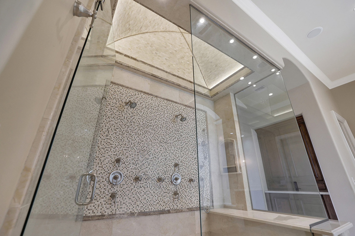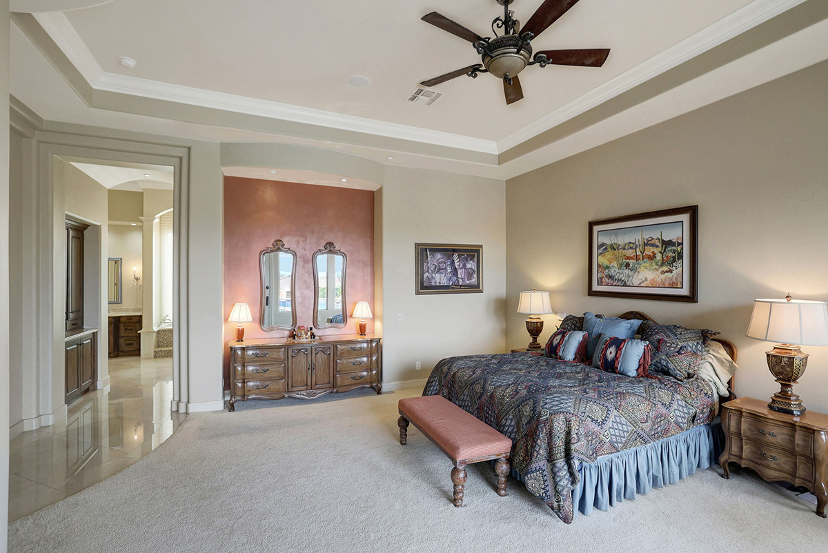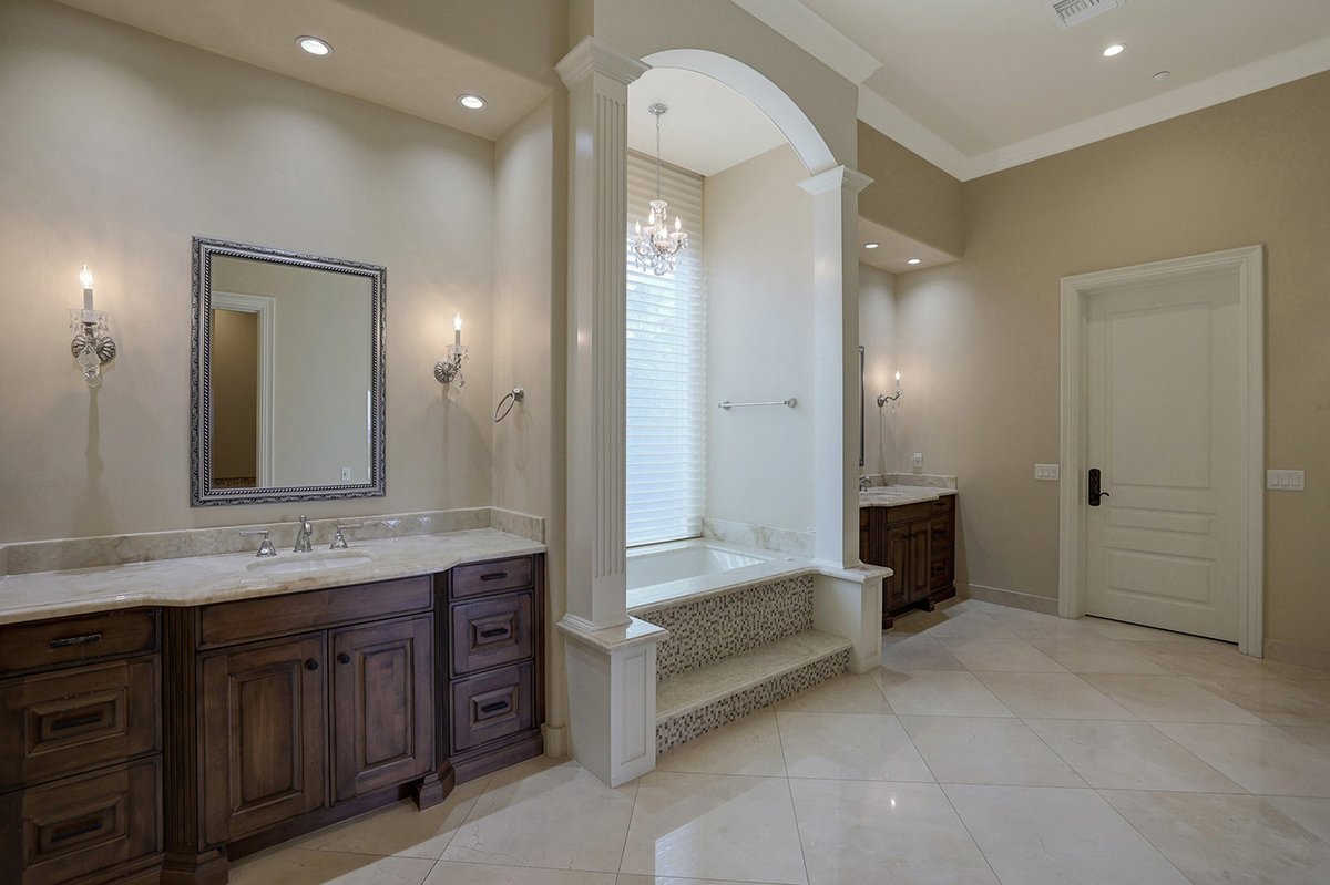 The primary suite has a stunning oversized shower with detailed tile work and a coved ceiling, large soaking tub, split vanities, and walk-in closet. The Junior Primary suite is on the opposite wing, and has a sitting room, bedroom, and bathroom perfect for an in-law quarters or long-term guest. A three car garage and full sized laundry room with extra sink and beverage fridge complete the spaces.