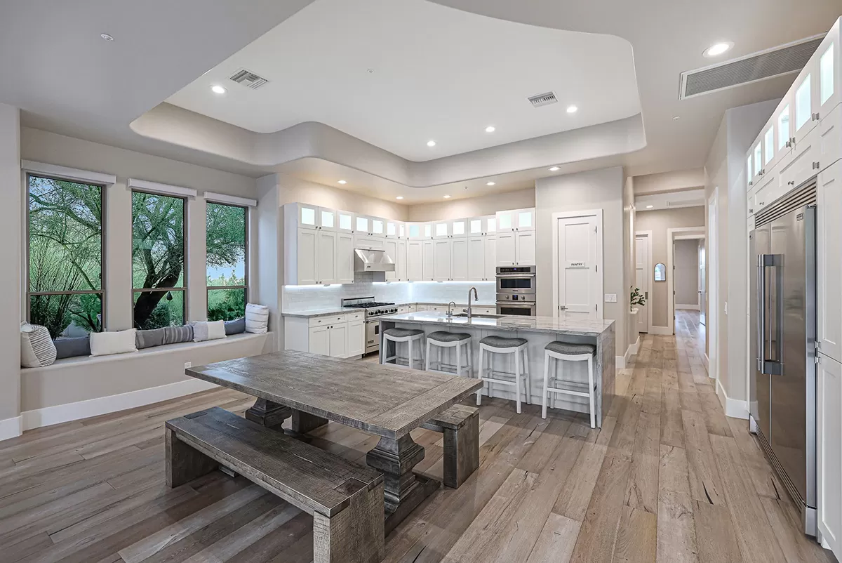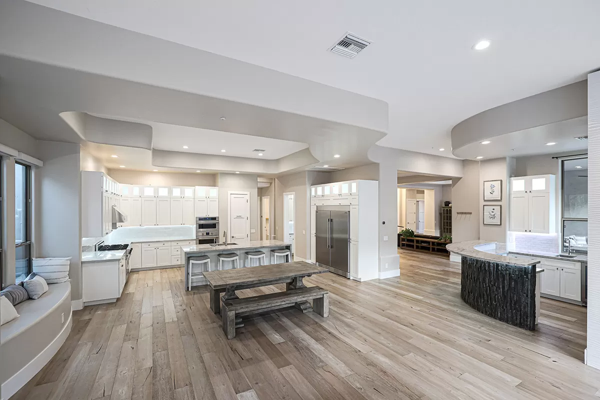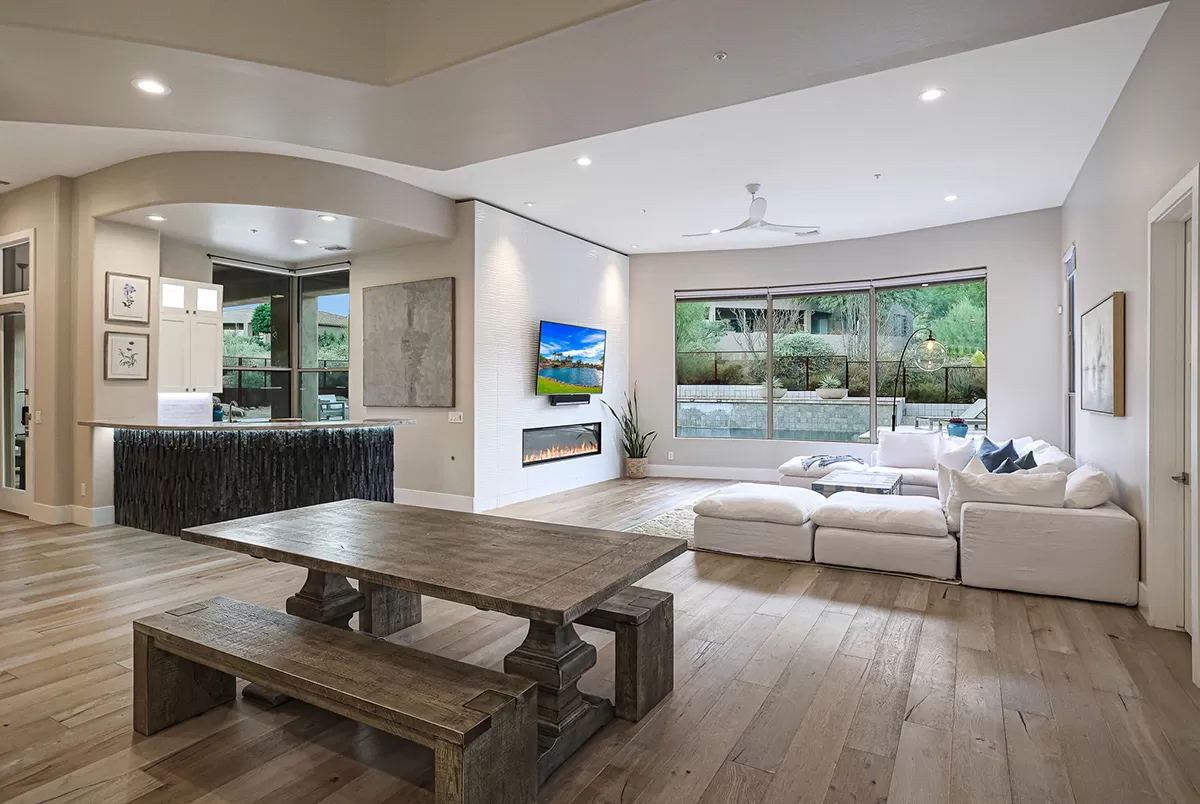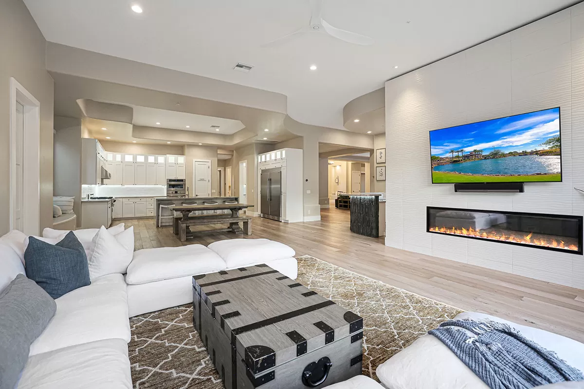 The kitchen features modern cabinetry include display tops, stainless steel appliances, butler’s pantry, gas stove, stone counters, tile backsplash, center island with seating, and secondary dining seating area with built-in window bench. The family room is open to the kitchen and has a modern electric fireplace with a contemporary tile wall surround, access to a bonus room (perfect studio), large picture window with mountain views and a wet bar with seating, prep sink, and beverage fridge.