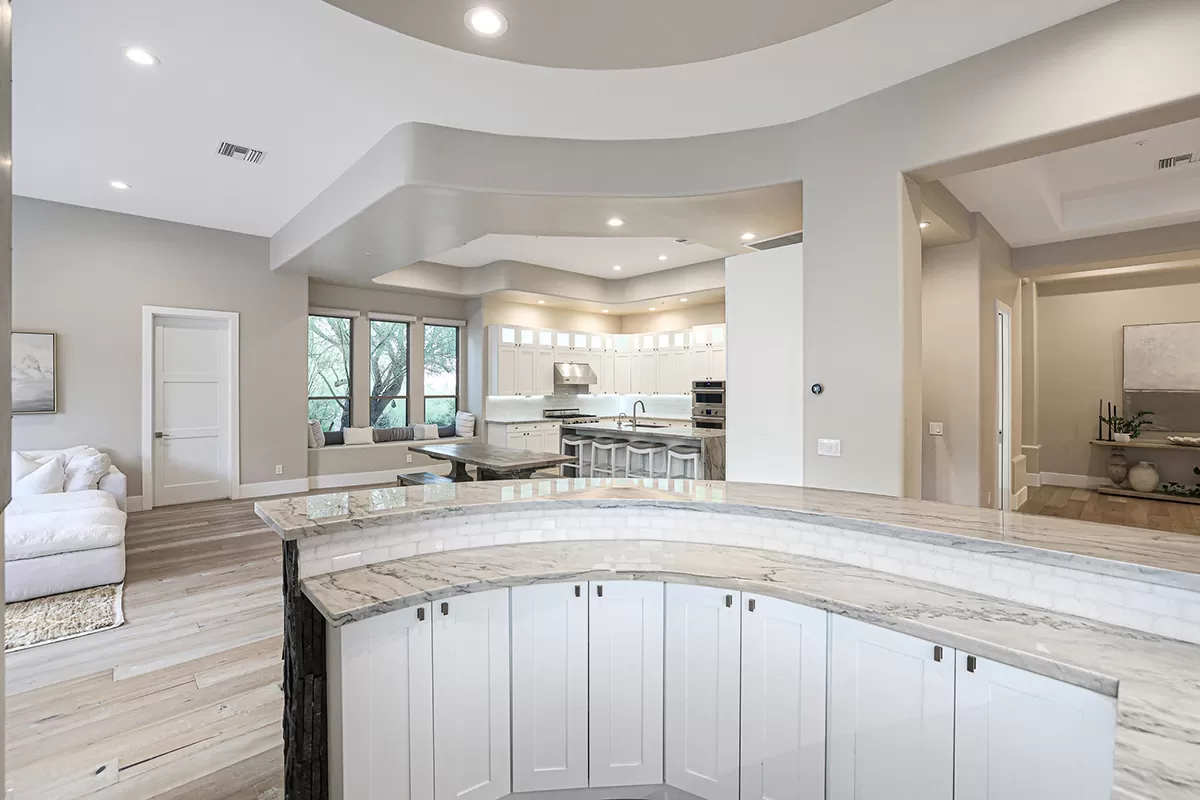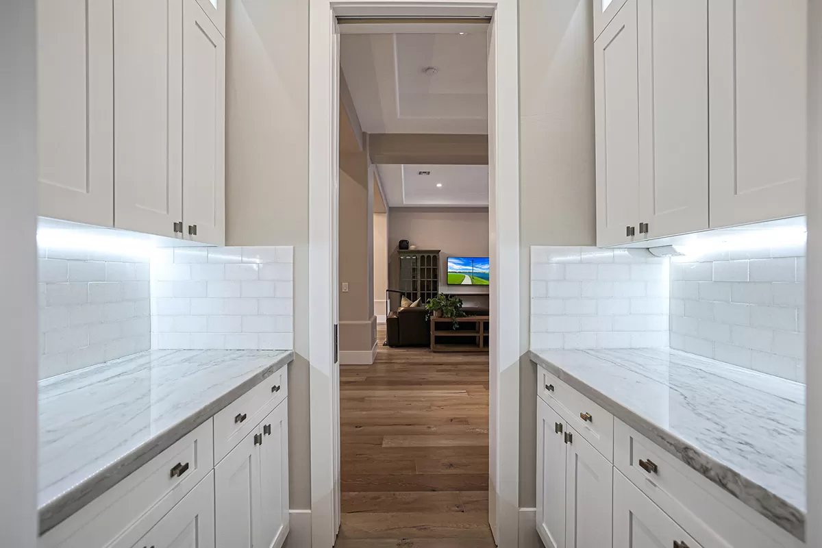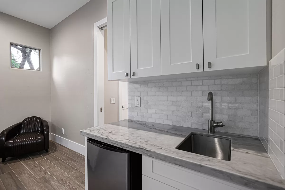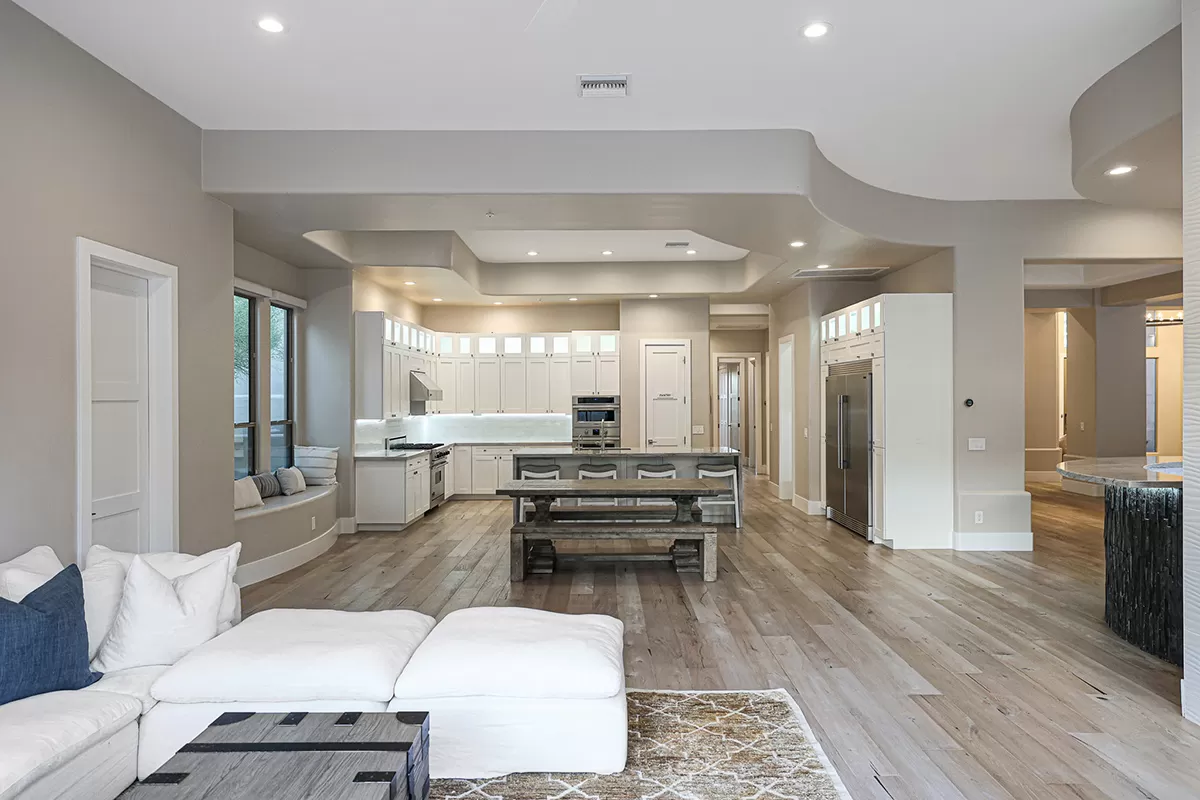 The kitchen features modern cabinetry include display tops, stainless steel appliances, butler’s pantry, gas stove, stone counters, tile backsplash, center island with seating, and secondary dining seating area with built-in window bench. The family room is open to the kitchen and has a modern electric fireplace with a contemporary tile wall surround, access to a bonus room (perfect studio), large picture window with mountain views and a wet bar with seating, prep sink, and beverage fridge.