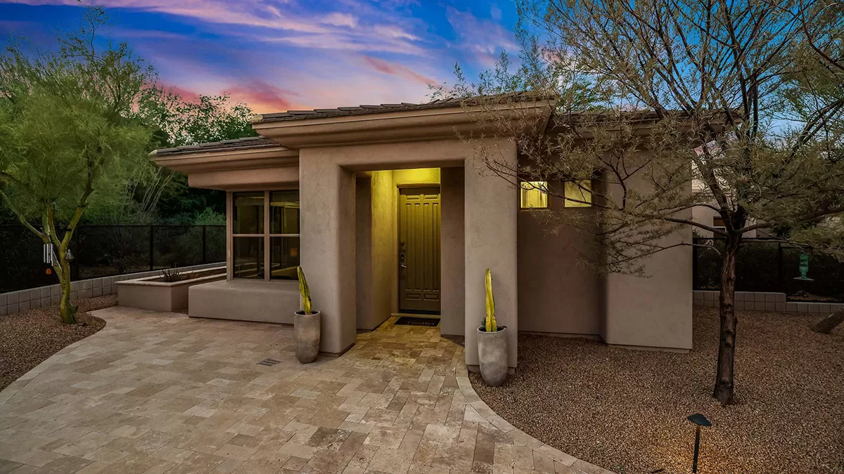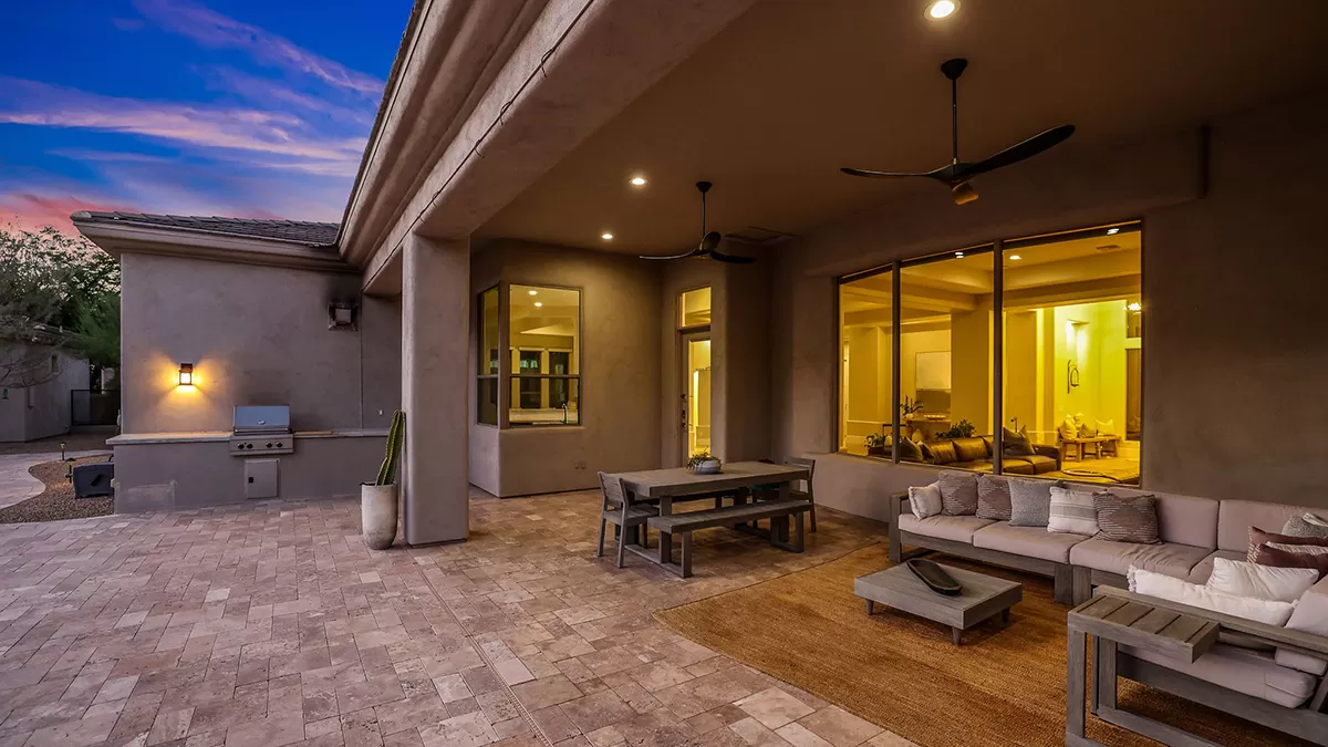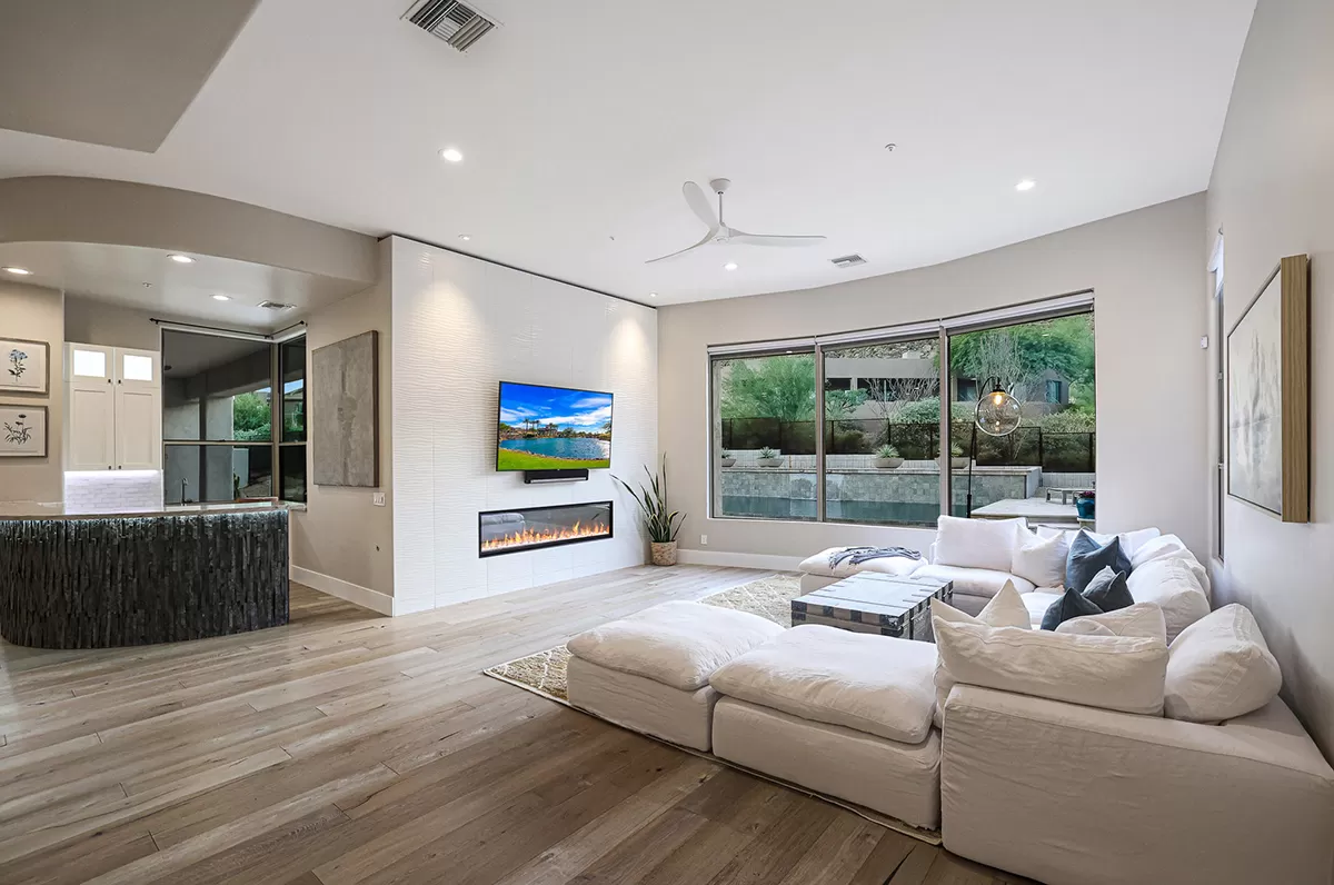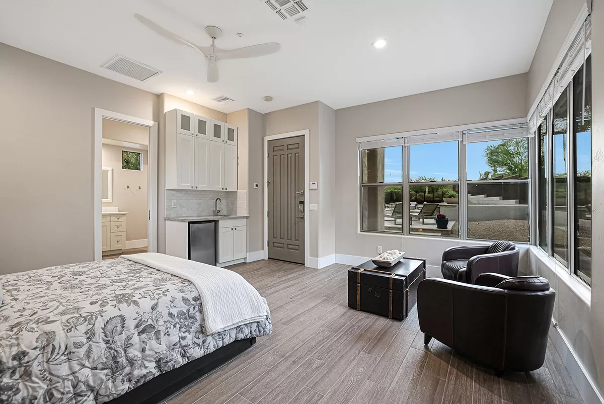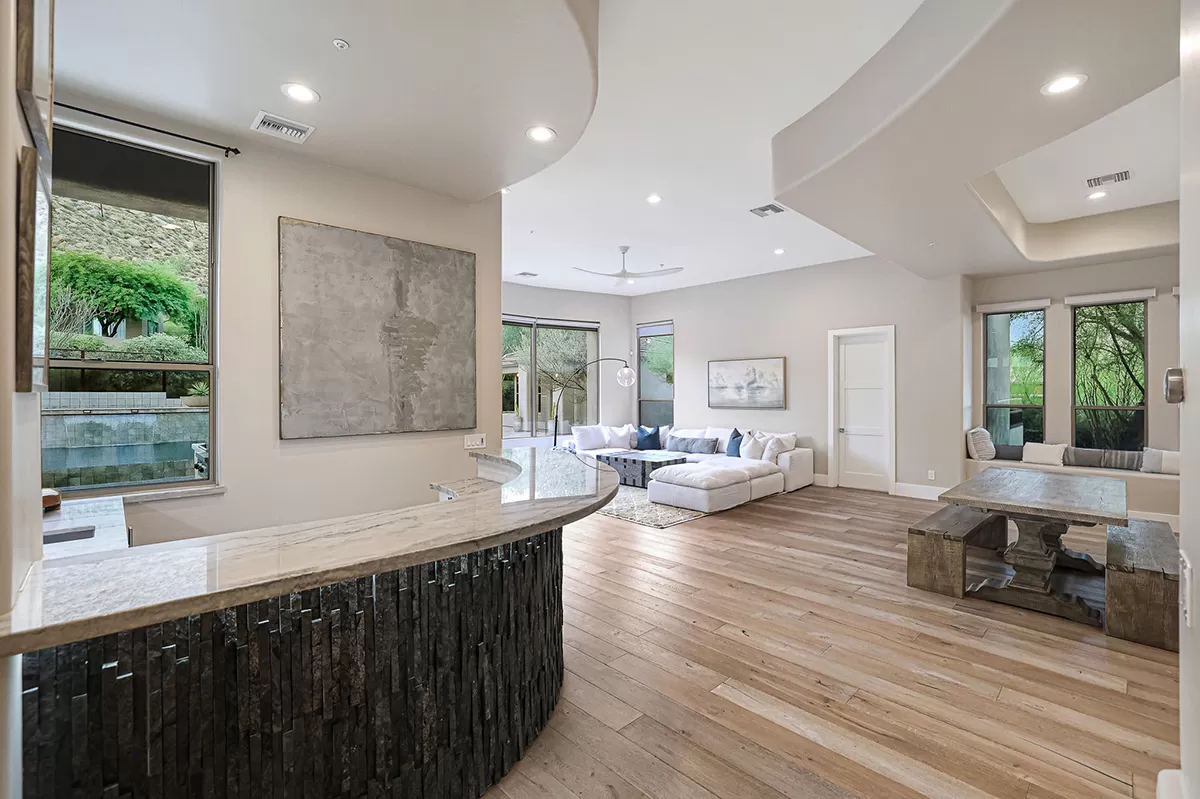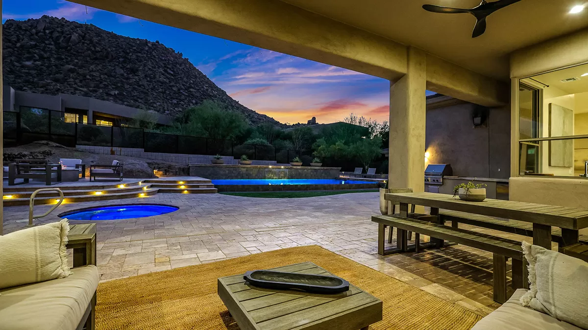 Stunning Windy Walk Estates at Troon Village home has been completely remodeled with on-trend and premium finishes! At over 5,100 square feet, this single level, no interior step home has an open spacious feel. Enjoy up close views to Troon Mountain from the backyard, along with a negative edge pool with spillover and waterfall feature, separate spa, raised patios for lounging, artificial turf, fire pit, built-in barbecue, large covered patio, tumbled travertine hardscape and access to the detached guest house.