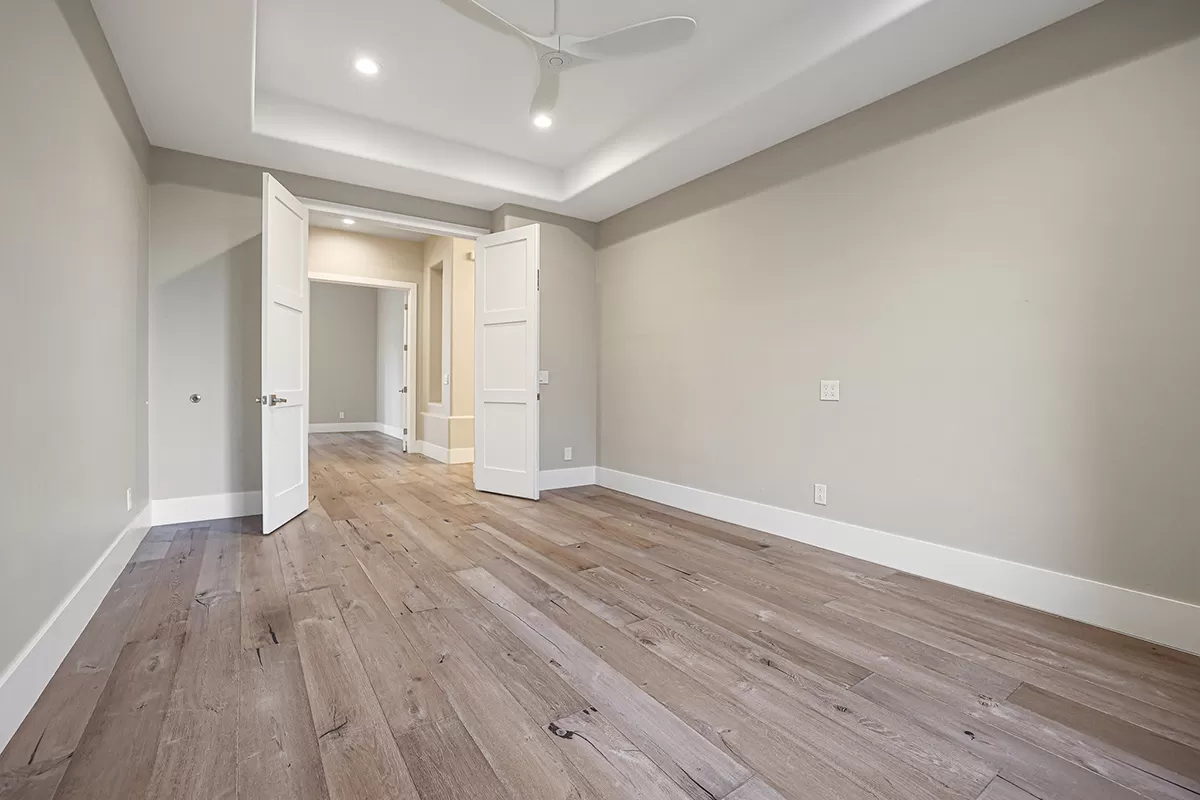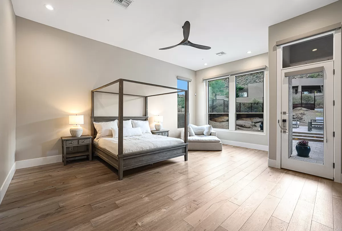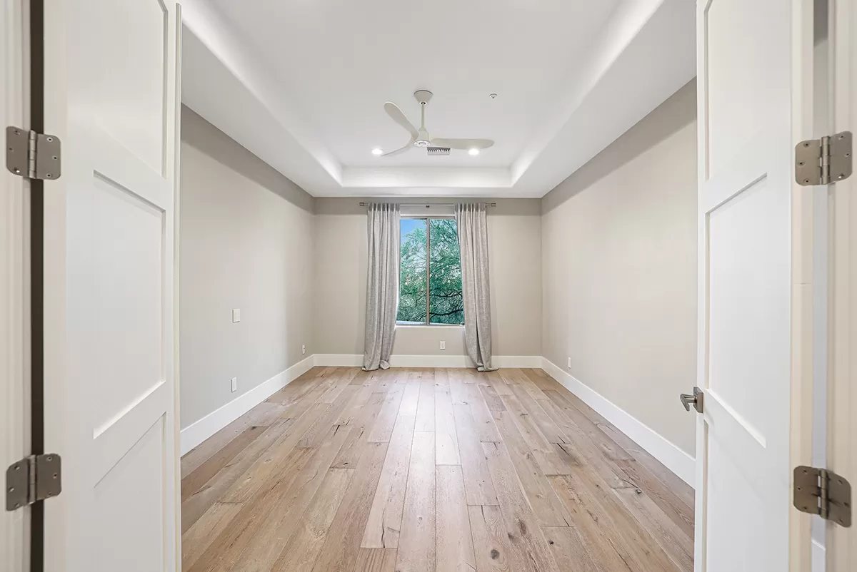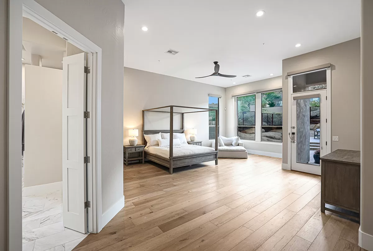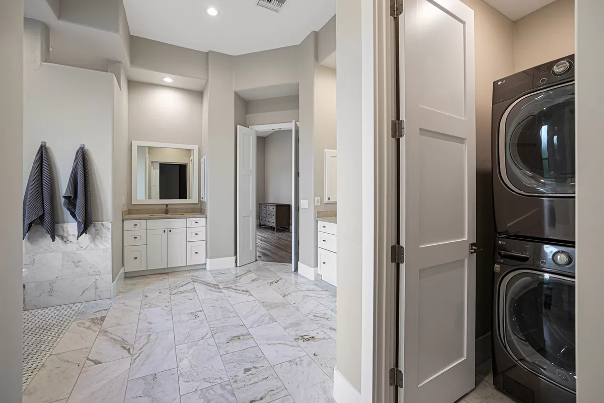 The primary bedroom is split from the two main house ensuite bedrooms and across from the private office or exercise room. The wood flooring in the bedroom (found throughout the home) gives way to the marble finishes in the primary bathroom accenting the large soaking tub, walk-in shower, private water closet, private closet with stackable washer and dryer, and an oversized closet with custom built-ins.