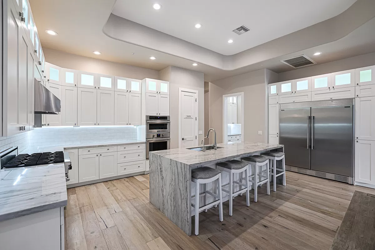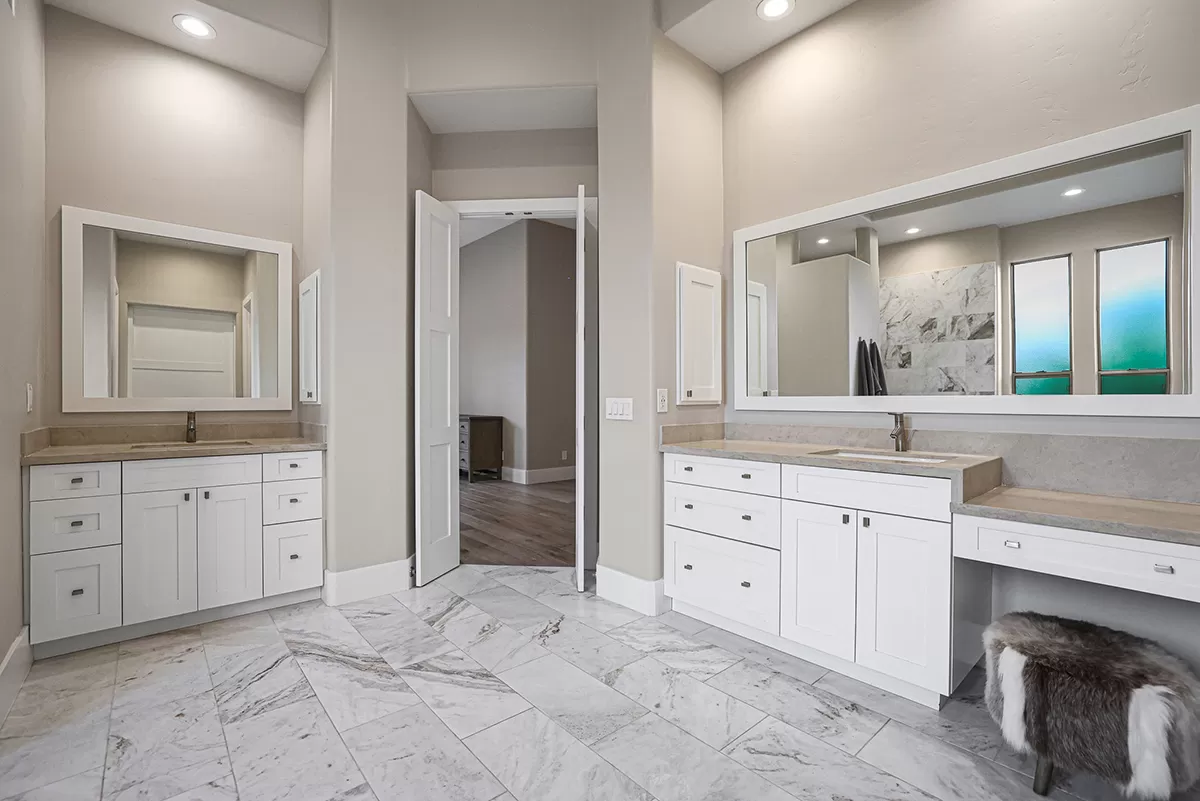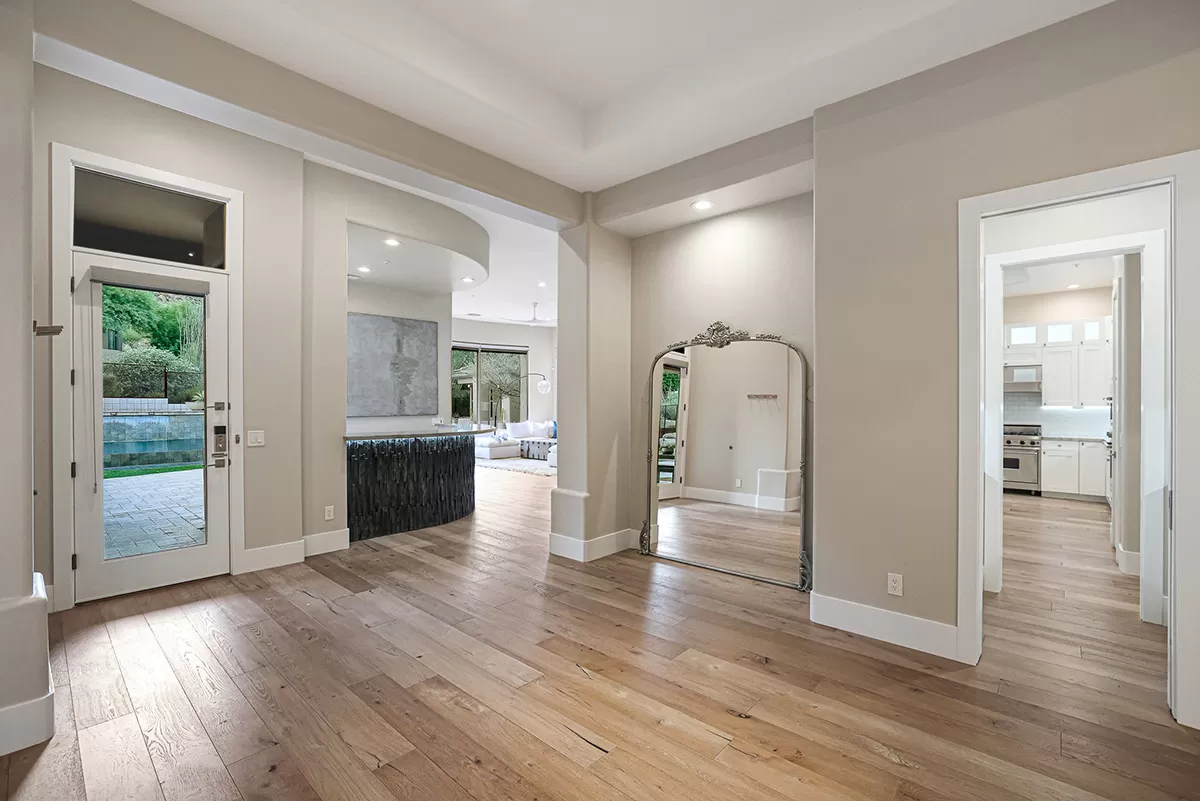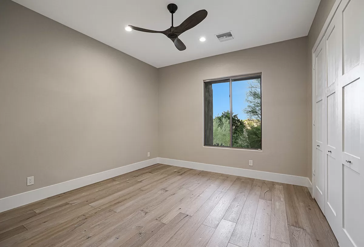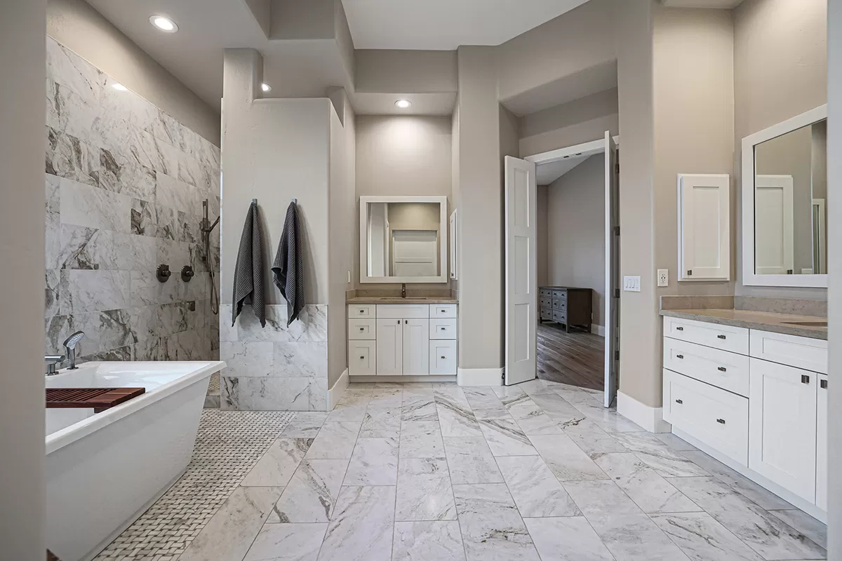 The primary bedroom is split from the two main house ensuite bedrooms and across from the private office or exercise room. The wood flooring in the bedroom (found throughout the home) gives way to the marble finishes in the primary bathroom accenting the large soaking tub, walk-in shower, private water closet, private closet with stackable washer and dryer, and an oversized closet with custom built-ins.