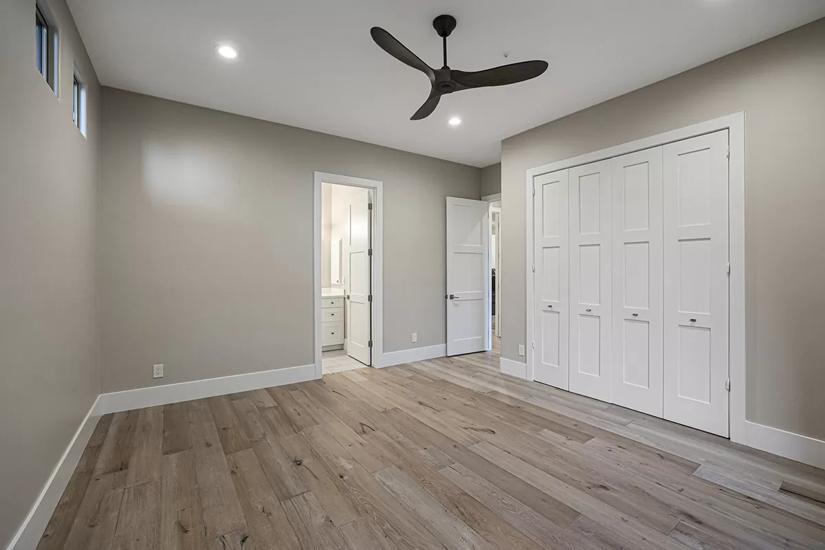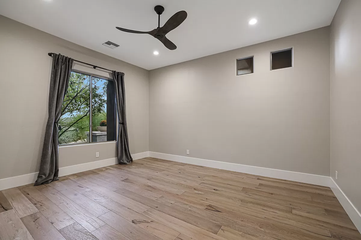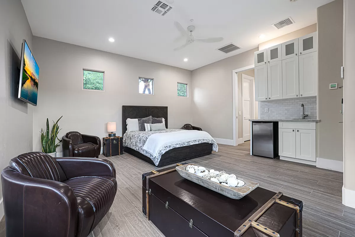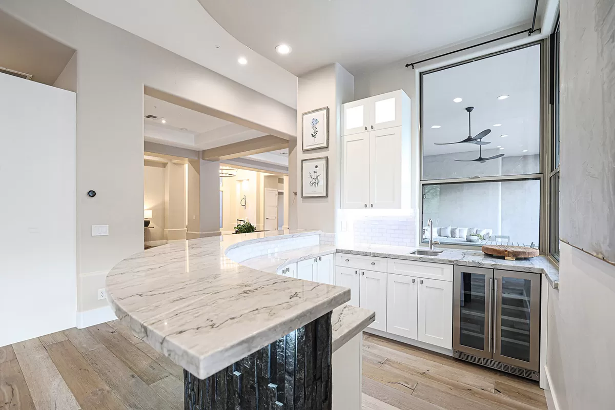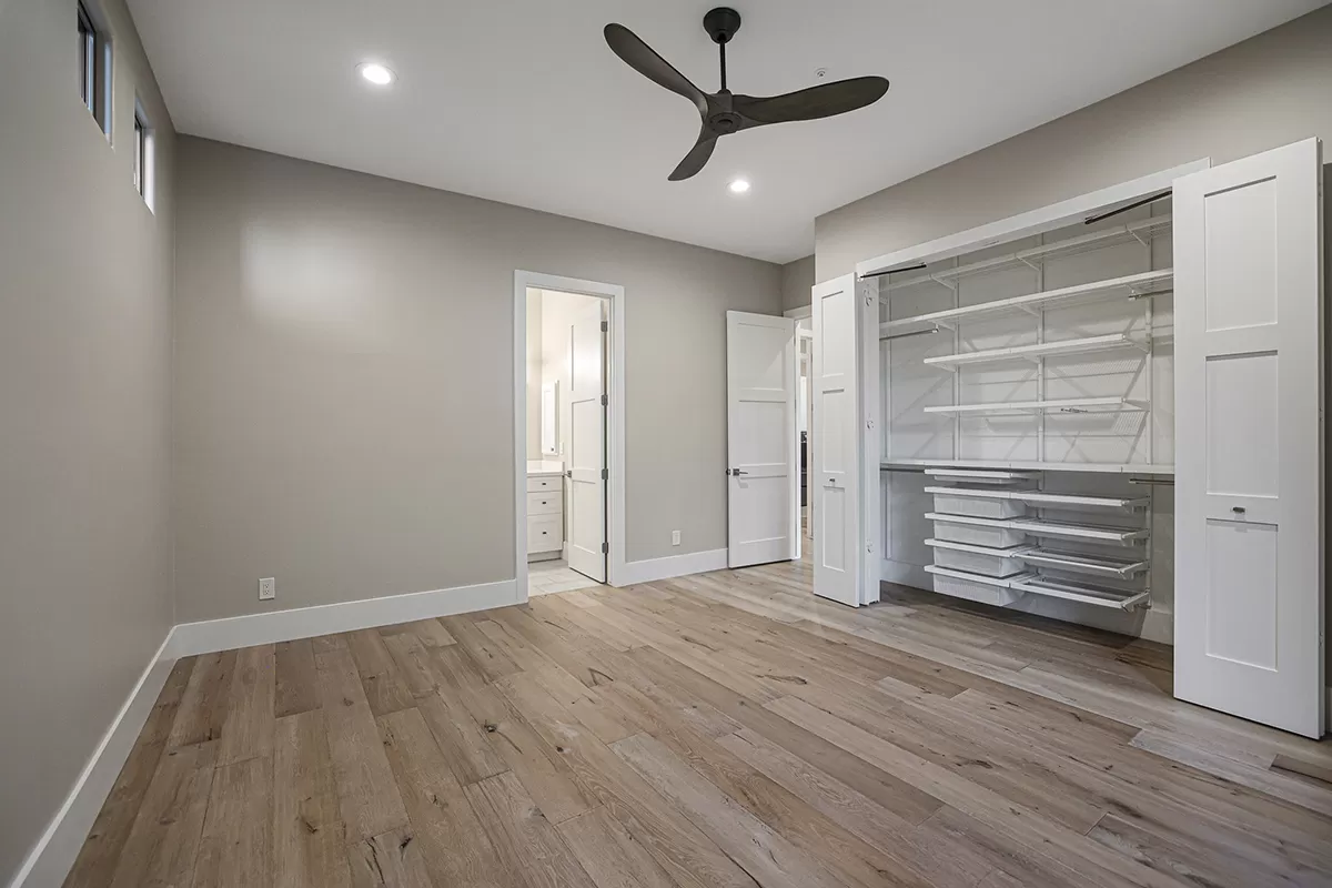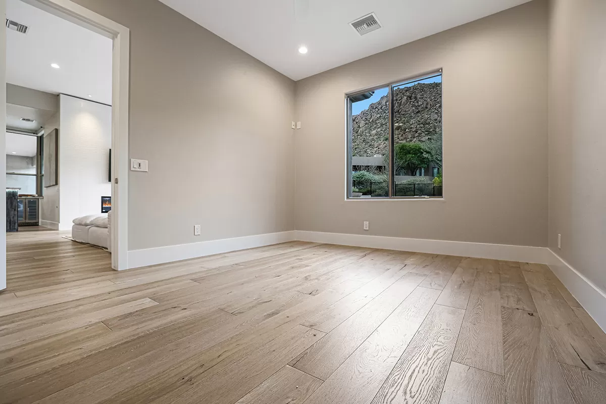 The primary bedroom is split from the two main house ensuite bedrooms and across from the private office or exercise room. The wood flooring in the bedroom (found throughout the home) gives way to the marble finishes in the primary bathroom accenting the large soaking tub, walk-in shower, private water closet, private closet with stackable washer and dryer, and an oversized closet with custom built-ins.
