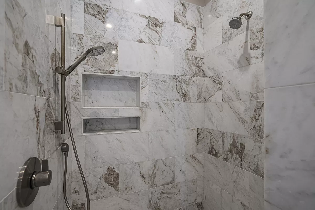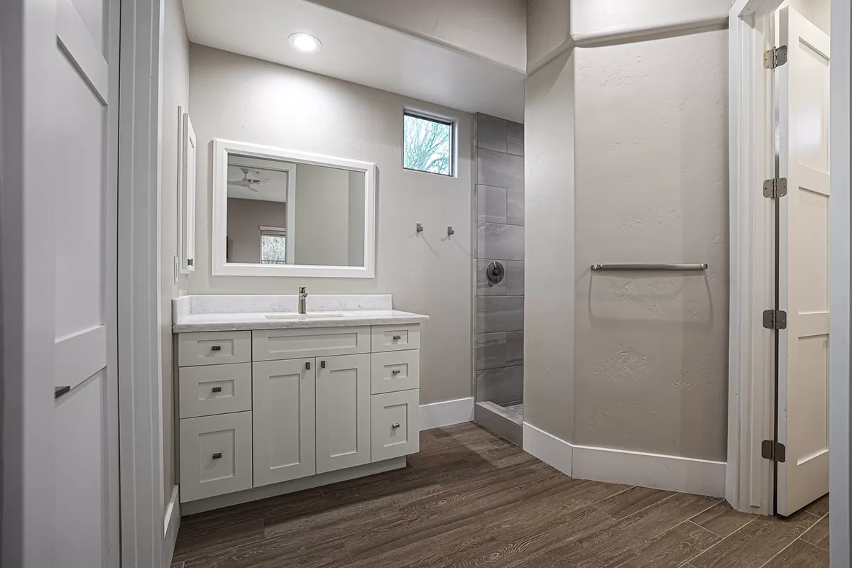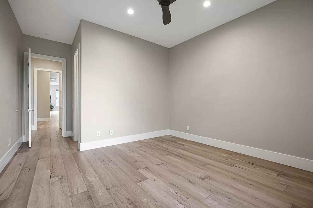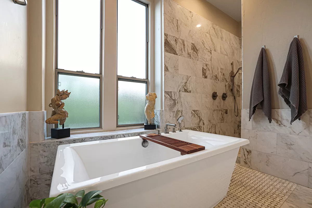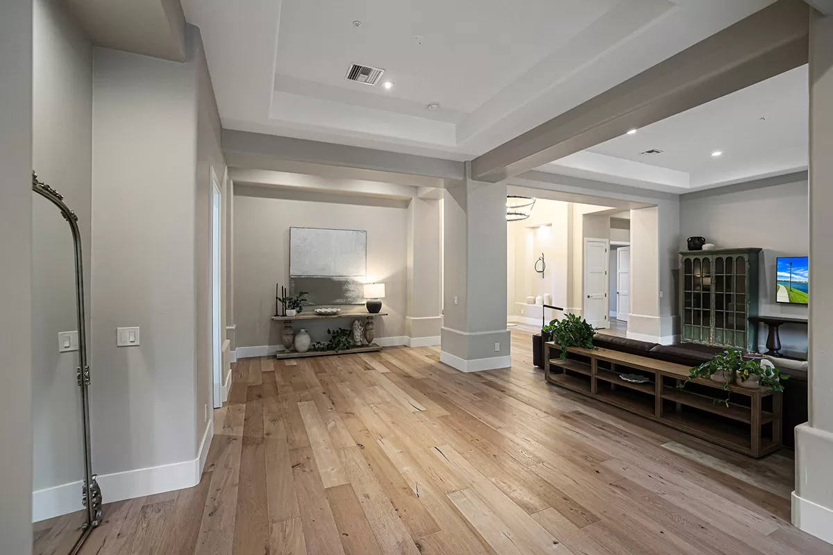 The primary bedroom is split from the two main house ensuite bedrooms and across from the private office or exercise room. The wood flooring in the bedroom (found throughout the home) gives way to the marble finishes in the primary bathroom accenting the large soaking tub, walk-in shower, private water closet, private closet with stackable washer and dryer, and an oversized closet with custom built-ins.