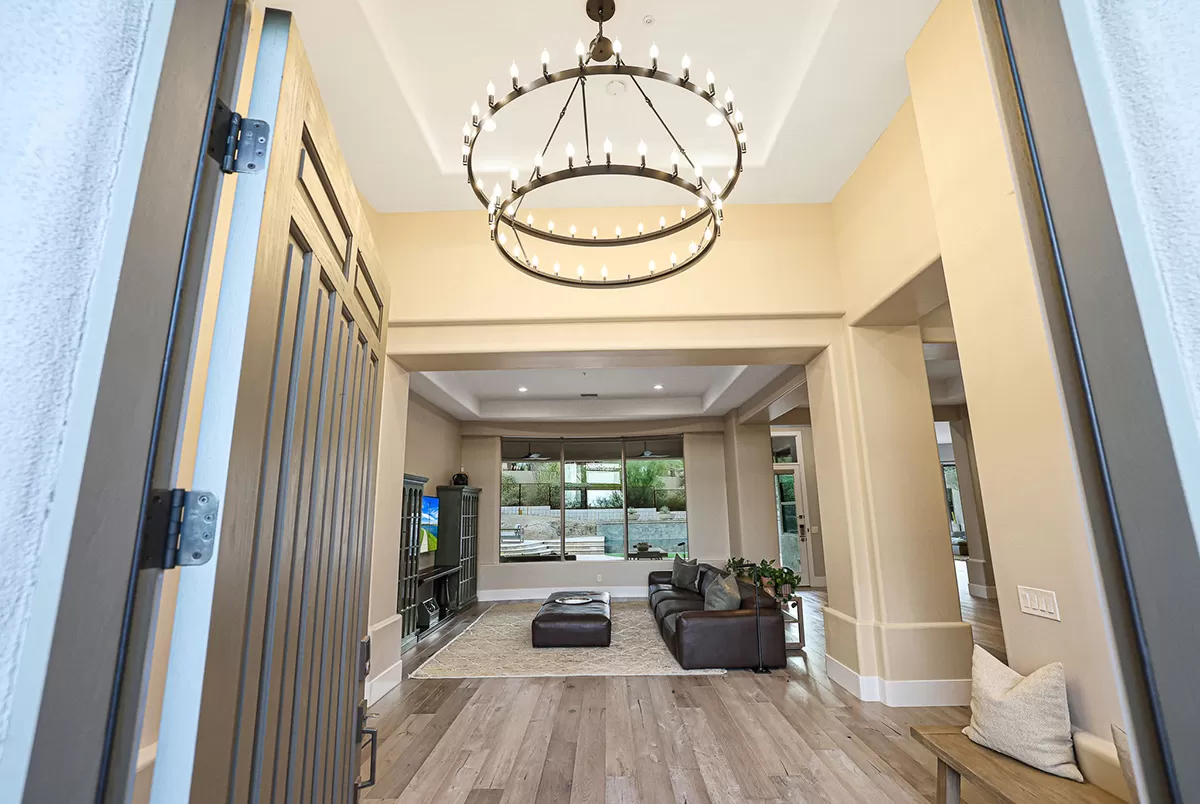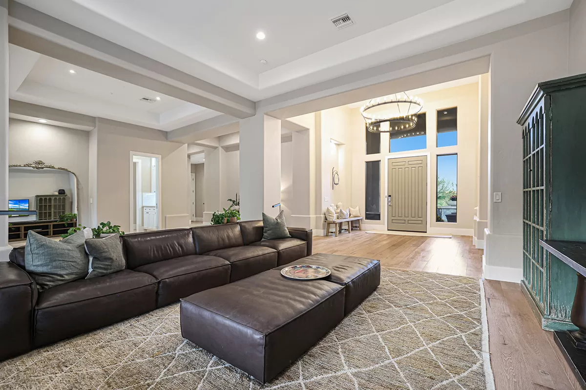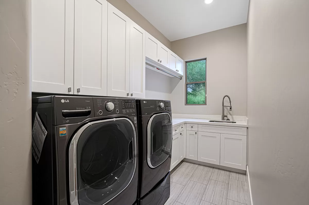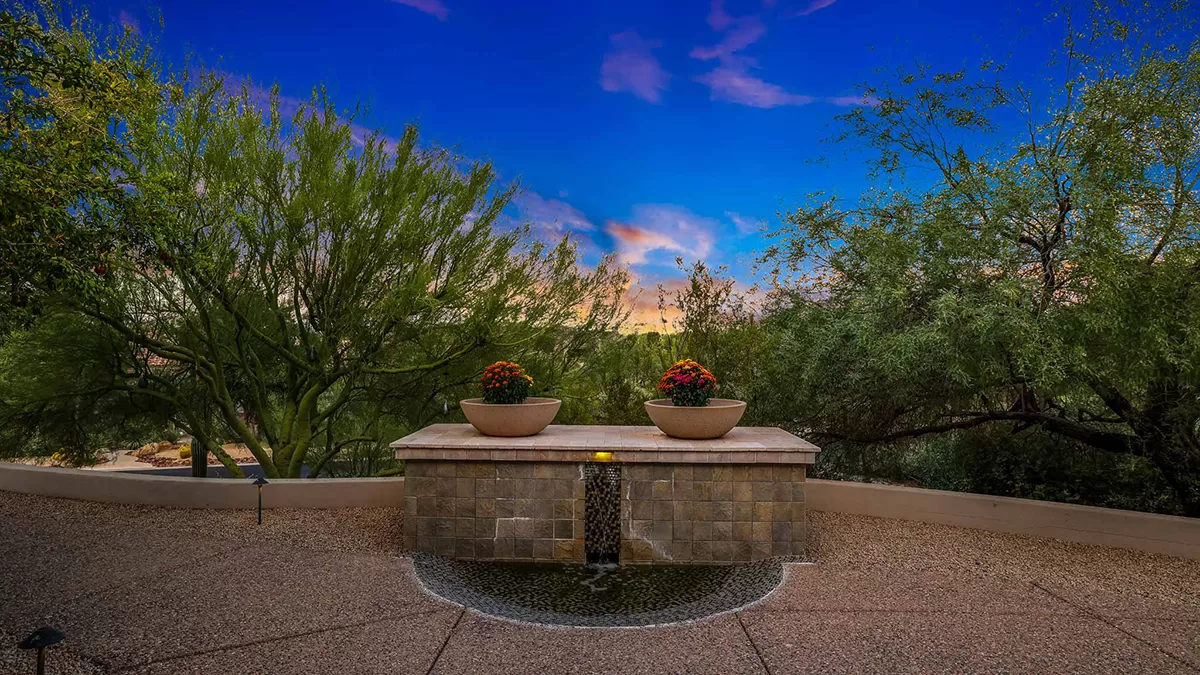 The guest house has a sitting area, small kitchenette with sink and mini-fridge, ensuite bath, walk-in closet, and mountain views for your visiting guests! Other features include: large laundry with second set of washer/dryer and sink; powder bath, side entry three-car garage; private front entry with fountain; large entry foyer; formal living and dining spaces; updated light fixtures; newly painted exterior; designer interior paint finish; upgraded doors and trim; remodeled guest bathrooms; all in a guard gated community!