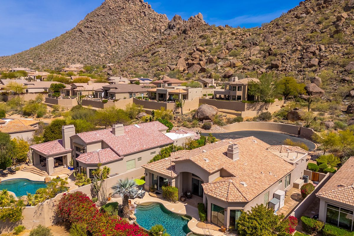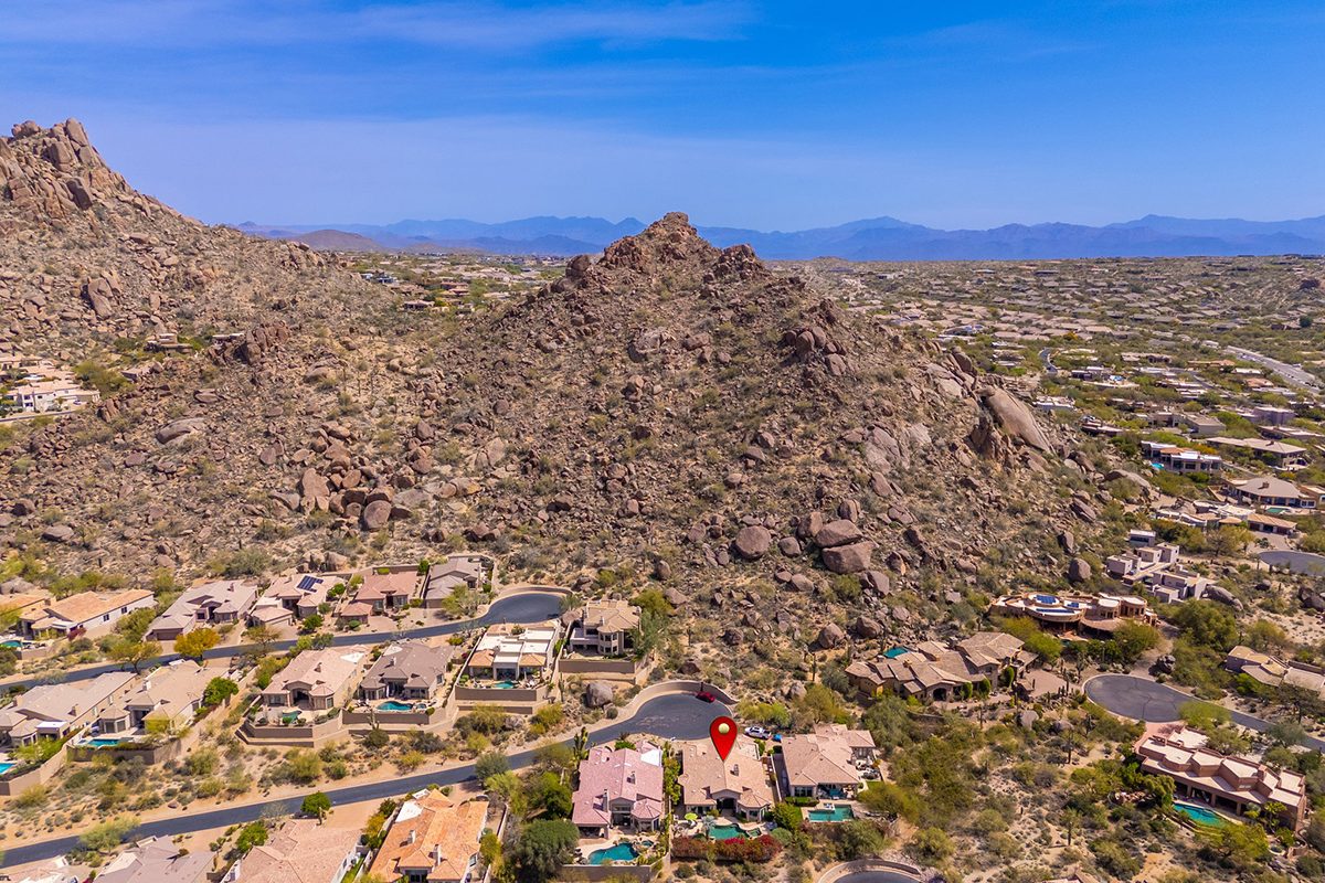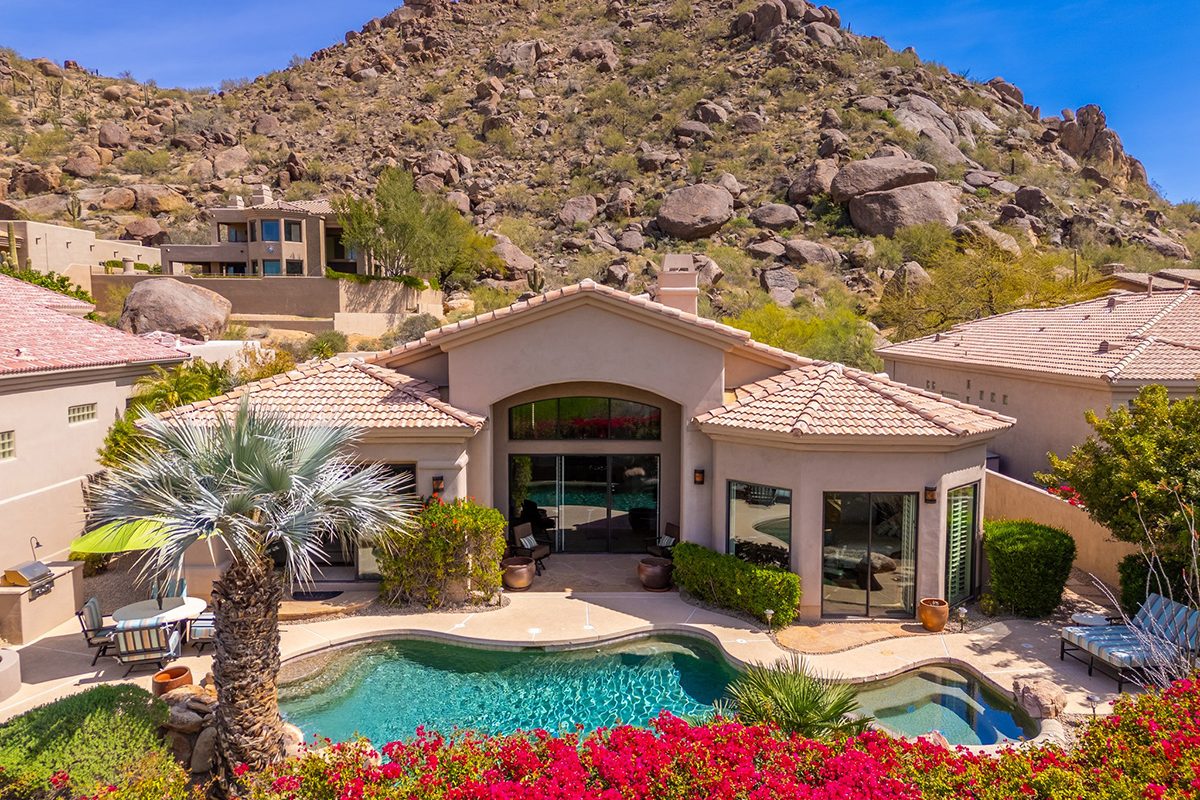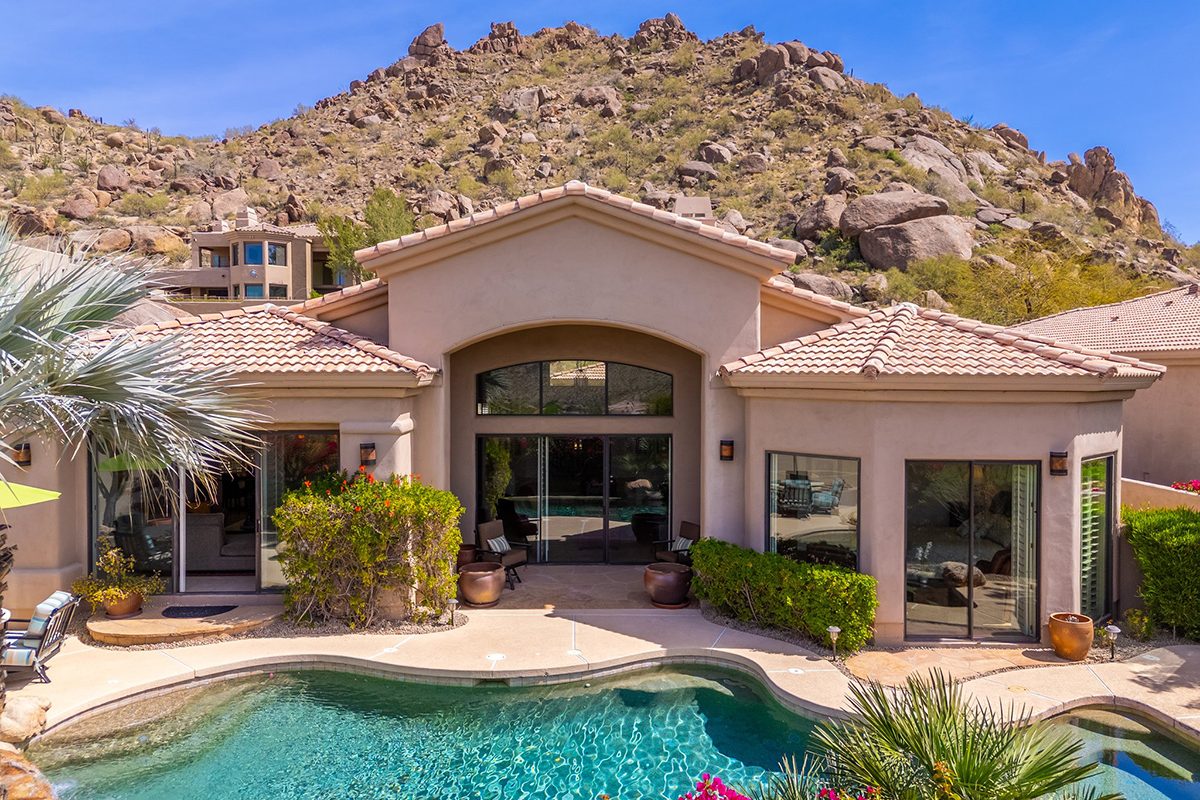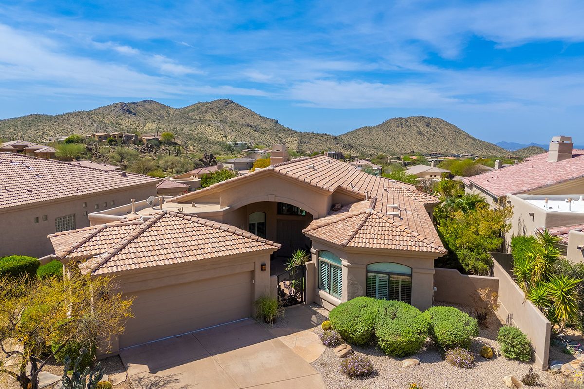 Nestled in the gated enclave of Quail Ridge at Troon Village, this beautifully designed three bedroom, three bath home offers breathtaking McDowell Mountain views from the south-facing backyard and an up-close view of Troon Mountain from the front yard.