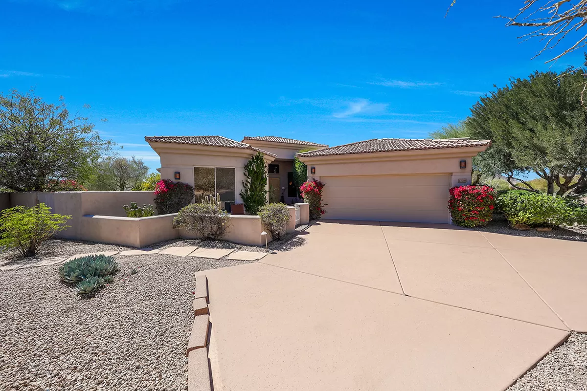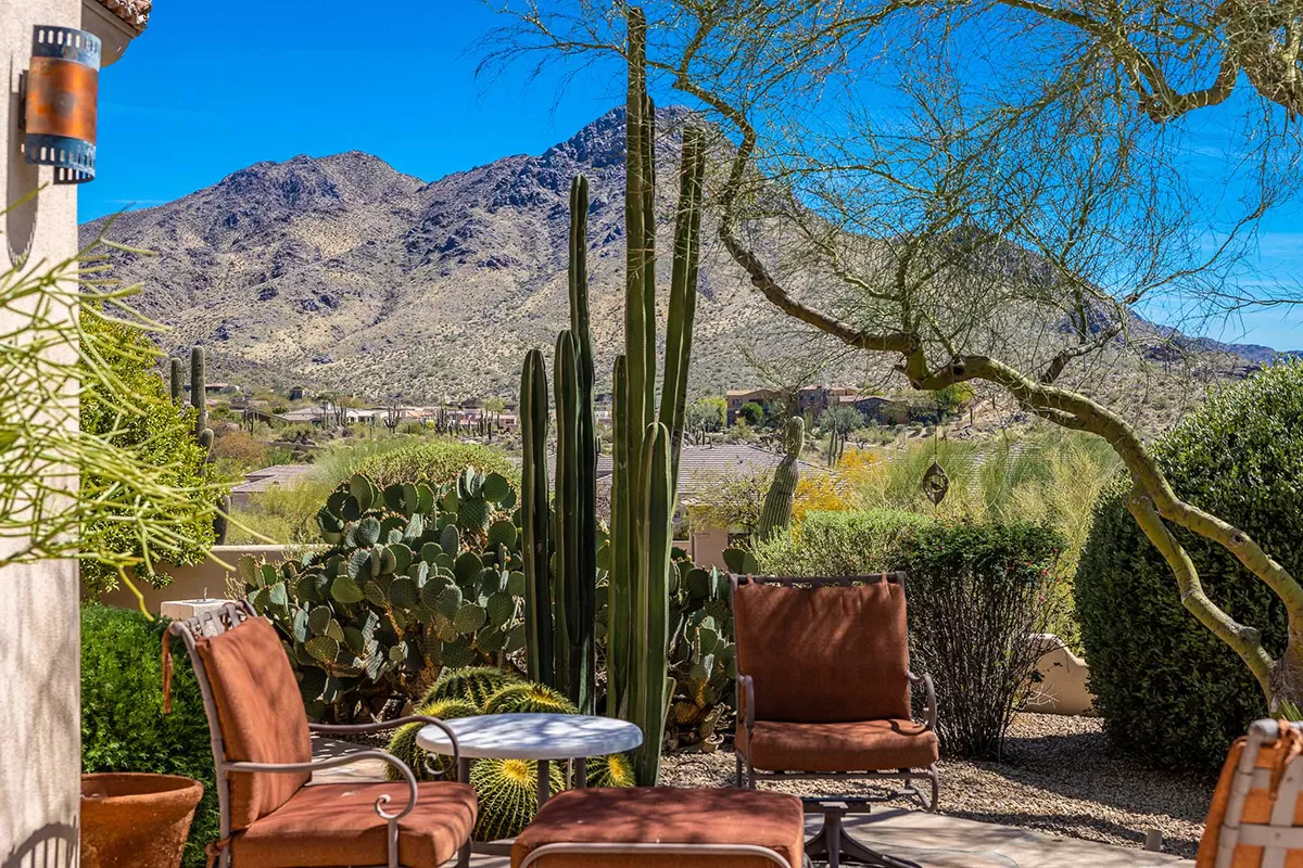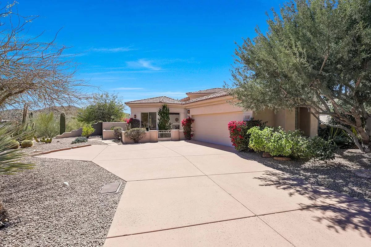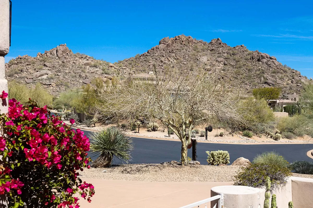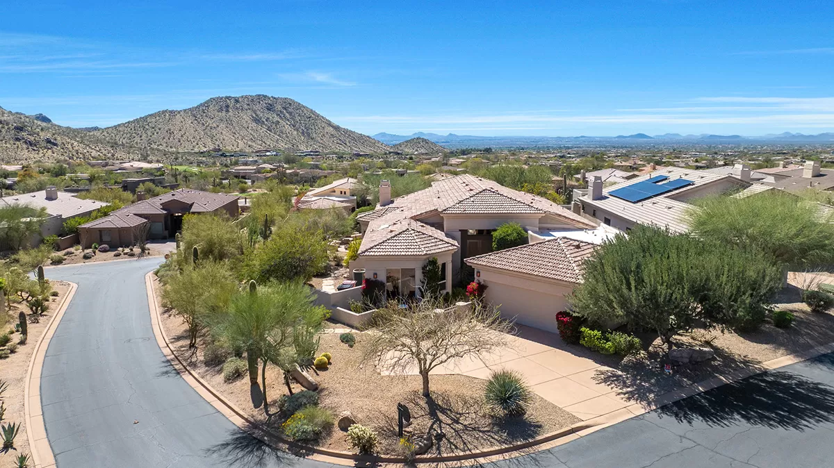 Discover an exquisite single-level residence nestled within the prestigious gated community of Quail Ridge at Troon Village in Scottsdale, AZ. This remarkable 4-bedroom, 3-bathroom home spans 3,528 square feet and features the rare convenience of no interior steps, making it an exceptional find in this highly sought-after neighborhood. Positioned on an elevated corner lot, this home offers unrivaled privacy and showcases breathtaking panoramic views of McDowell Mountain and the sparkling city lights below.