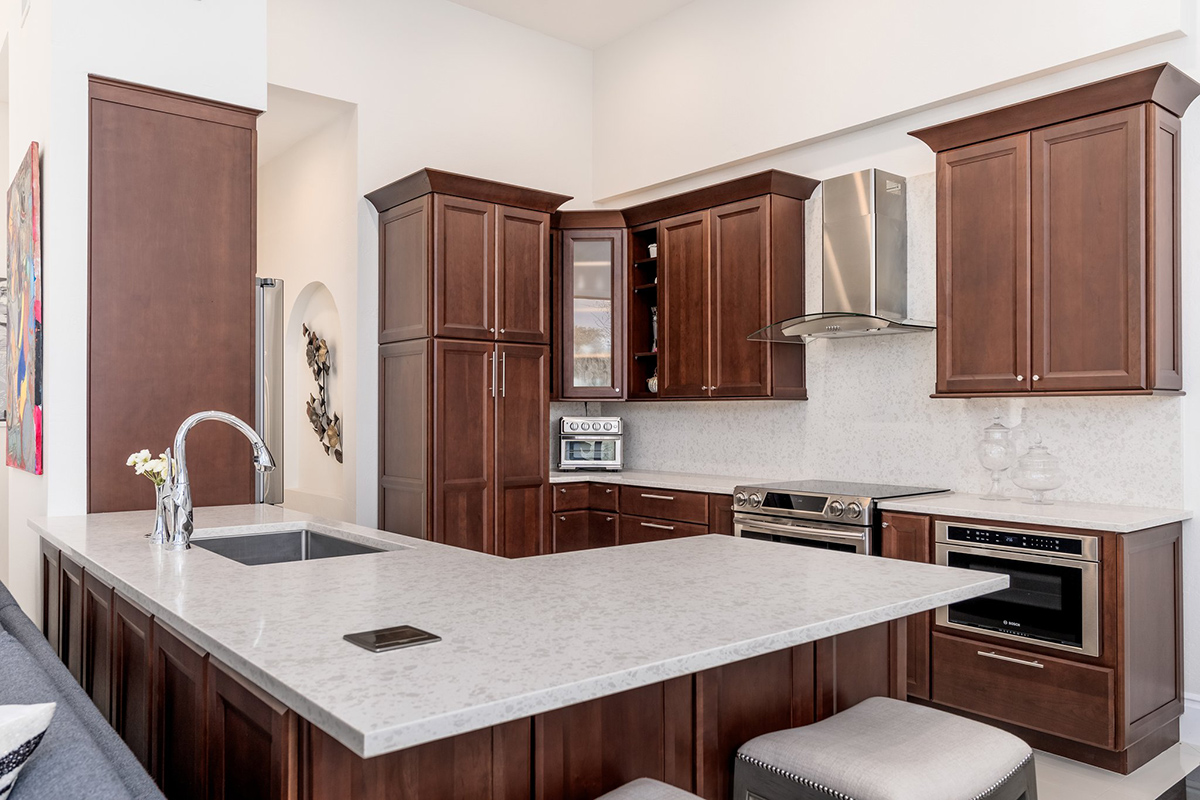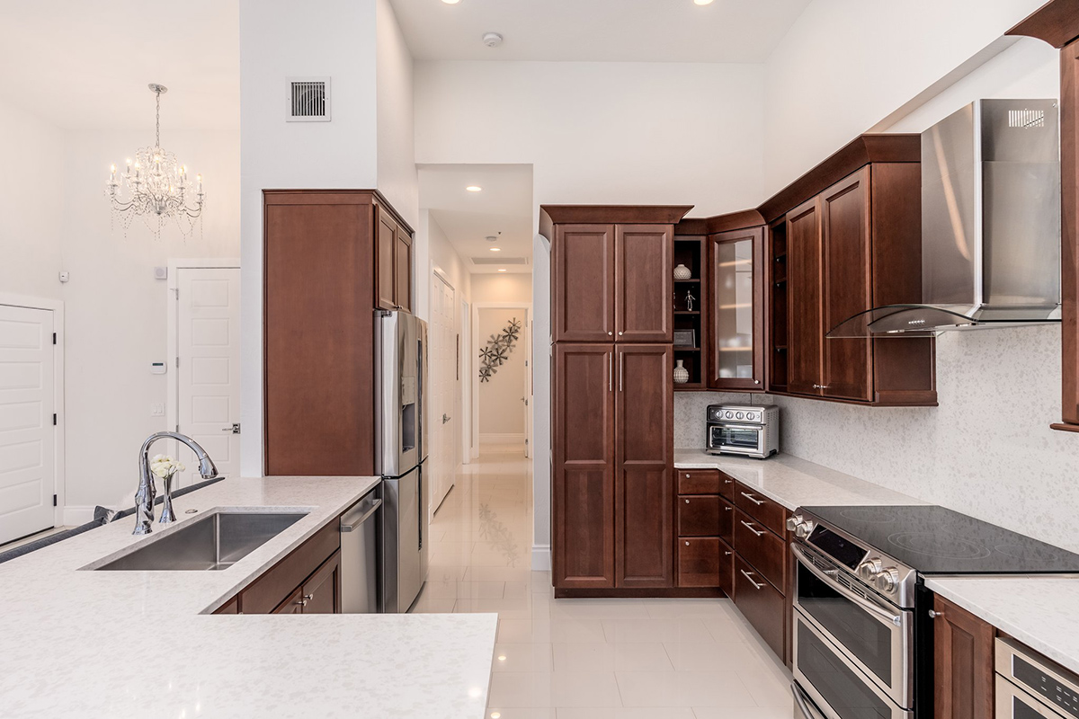 The home is well-maintained, with an HVAC system that is only five years old and a roof coating that was applied three years ago. Inside, the light and bright tile floors and vaulted ceilings create an open and inviting atmosphere. The kitchen is equipped with stainless steel appliances, wood cabinetry, quartz counters, and countertop seating, all open to the family and dining areas. The family room features view windows and a cozy fireplace.