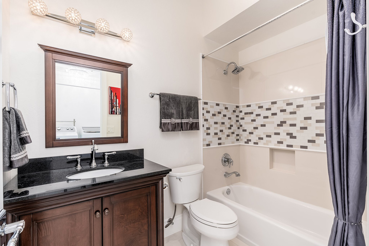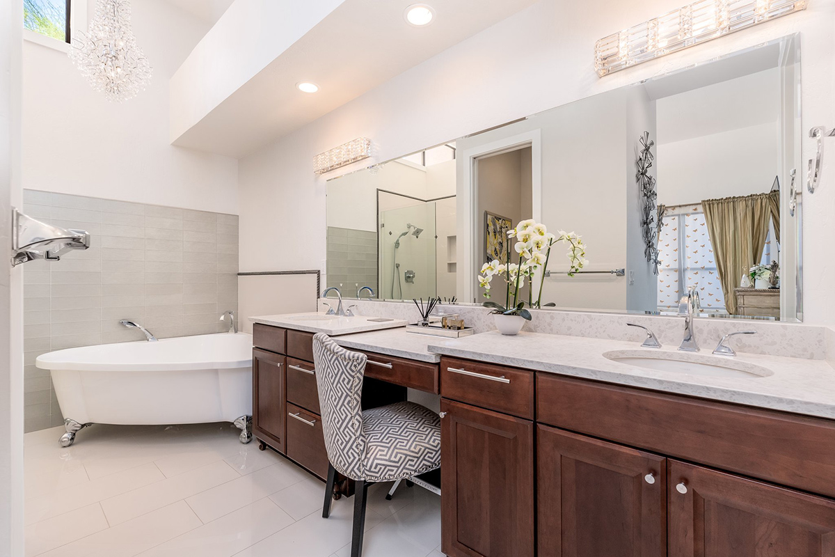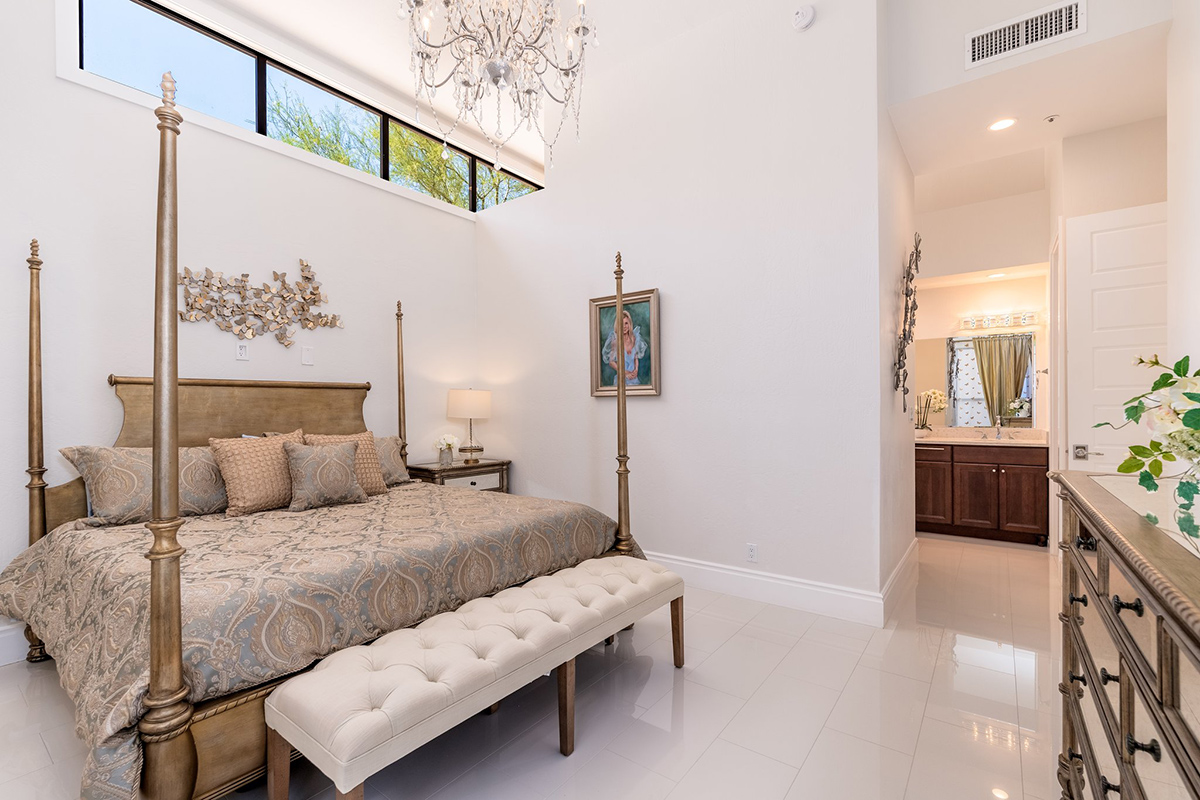 The large primary suite includes clerestory windows, a walk-in closet with custom storage built-ins, dual sinks, vanity seating, a soaking tub, and a large walk-in shower. The guest hall bathroom is conveniently located across from the guest bedroom. Additional features include an interior laundry room and an attached two-car garage.