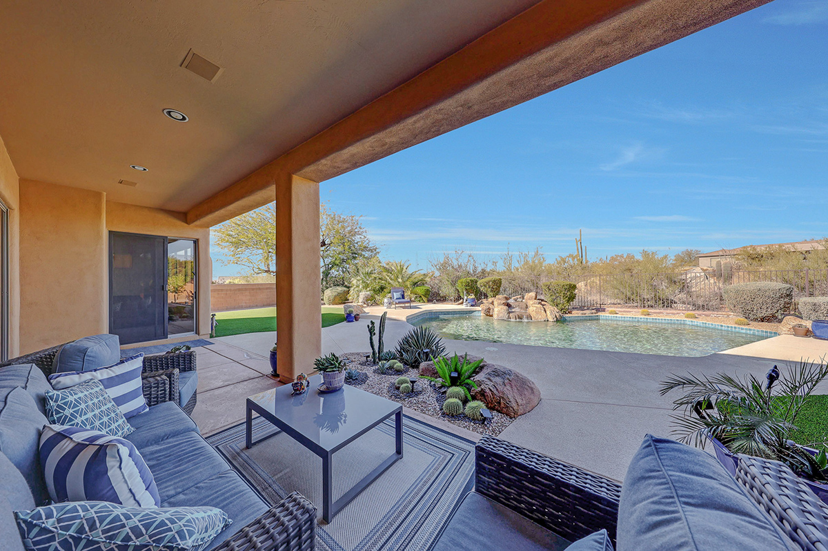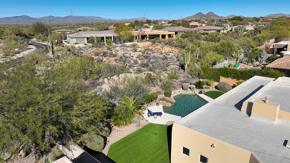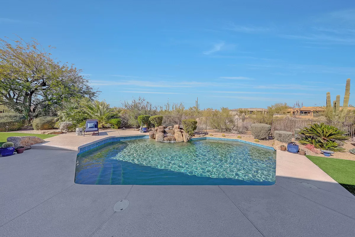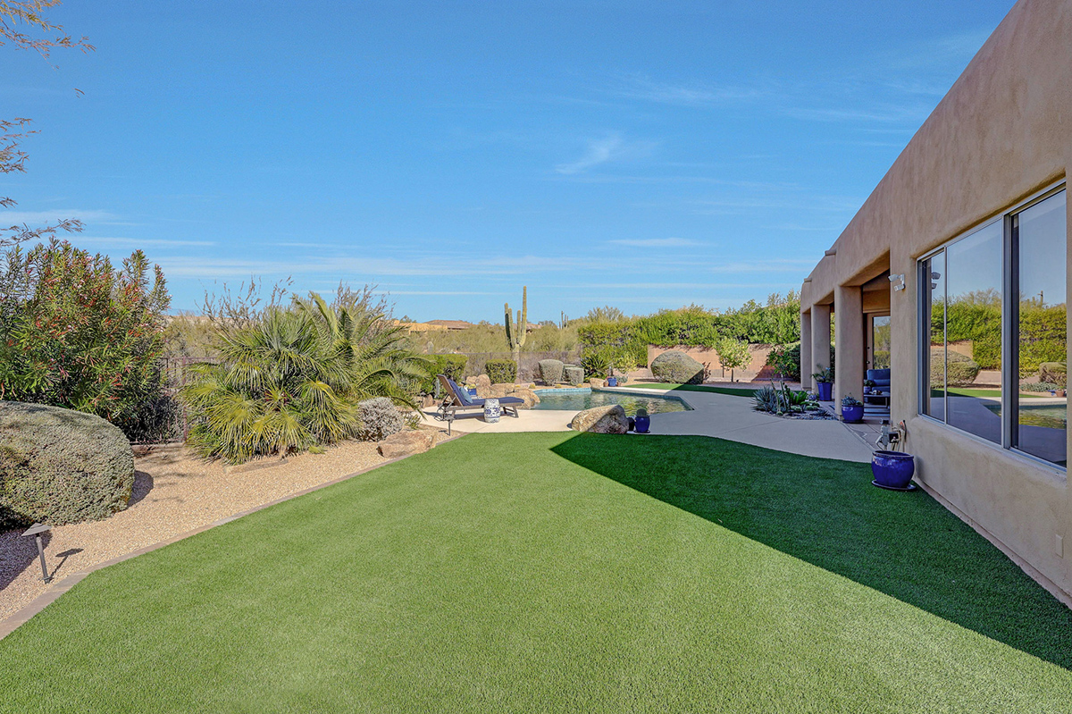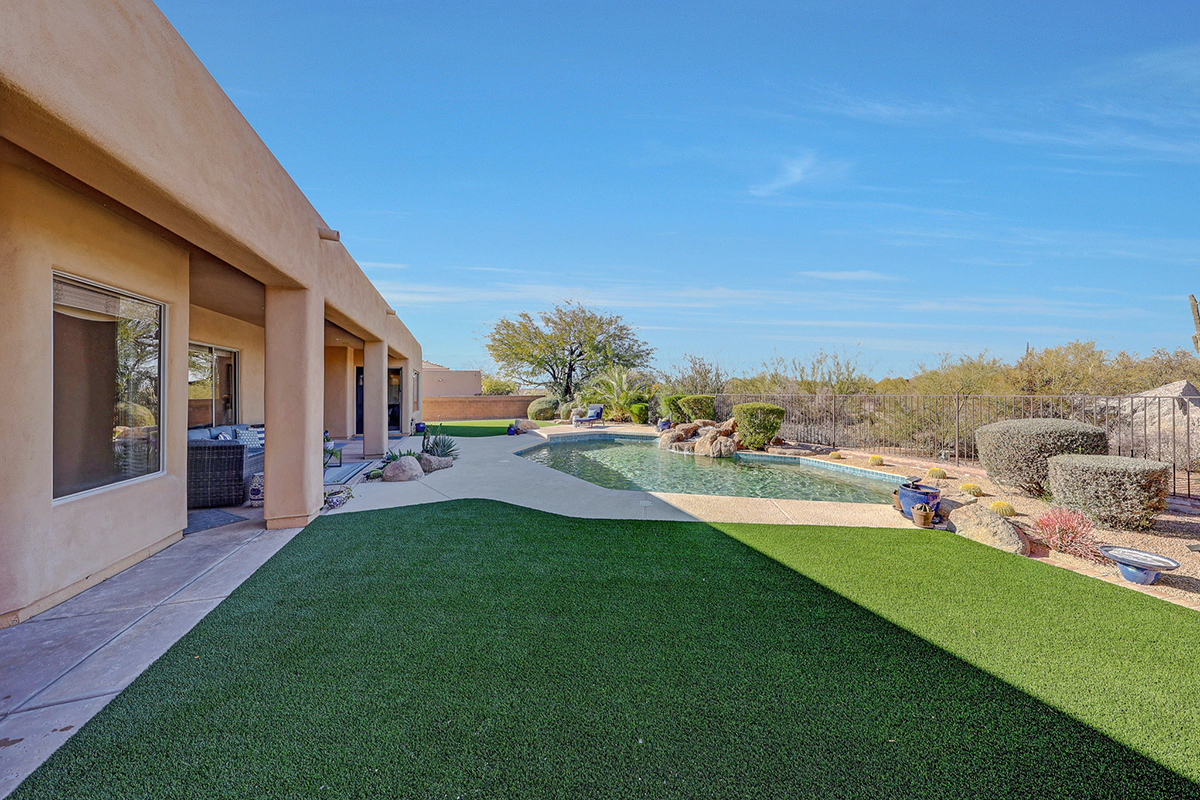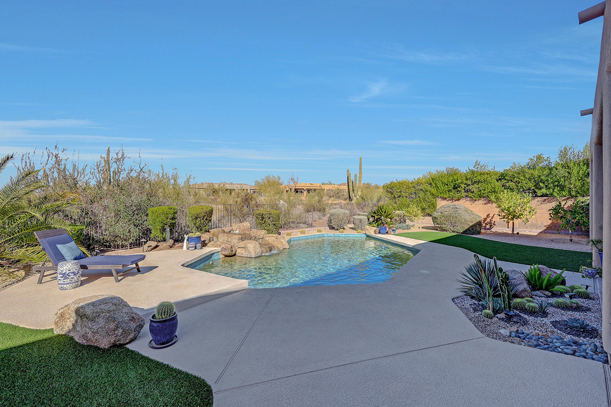 Located in Skyline Estates at Troon North, this North/South oriented lot backs to protected open space, offering year-round privacy and tranquility. Recent updates include two new Trane HVAC units and a water softener, both installed in 2023. The backyard oasis features a heated Pebble Tec pool with a boulder waterfall, a covered patio, two large artificial turf areas, mature landscaping with a cactus planter, fruit trees, and a sun-soaked lounge area perfect for relaxation.