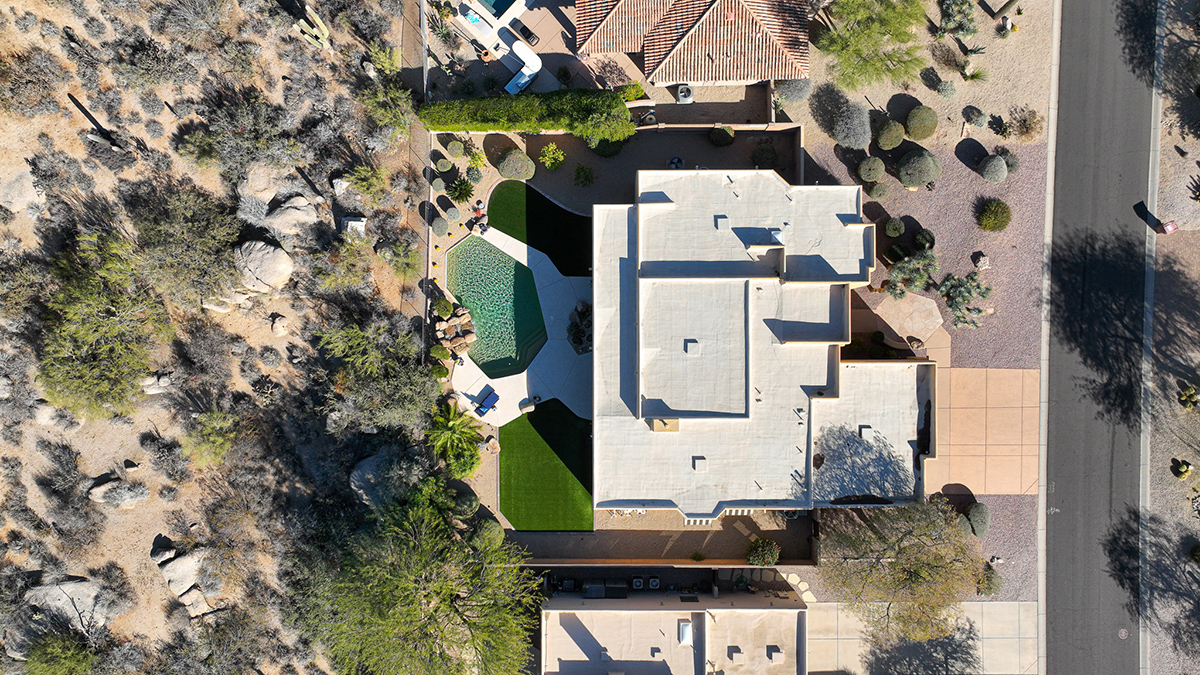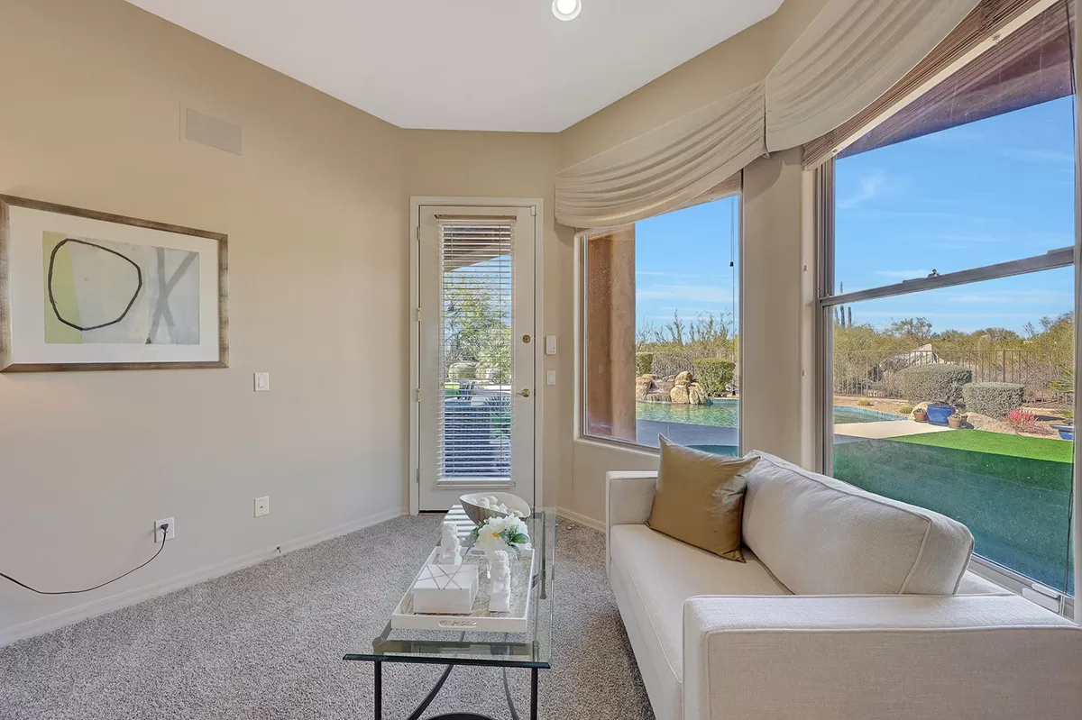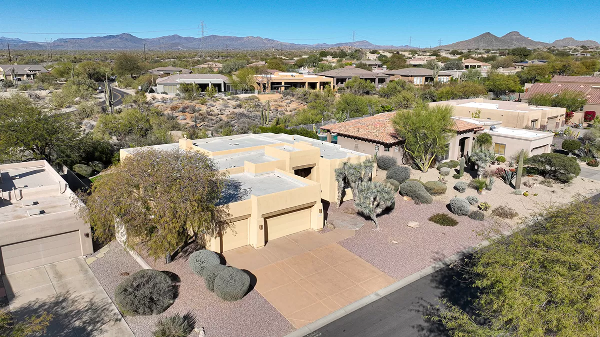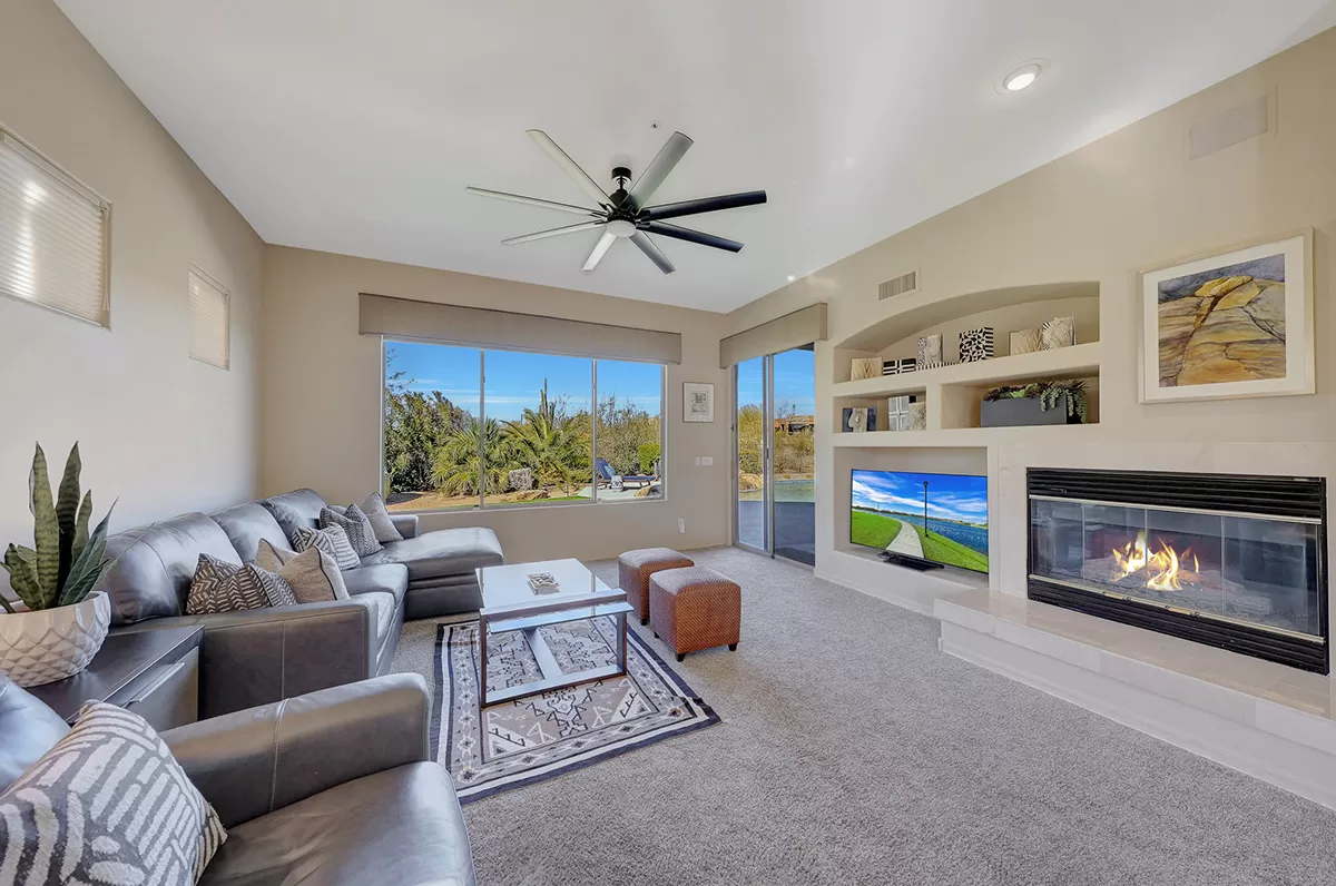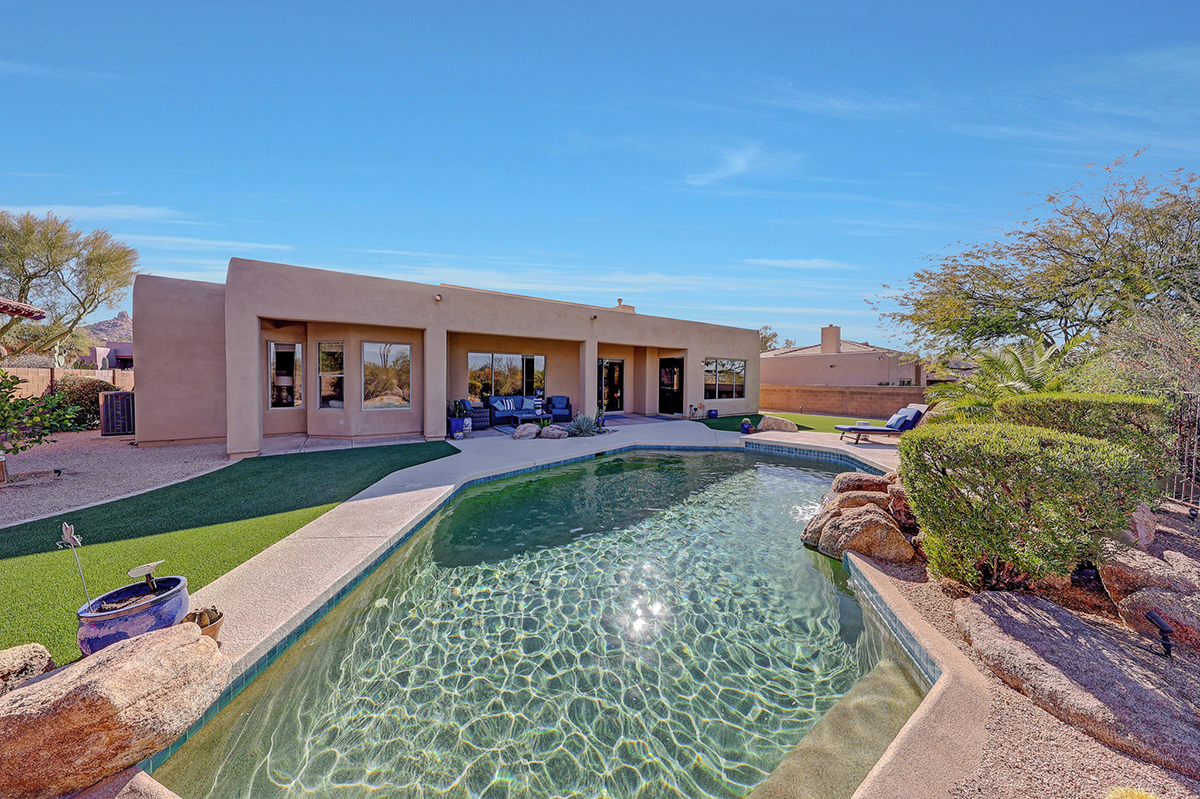 Located in Skyline Estates at Troon North, this North/South oriented lot backs to protected open space, offering year-round privacy and tranquility. Recent updates include two new Trane HVAC units and a water softener, both installed in 2023. The backyard oasis features a heated Pebble Tec pool with a boulder waterfall, a covered patio, two large artificial turf areas, mature landscaping with a cactus planter, fruit trees, and a sun-soaked lounge area perfect for relaxation.