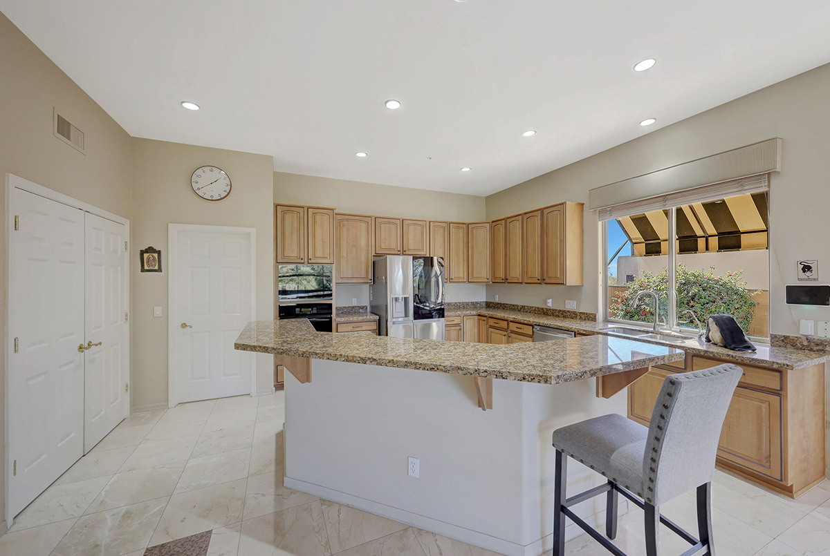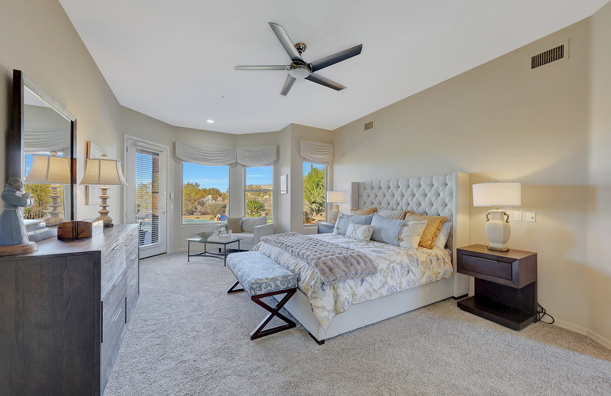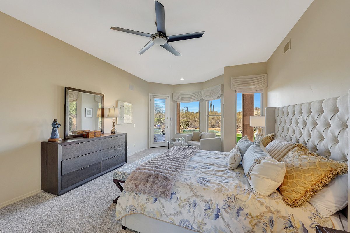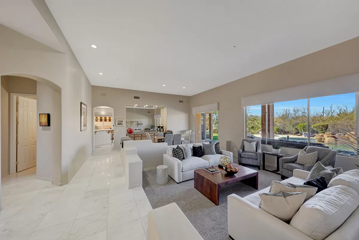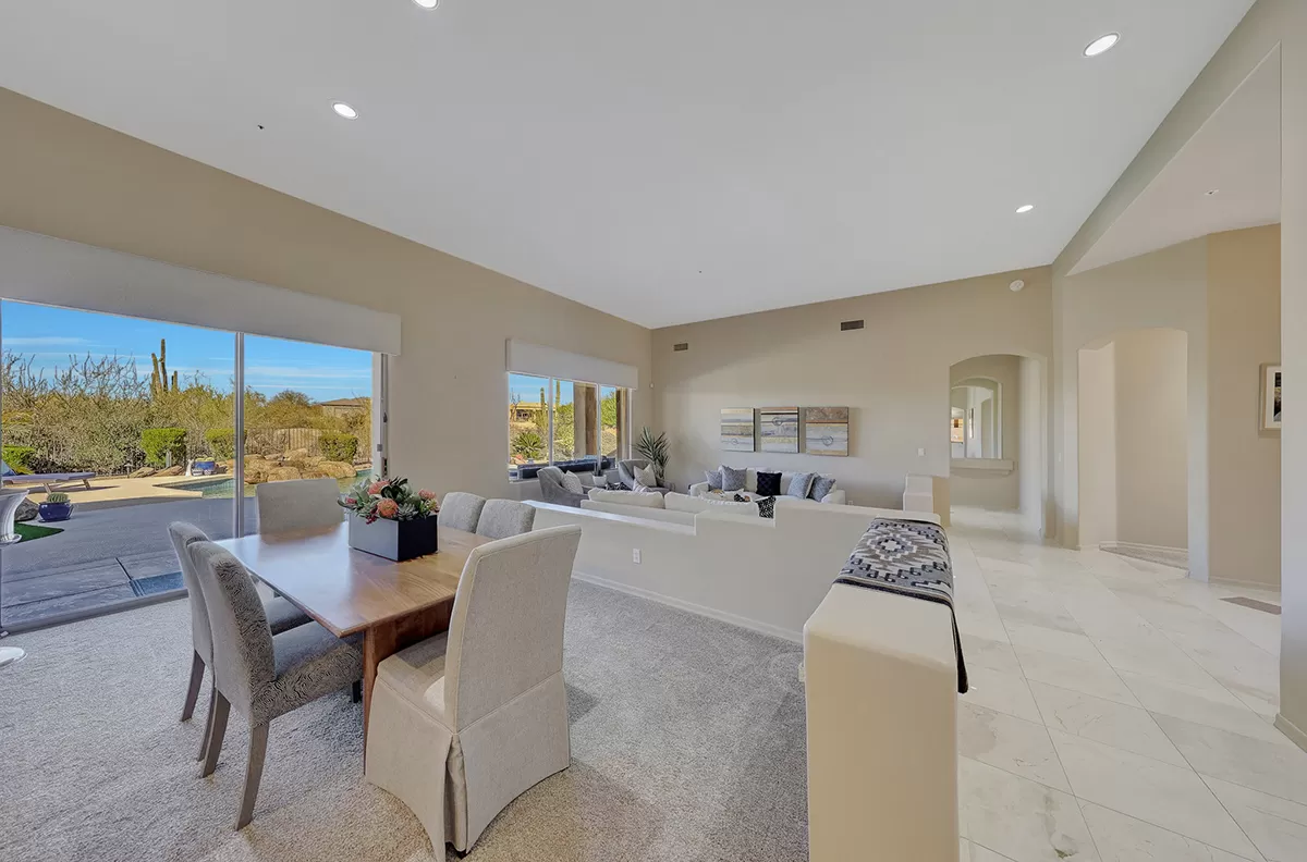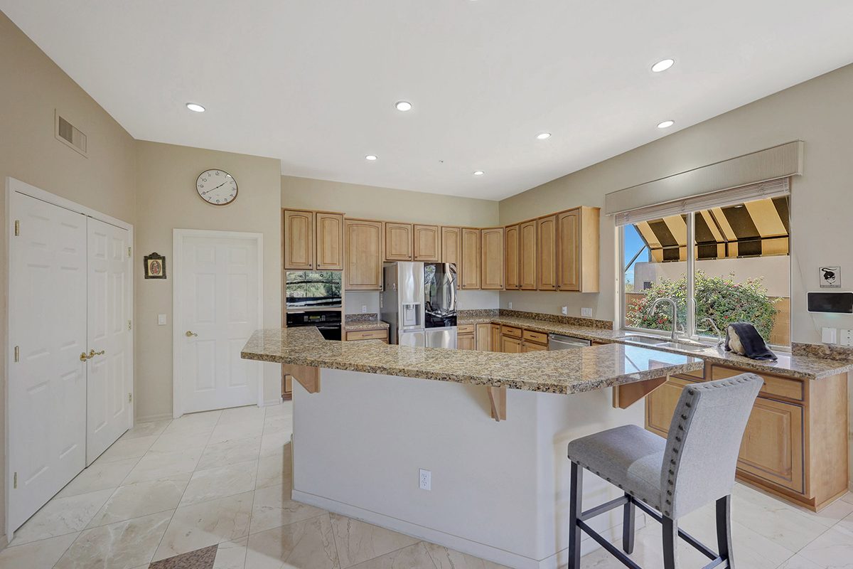 Located in Skyline Estates at Troon North, this North/South oriented lot backs to protected open space, offering year-round privacy and tranquility. Recent updates include two new Trane HVAC units and a water softener, both installed in 2023. The backyard oasis features a heated Pebble Tec pool with a boulder waterfall, a covered patio, two large artificial turf areas, mature landscaping with a cactus planter, fruit trees, and a sun-soaked lounge area perfect for relaxation.