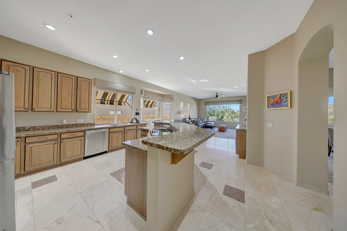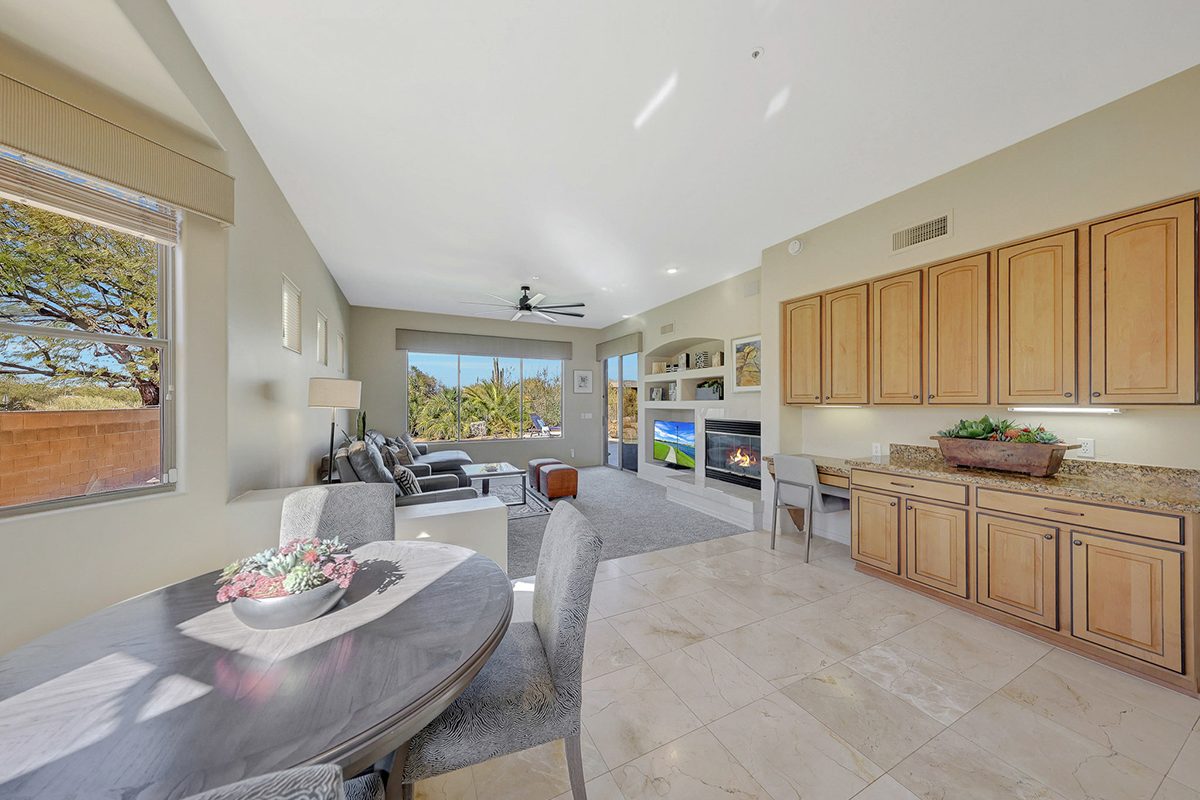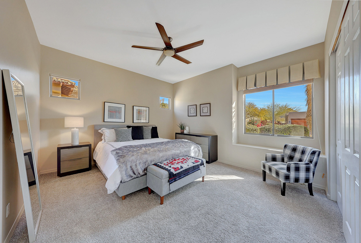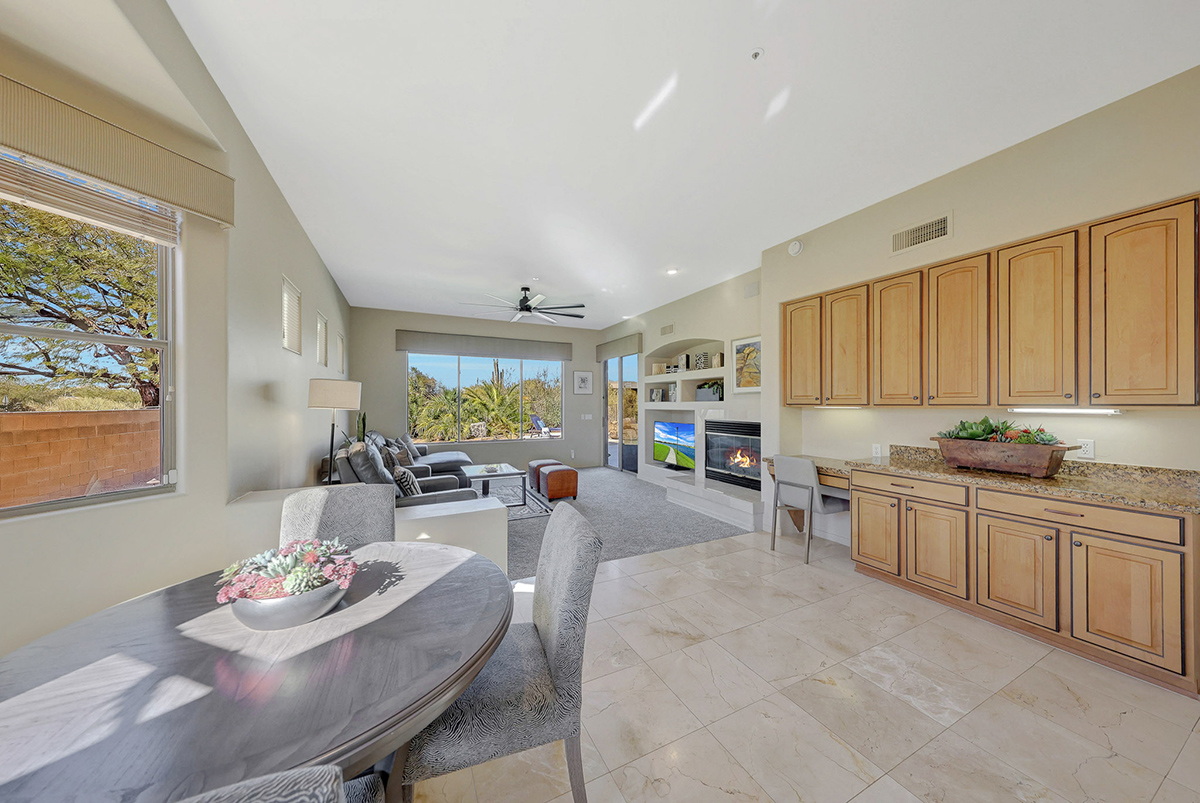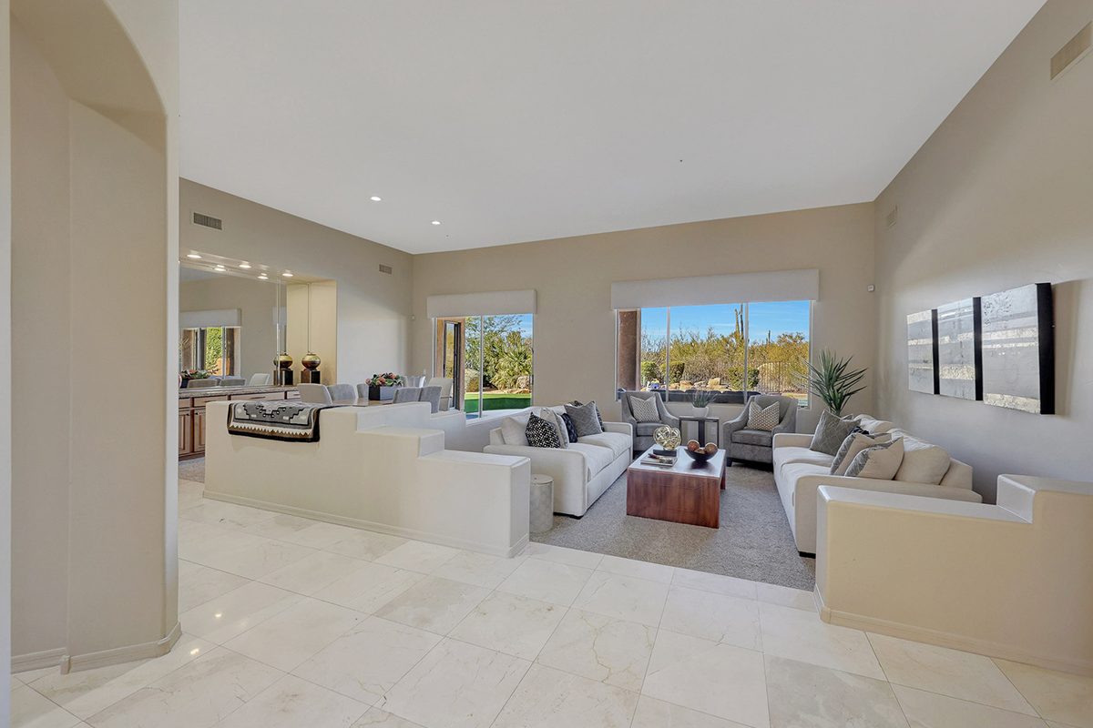 Located in Skyline Estates at Troon North, this North/South oriented lot backs to protected open space, offering year-round privacy and tranquility. Recent updates include two new Trane HVAC units and a water softener, both installed in 2023. The backyard oasis features a heated Pebble Tec pool with a boulder waterfall, a covered patio, two large artificial turf areas, mature landscaping with a cactus planter, fruit trees, and a sun-soaked lounge area perfect for relaxation.