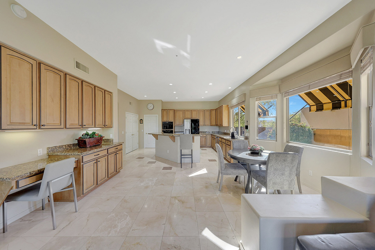 Inside, 11-foot ceilings in the living and dining rooms create an expansive and airy atmosphere, with natural light streaming through the numerous windows outfitted with window treatments. The kitchen and family room combine for a seamless great-room feel. The kitchen boasts granite countertops, ample counter cabinet space, a pantry, wall oven, center island with raised bar seating, and a dedicated breakfast area, while the family room features a cozy fireplace and overlooks the backyard.