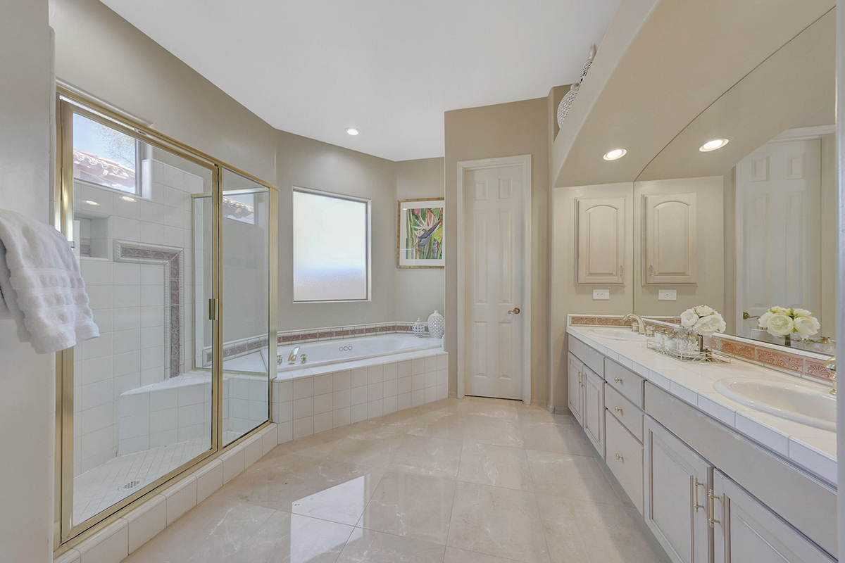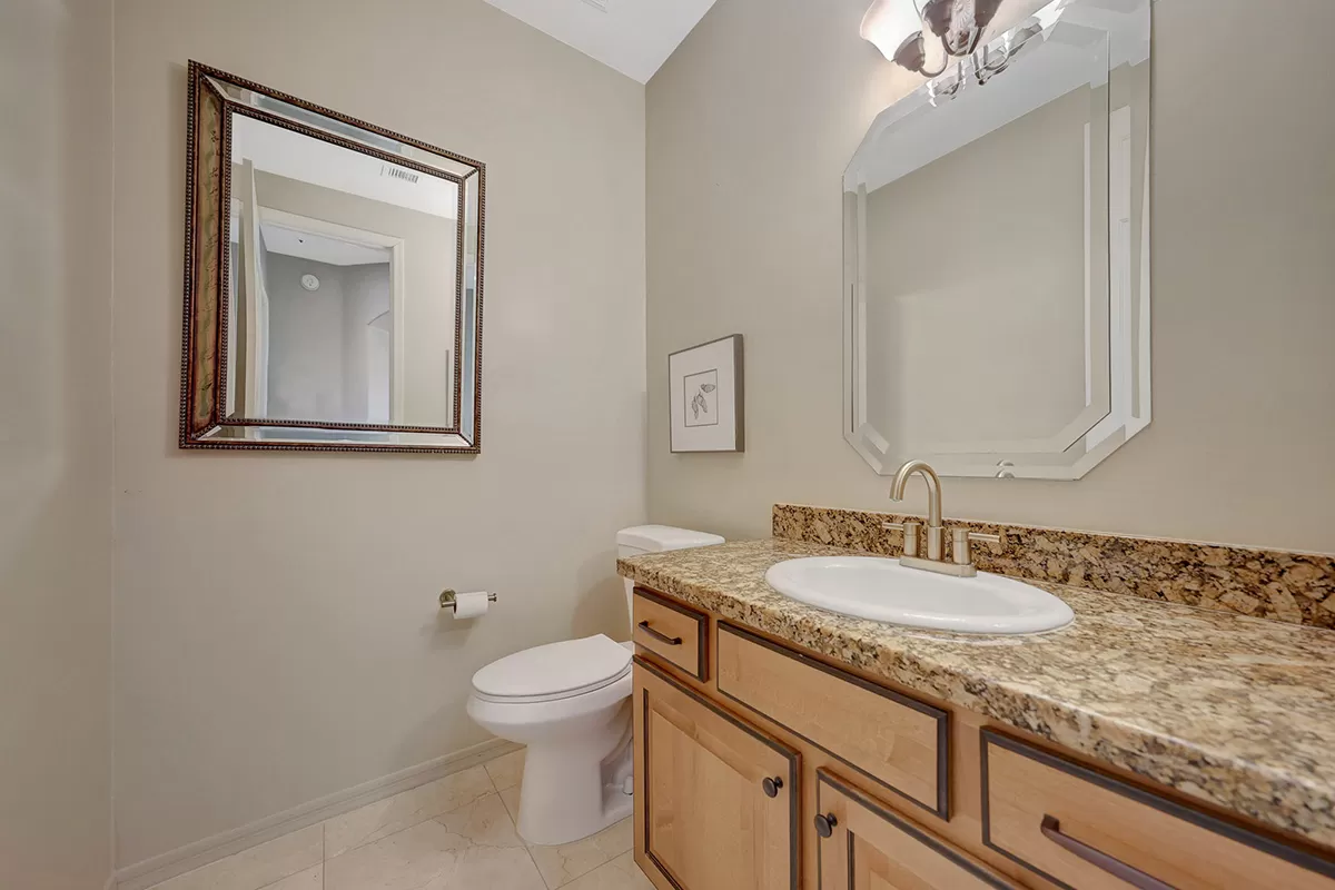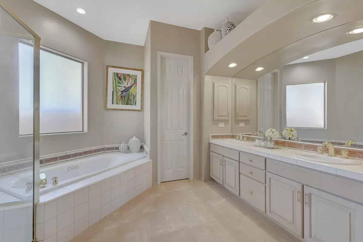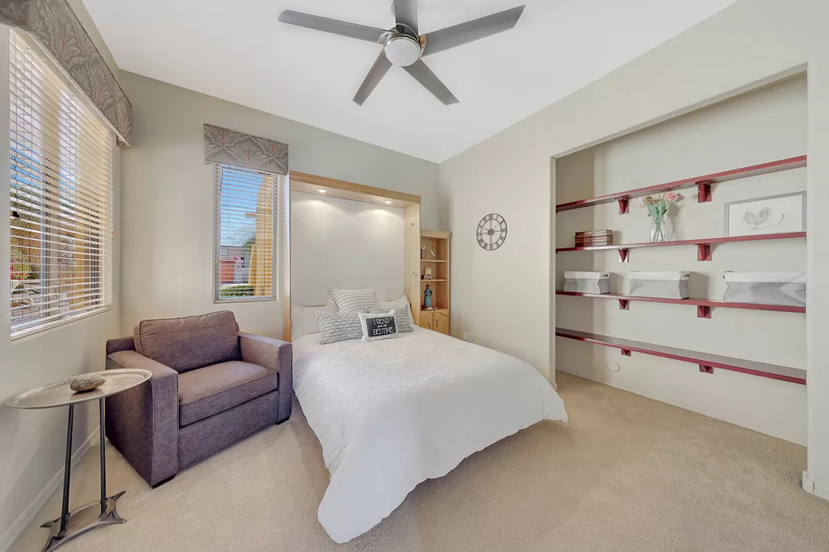 The primary suite is a true retreat, with exterior access, a sitting area, and a ensuite bath complete with dual sinks, a soaking tub, a separate shower, and a spacious walk-in closet. The ensuite guest bedroom is light, bright, and generously sized, while a third bedroom, currently equipped with a Murphy bed, offers flexibility as an office, den, or additional guest space, with convenient access to the half bath.