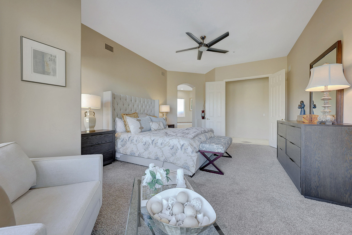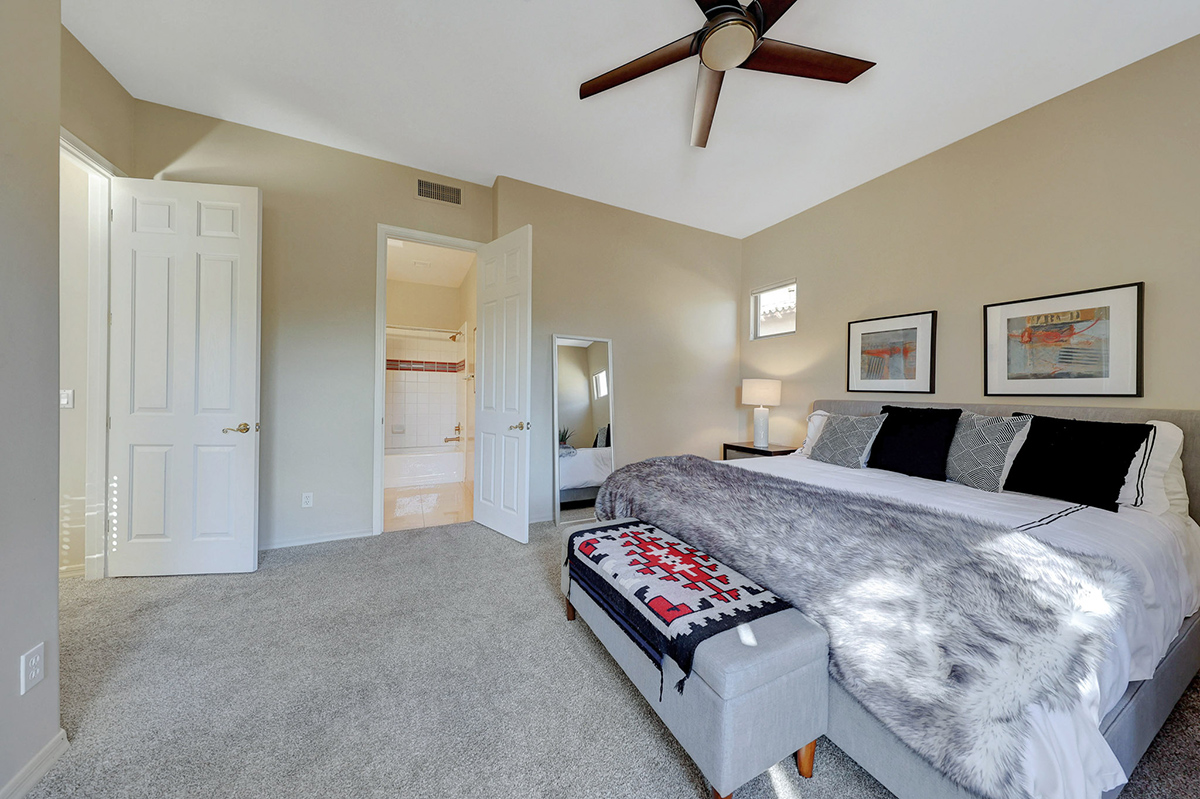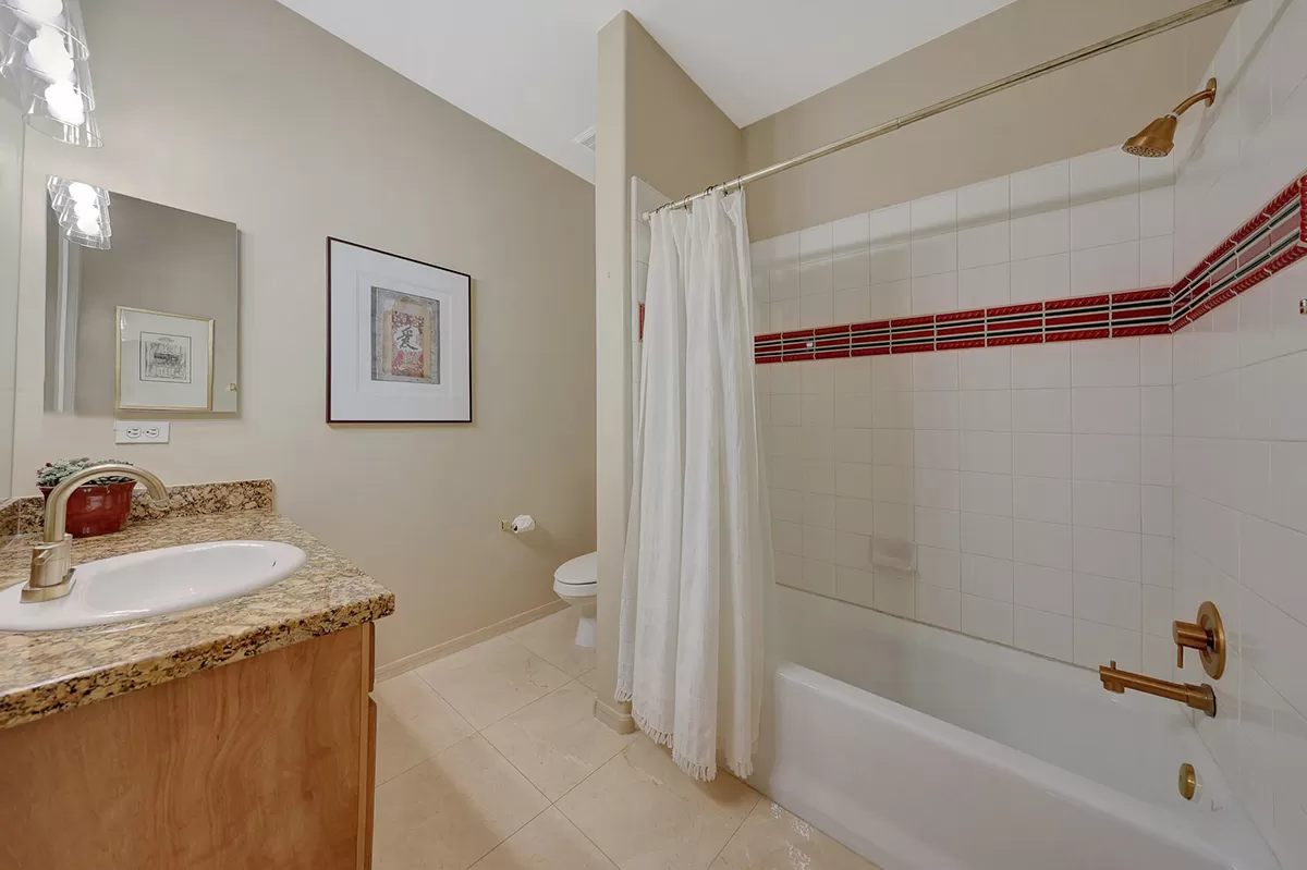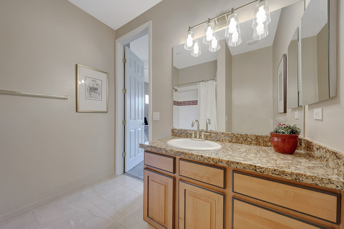 The primary suite is a true retreat, with exterior access, a sitting area, and a ensuite bath complete with dual sinks, a soaking tub, a separate shower, and a spacious walk-in closet. The ensuite guest bedroom is light, bright, and generously sized, while a third bedroom, currently equipped with a Murphy bed, offers flexibility as an office, den, or additional guest space, with convenient access to the half bath.