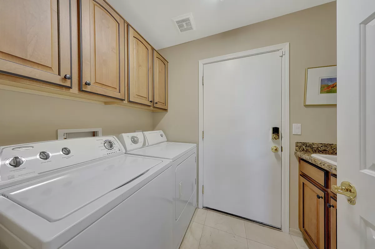 Additional features include a three-car garage with epoxy floors and direct access to the laundry room, which is outfitted with extra cabinetry and a sink. A gas water heater, security system, and thoughtfully designed spaces complete the home. Most furnishings and accessories are available through a Separate Bill of Sale.