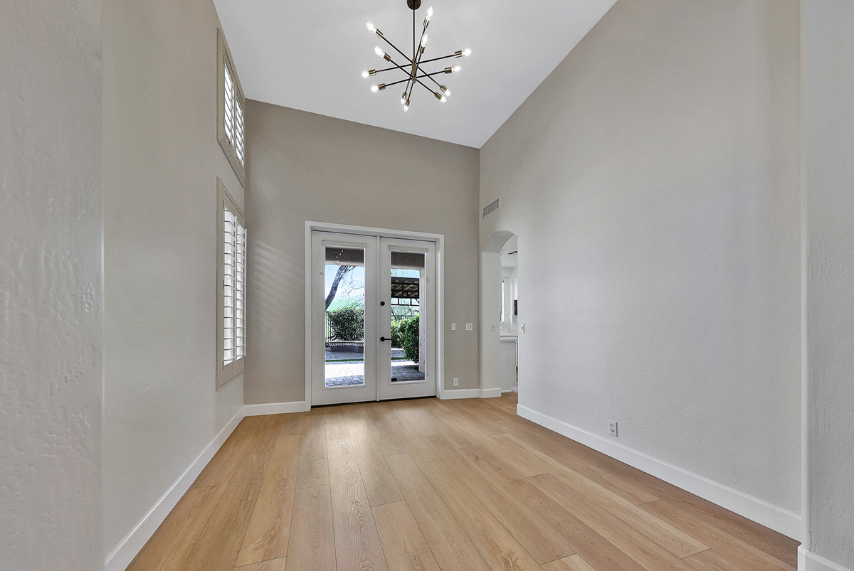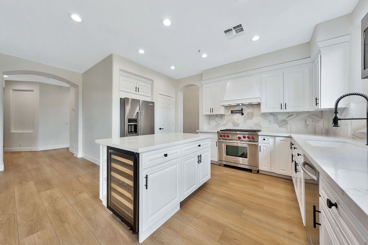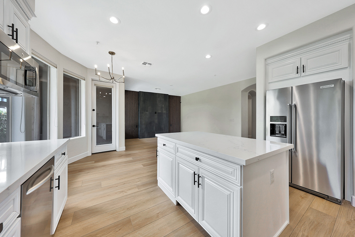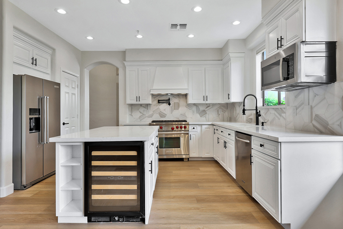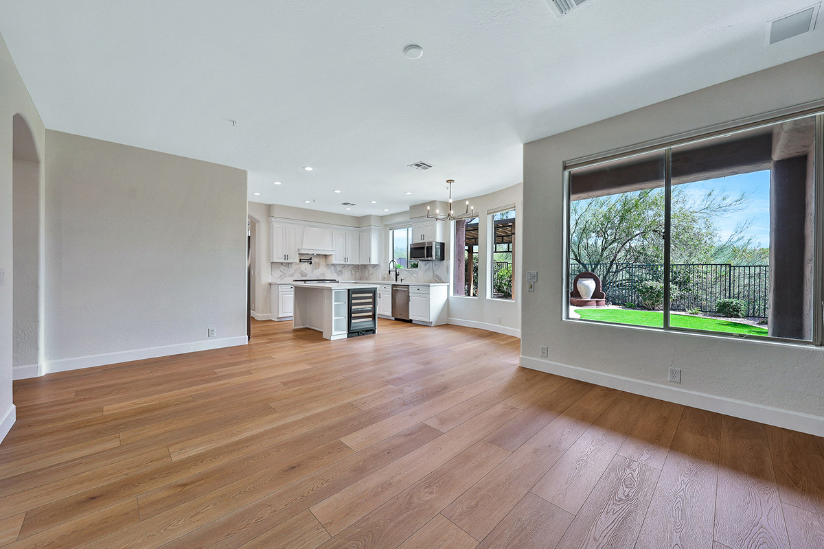 This beautifully updated residence in Sonoran Hills offers a fresh, contemporary feel with new luxury vinyl plank wood flooring, upgraded recessed lighting, and stylish fixtures throughout. The chef’s kitchen is a showstopper with crisp white cabinetry, quartz countertops, a center island with beverage fridge, decorative backsplash, gas range with pot filler, stainless steel appliances, walk-in pantry, and a cozy breakfast nook. The adjoining family room features a dramatic new feature wall with large-format tile and wood soundboard accents.