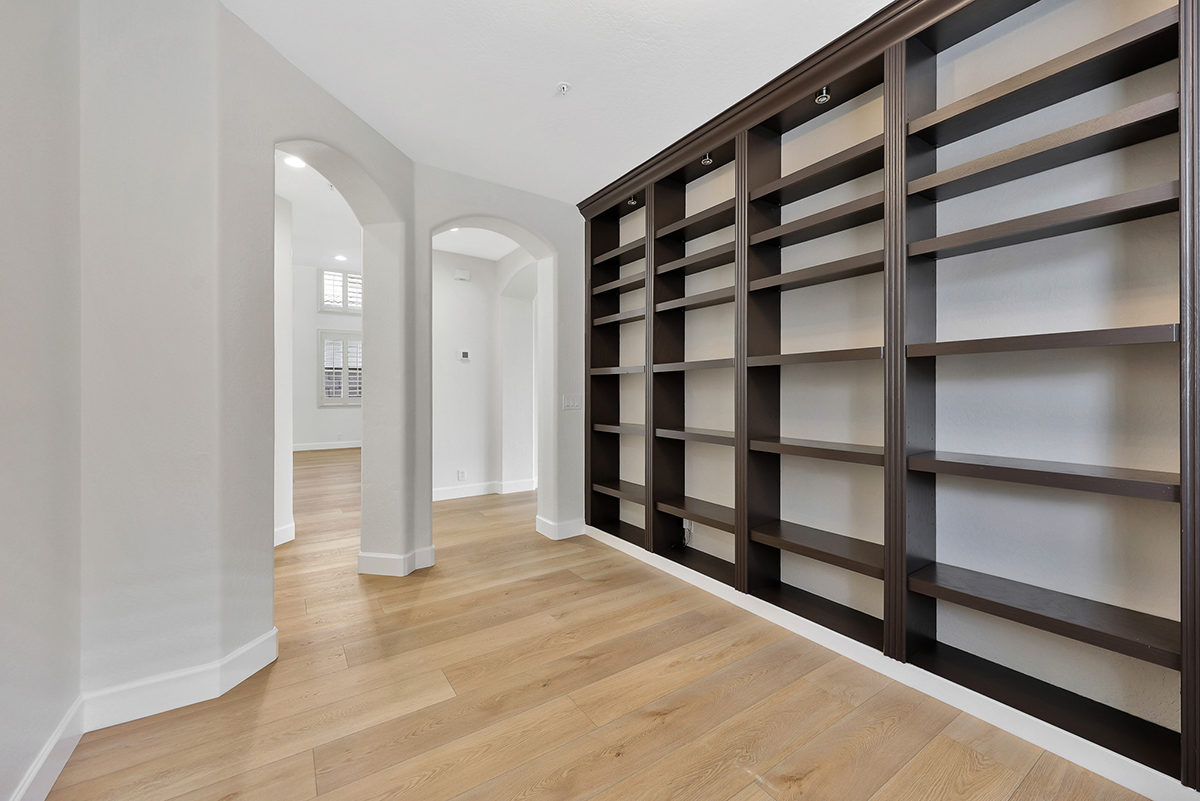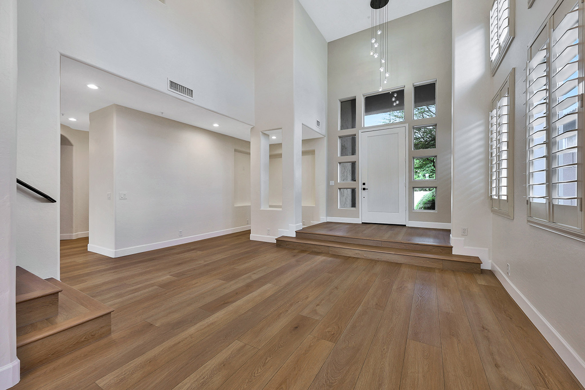 The grand two-story entry showcases soaring ceilings and picture windows, leading to the formal living and dining rooms. A private office or den with built-in bookshelves, a full bathroom with walk-in shower, dedicated laundry room, and direct access to a two-car garage with epoxy floors and a spacious attached storage/flex room (ideal as a home gym or workshop) complete the main level.