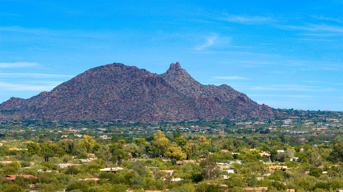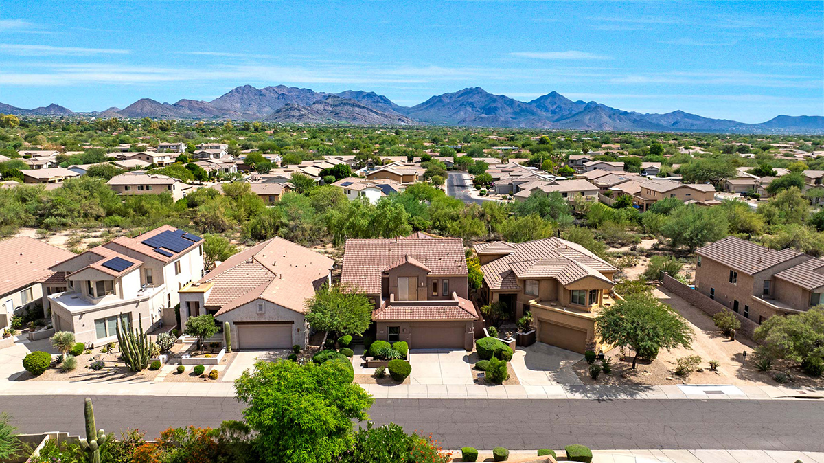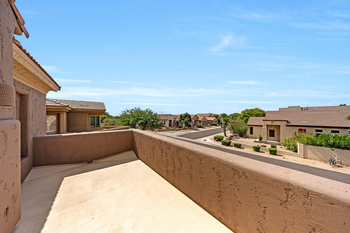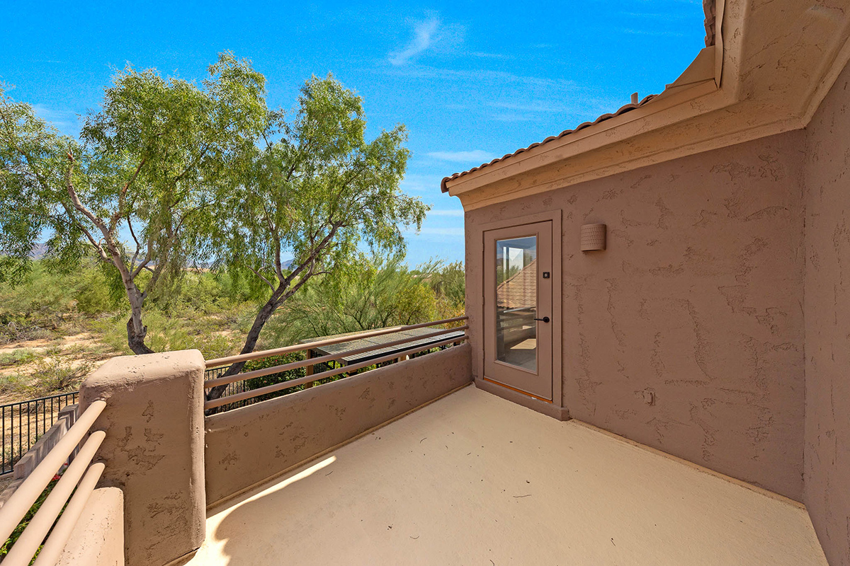 Upstairs, the primary suite offers a private balcony with views of the McDowell Mountains and Pinnacle Peak. The spa-inspired primary bath features a furniture-style dual vanity with marble counters, a soaking tub, glass framed shower with dual shower heads, and a generous walk-in closet with custom storage. A built-in workstation on the landing adds functionality, while two additional bedrooms, one with a walk-in closet and private balcony, share a Jack-and-Jill bath.
