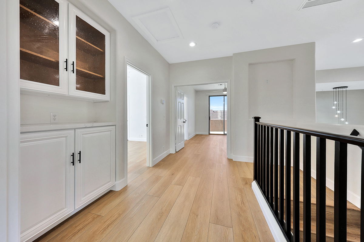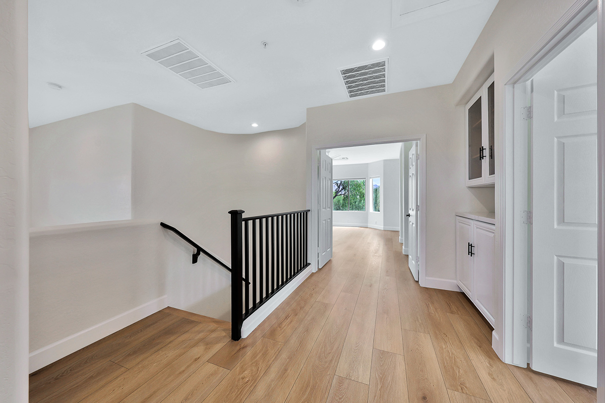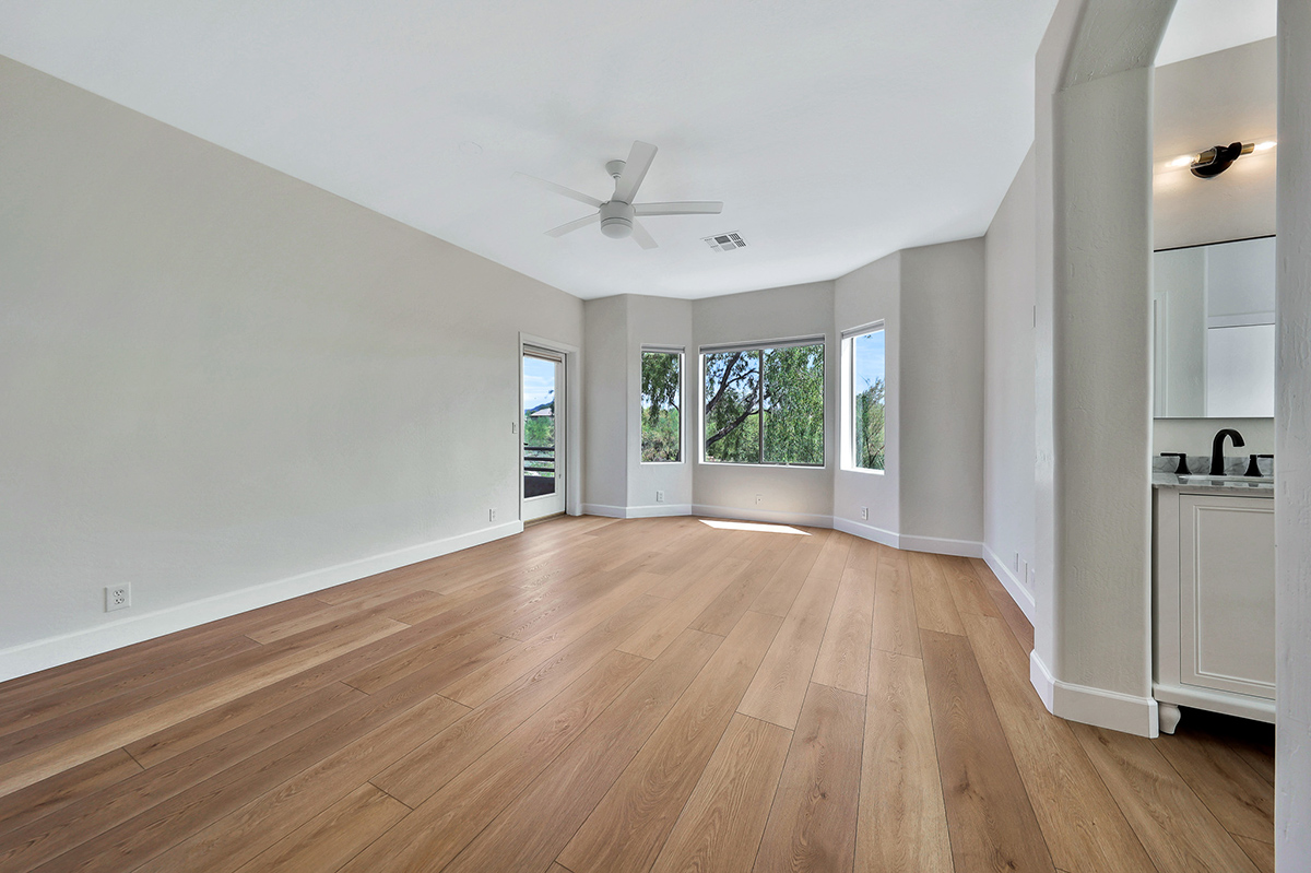 Upstairs, the primary suite offers a private balcony with views of the McDowell Mountains and Pinnacle Peak. The spa-inspired primary bath features a furniture-style dual vanity with marble counters, a soaking tub, glass framed shower with dual shower heads, and a generous walk-in closet with custom storage. A built-in workstation on the landing adds functionality, while two additional bedrooms, one with a walk-in closet and private balcony, share a Jack-and-Jill bath.