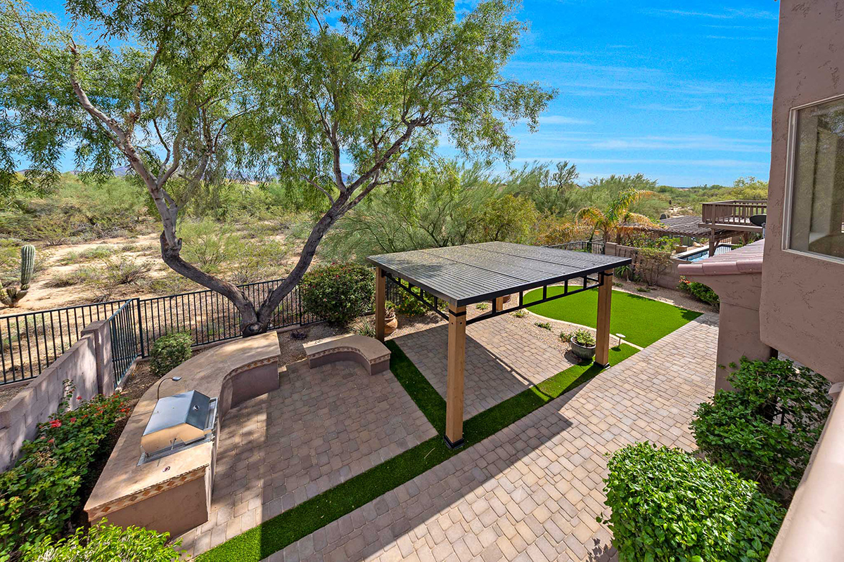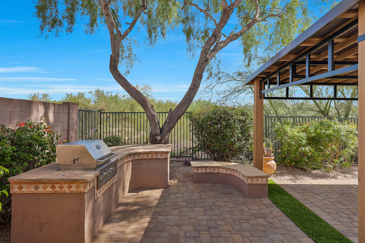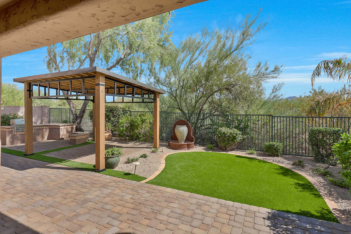 The backyard is designed for entertaining with a freestanding pergola, built-in BBQ, artificial turf, and two covered patios, all backing to Natural Area Open Space for added privacy and serene desert views.