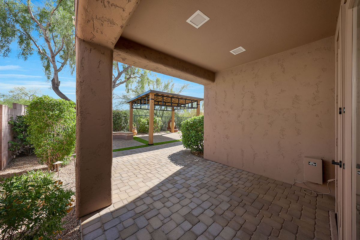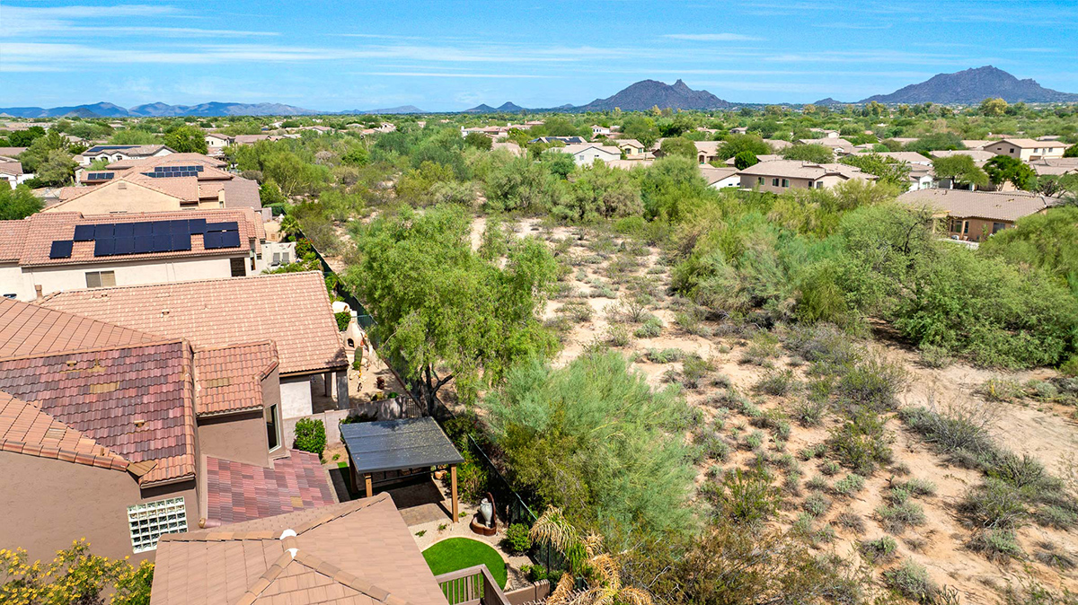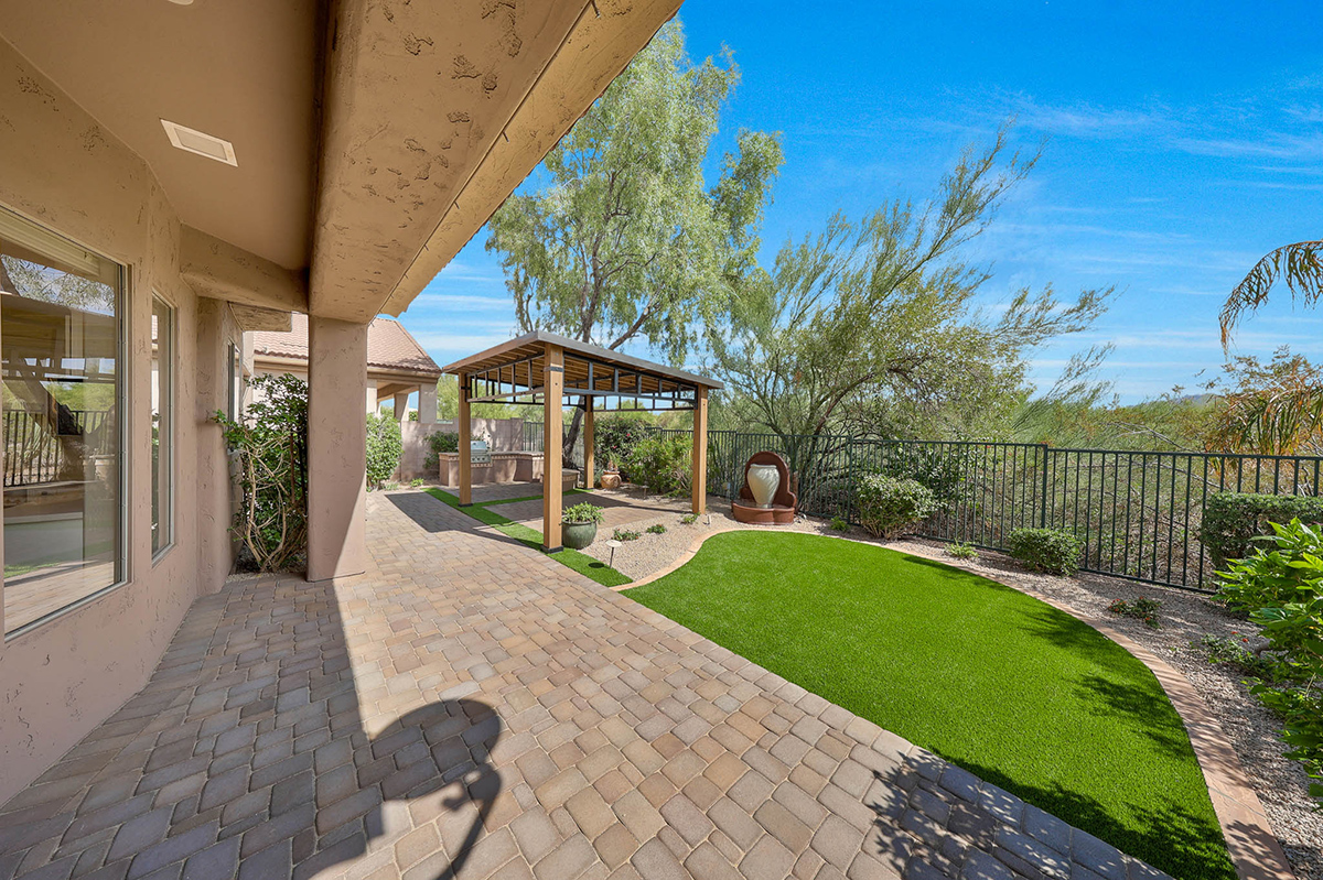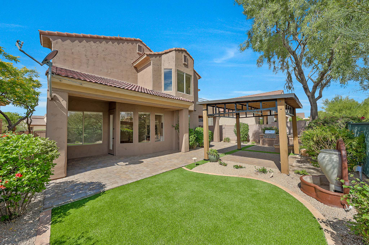 The backyard is designed for entertaining with a freestanding pergola, built-in BBQ, artificial turf, and two covered patios, all backing to Natural Area Open Space for added privacy and serene desert views.