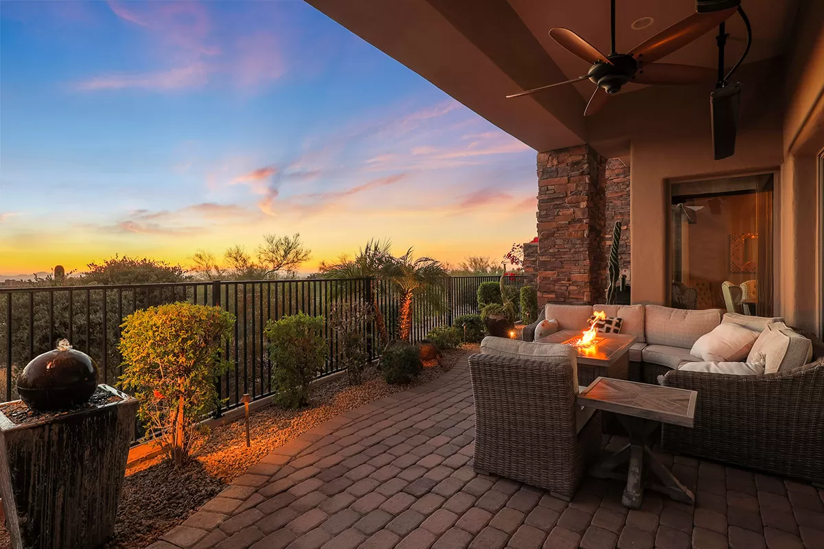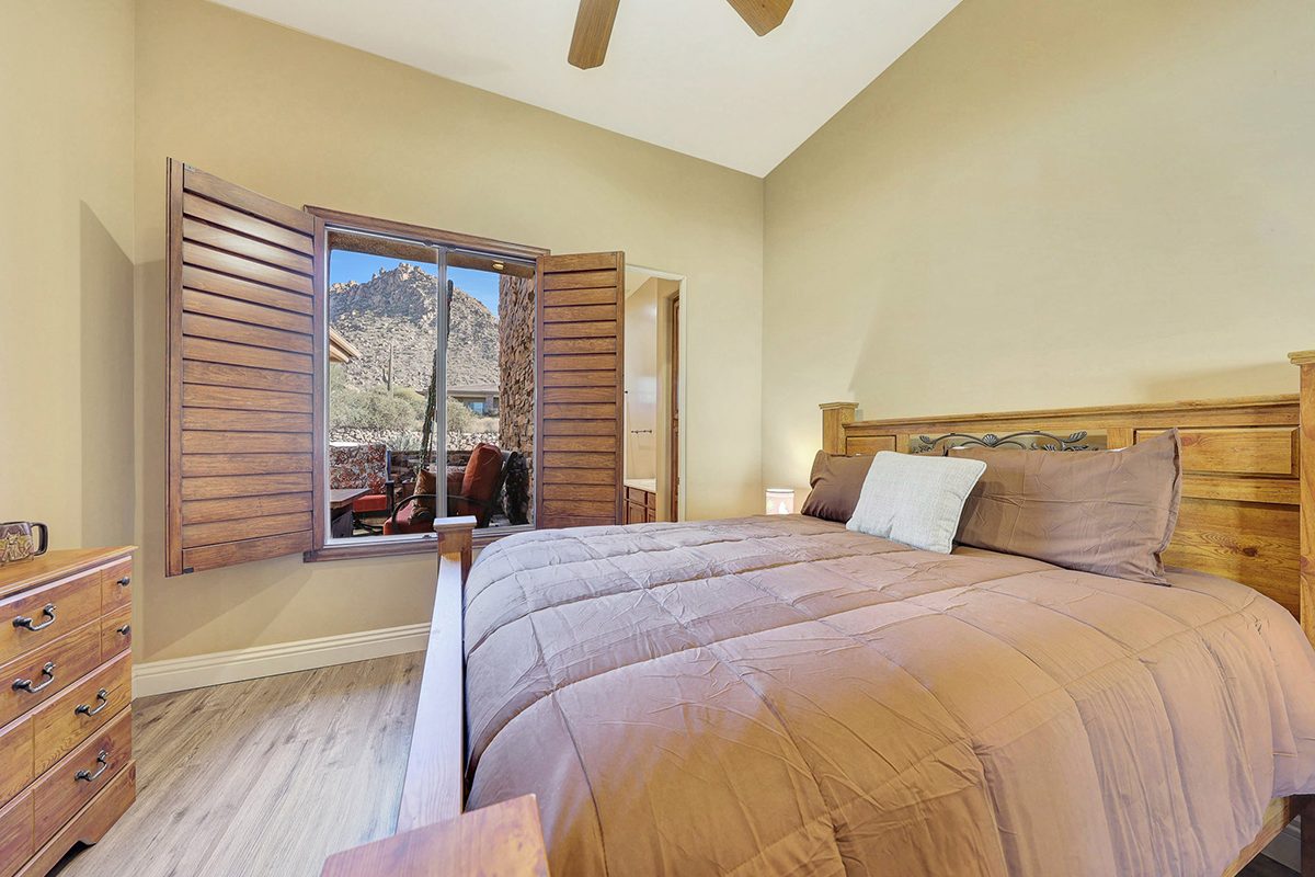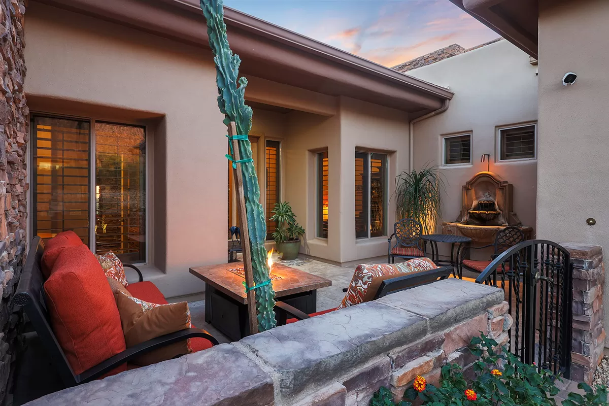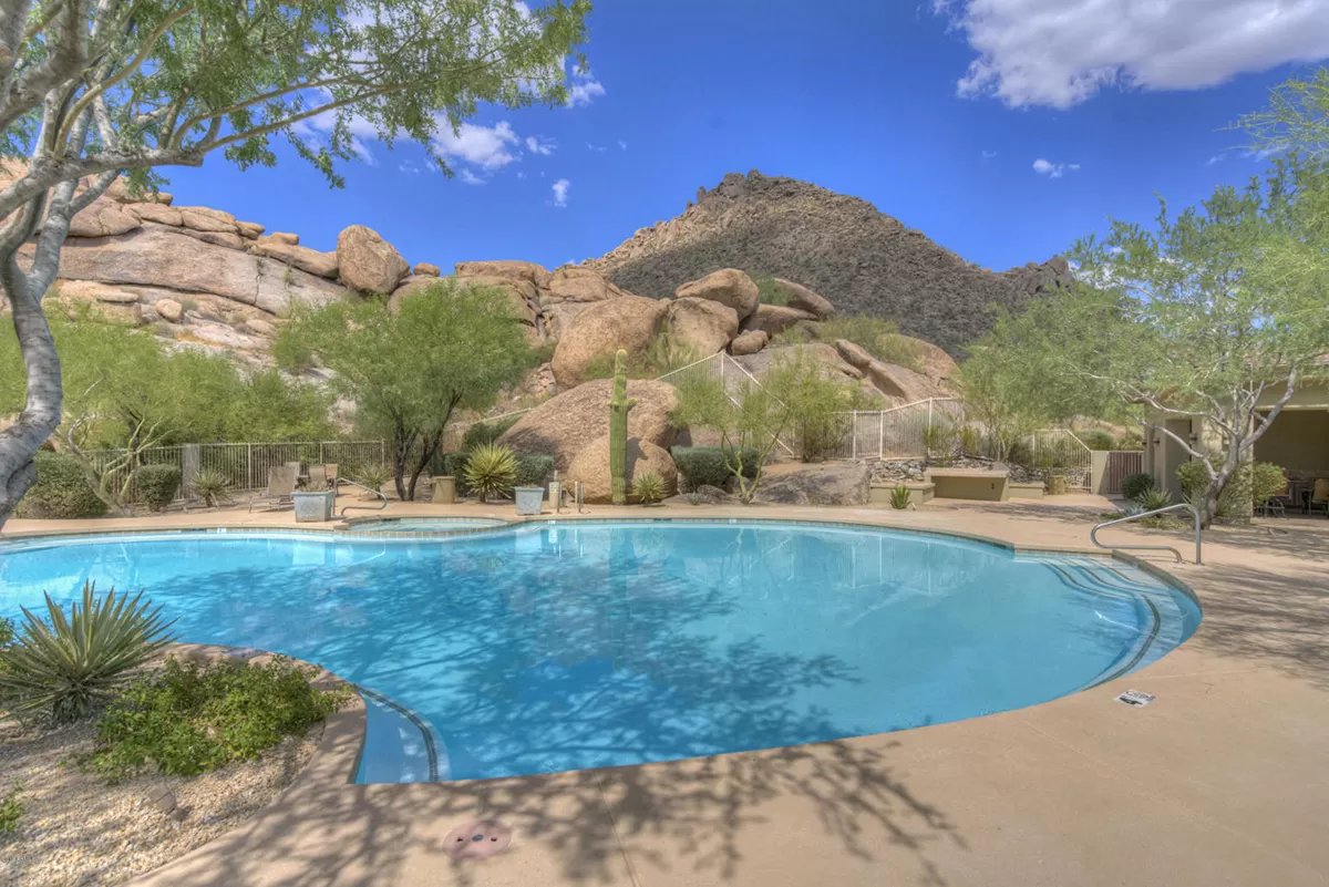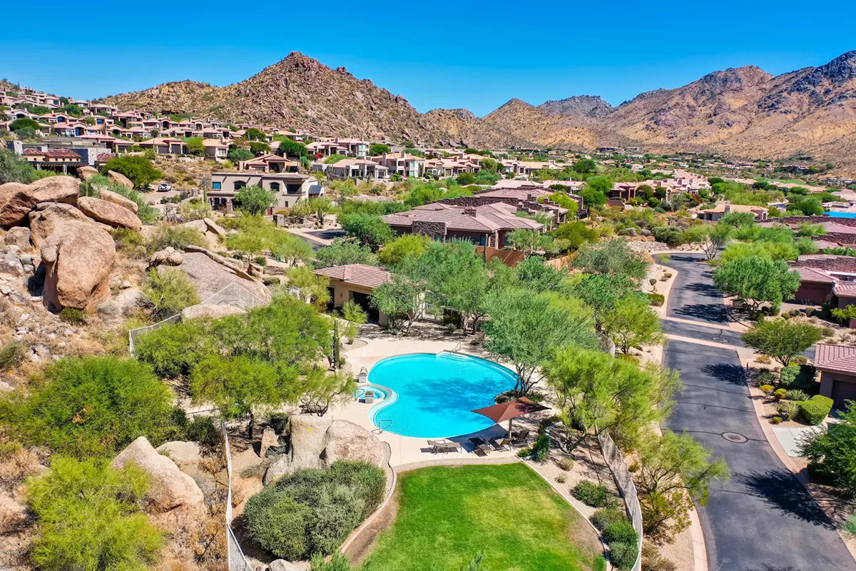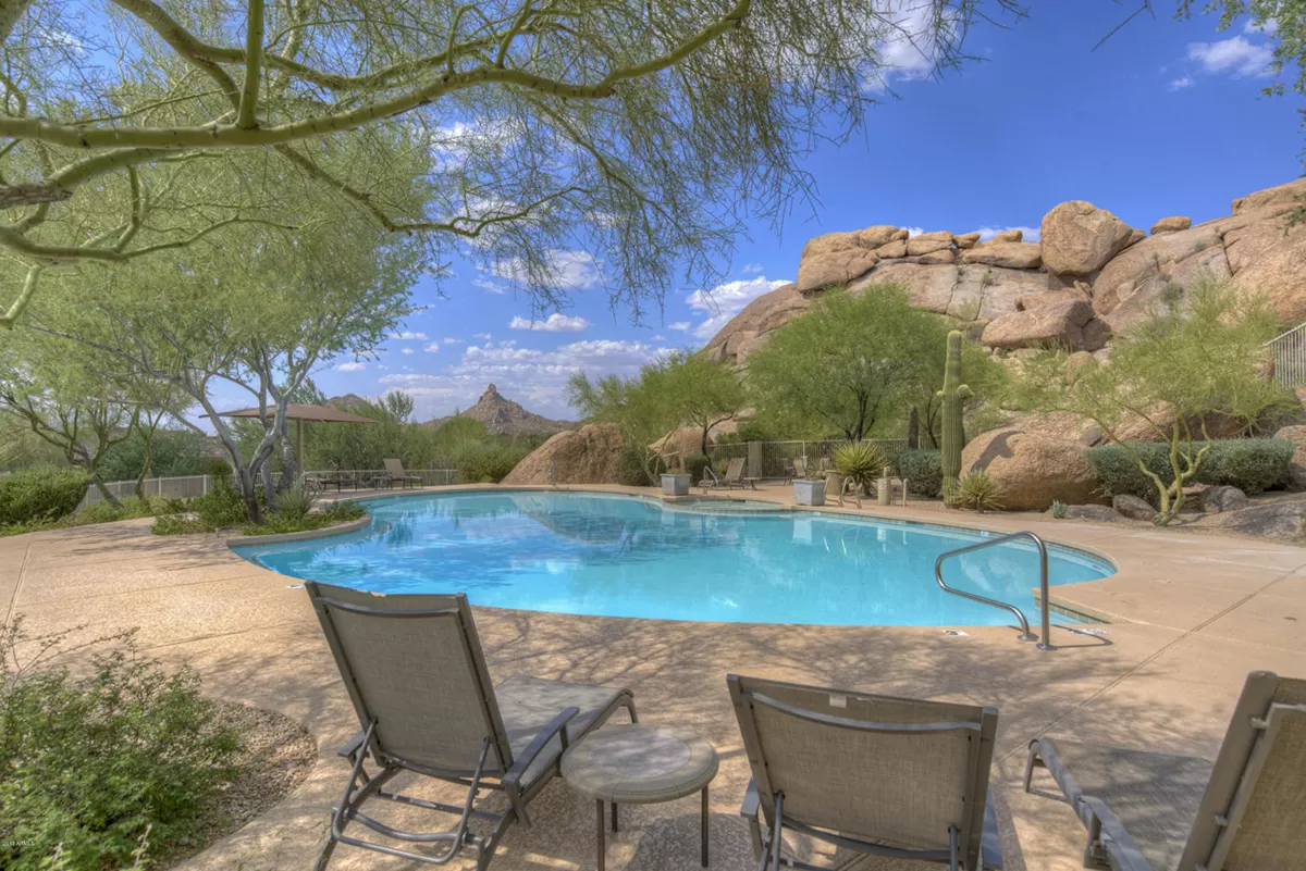 Residents of Tusayan enjoy a heated community pool and spa set amid the serene desert landscape, with views of iconic Pinnacle Peak. Additional highlights include a pavered front courtyard with a charming water feature, plantation shutters, central vacuum, built-in office cabinetry, and a two-car garage with epoxy flooring and storage.