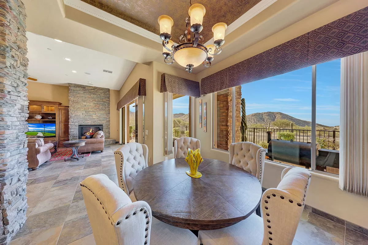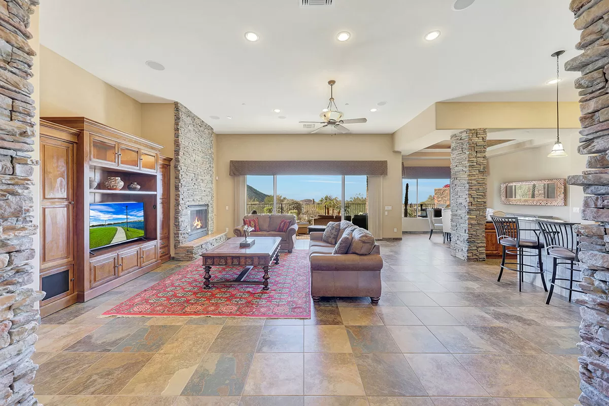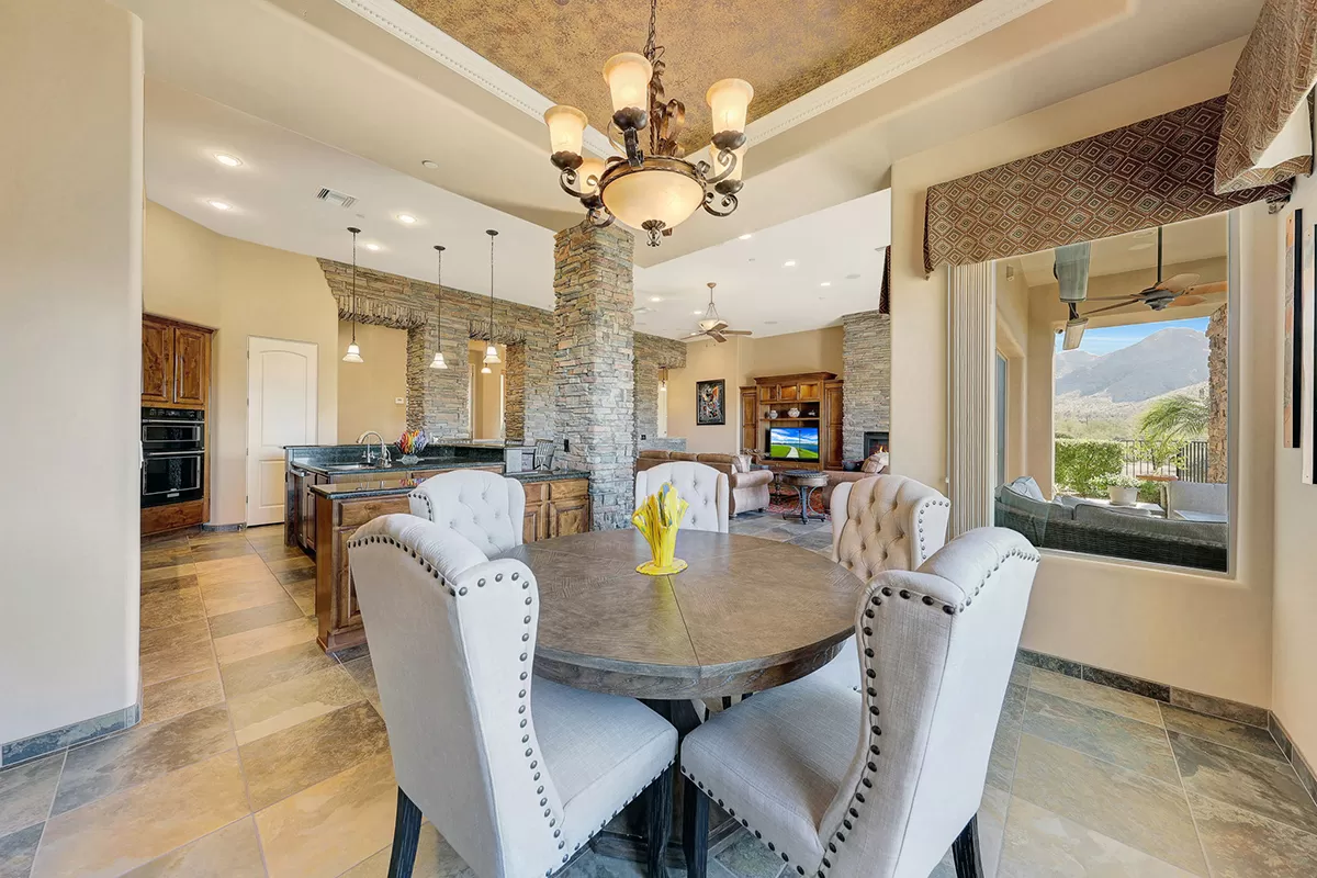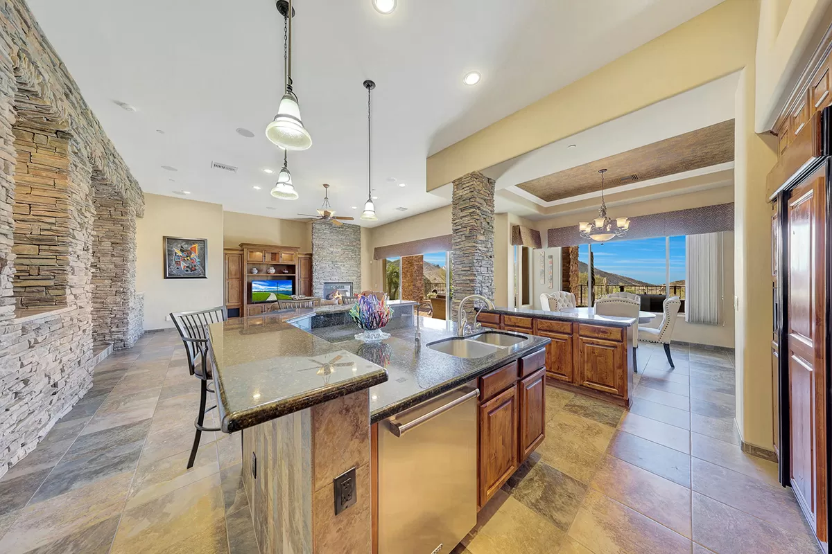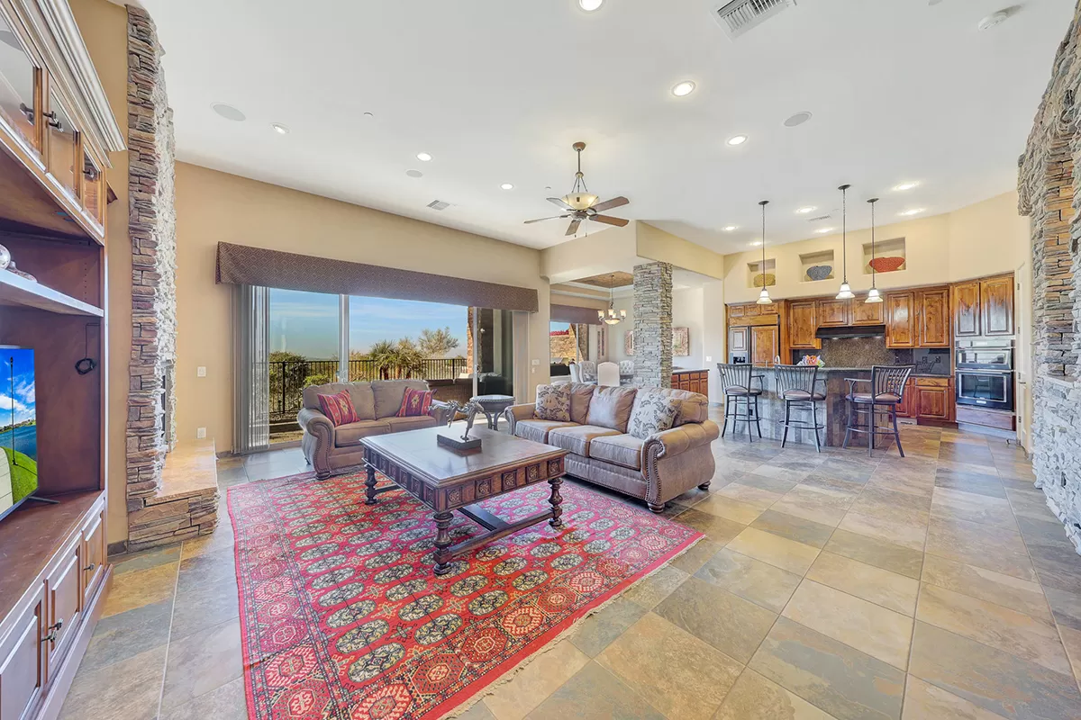 The great room, with its soaring ceilings and inviting gas fireplace, is the centerpiece of the home. It features slate-style flooring, granite slab countertops, a gas range, stained cabinetry, and walls of windows that capture picturesque views. Seamlessly connected to the kitchen with a breakfast bar and the spacious back patio, this home is perfect for entertaining or relaxing. The outdoor living space is equipped with heaters, a built-in BBQ, dining area, and ample seating—all framed by spectacular desert vistas.