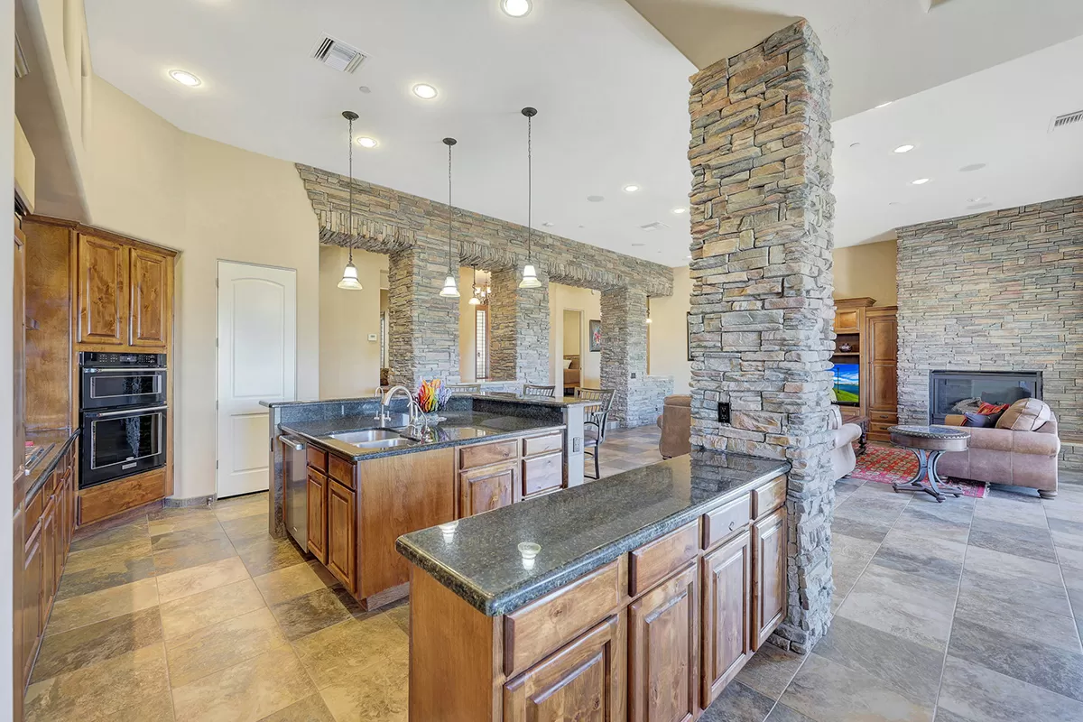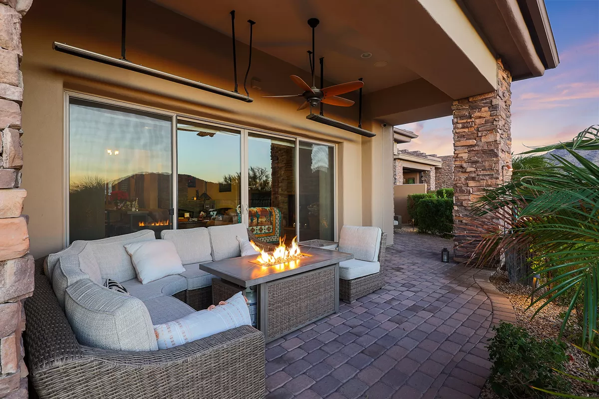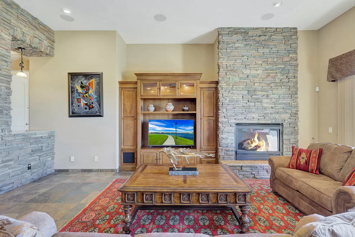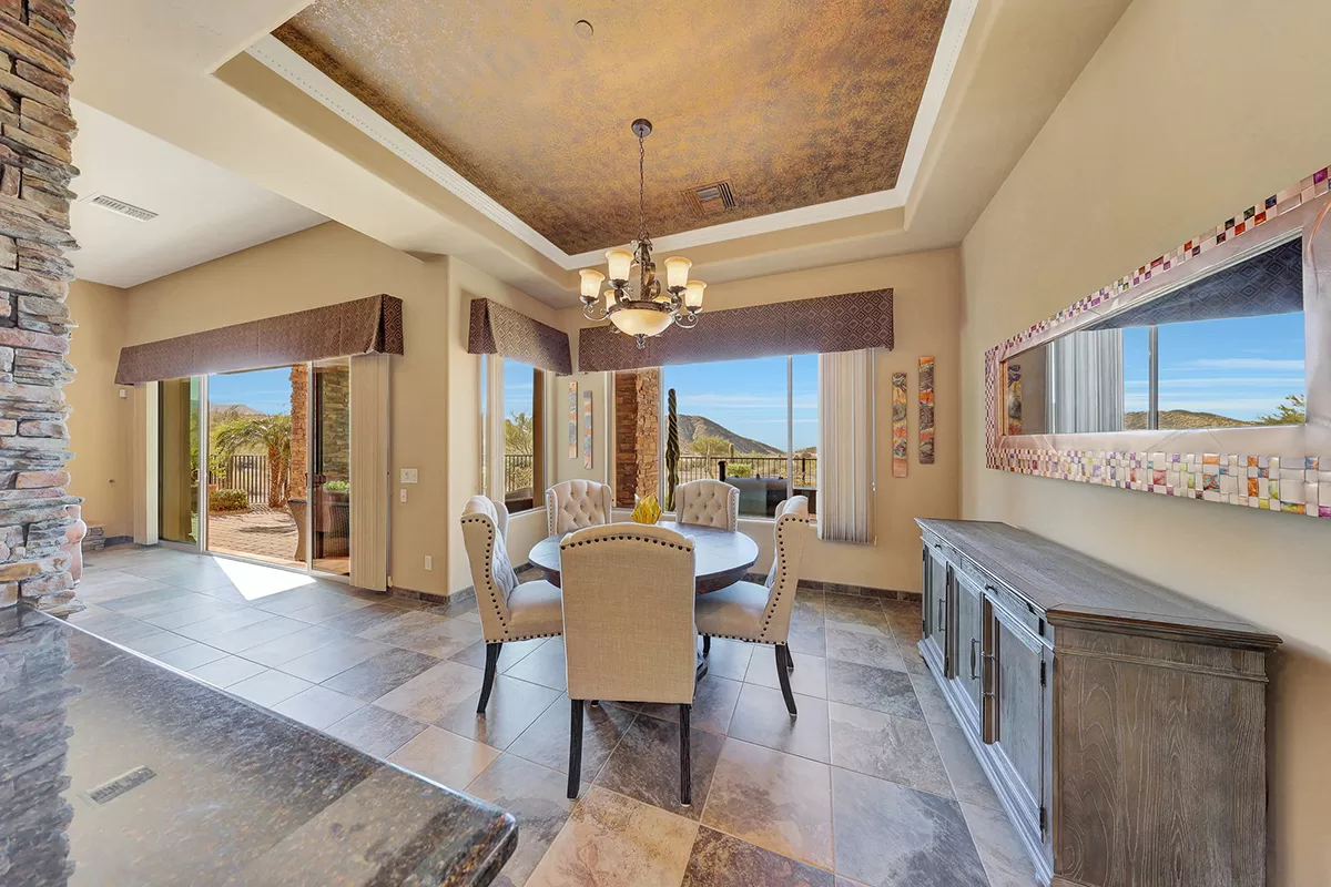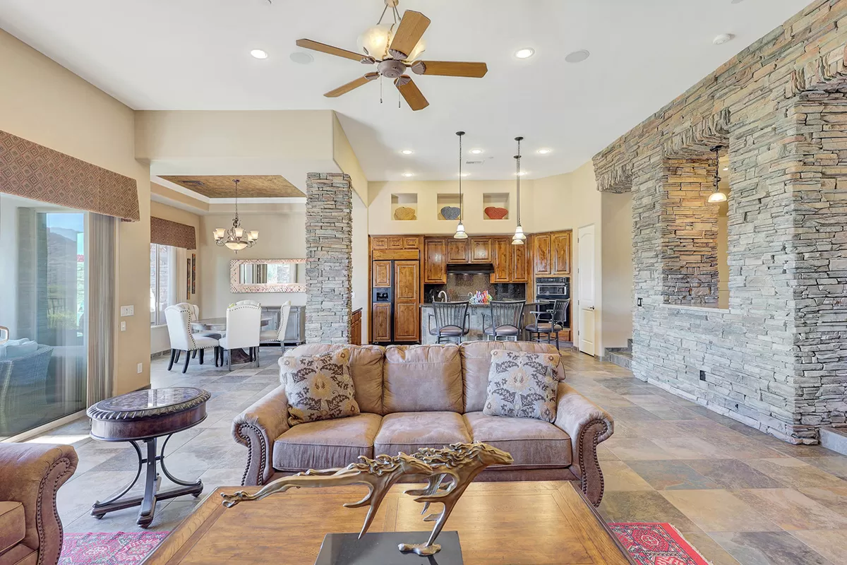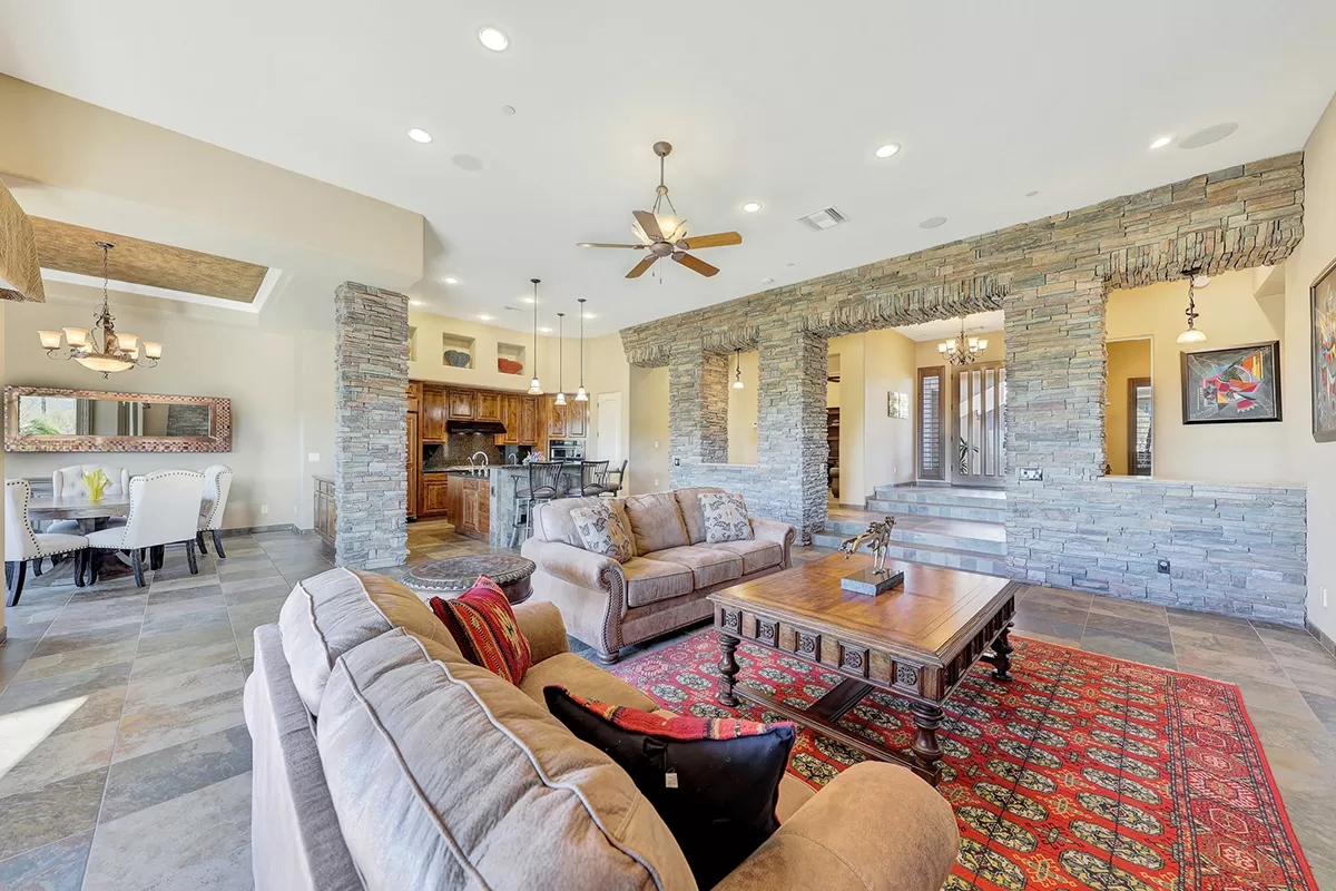 The great room, with its soaring ceilings and inviting gas fireplace, is the centerpiece of the home. It features slate-style flooring, granite slab countertops, a gas range, stained cabinetry, and walls of windows that capture picturesque views. Seamlessly connected to the kitchen with a breakfast bar and the spacious back patio, this home is perfect for entertaining or relaxing. The outdoor living space is equipped with heaters, a built-in BBQ, dining area, and ample seating—all framed by spectacular desert vistas.