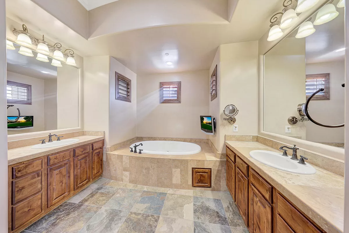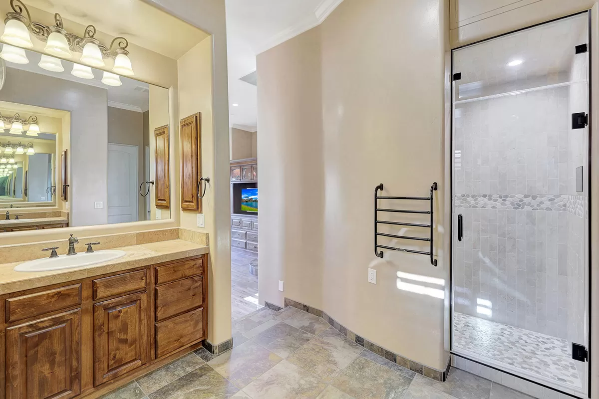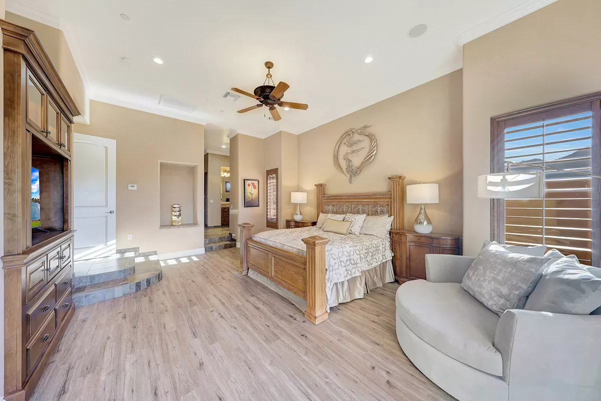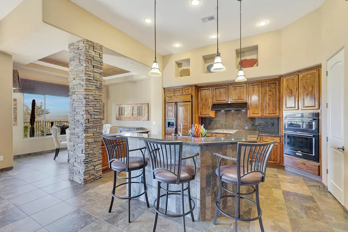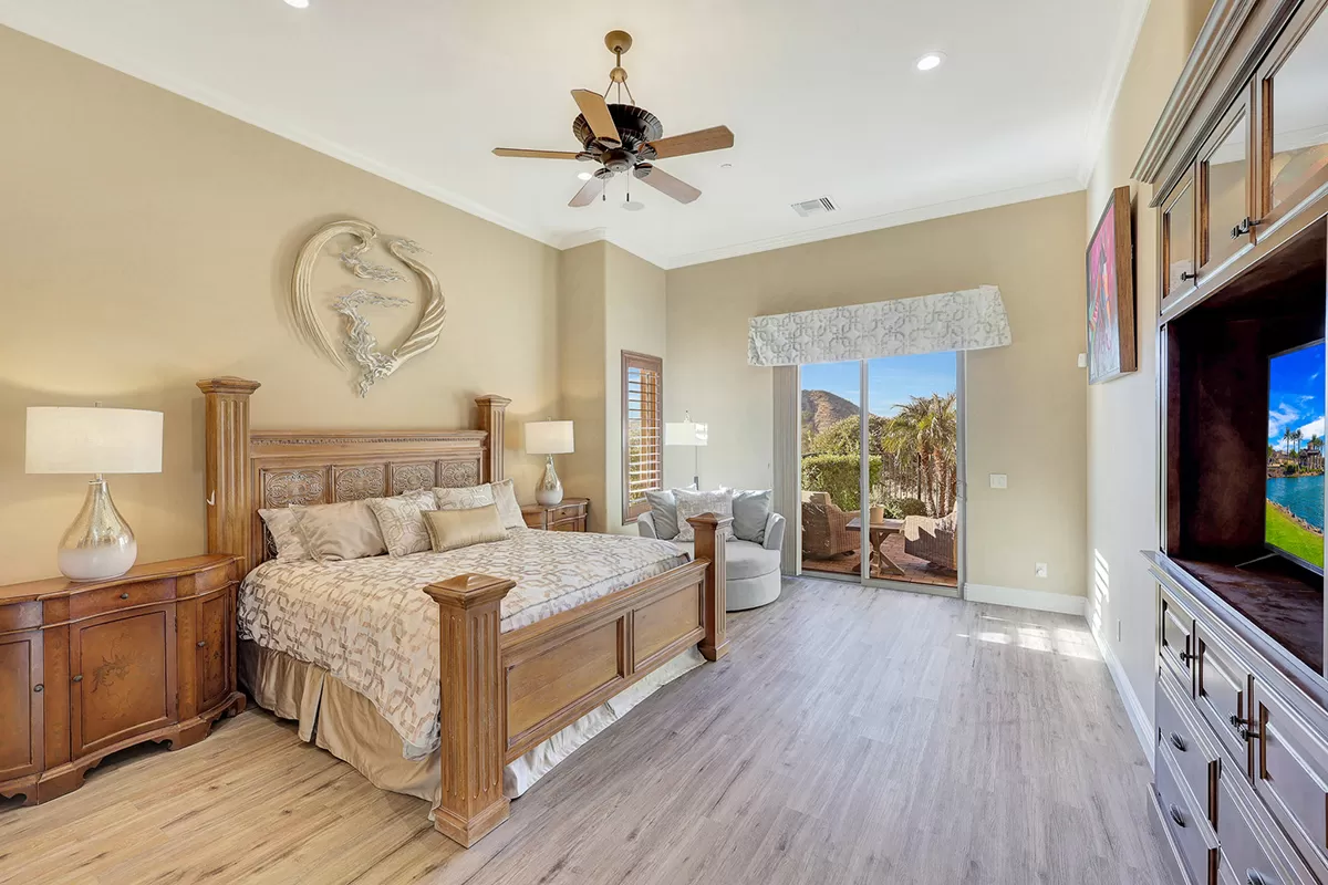The great room, with its soaring ceilings and inviting gas fireplace, is the centerpiece of the home. It features slate-style flooring, granite slab countertops, a gas range, stained cabinetry, and walls of windows that capture picturesque views. Seamlessly connected to the kitchen with a breakfast bar and the spacious back patio, this home is perfect for entertaining or relaxing. The outdoor living space is equipped with heaters, a built-in BBQ, dining area, and ample seating—all framed by spectacular desert vistas.