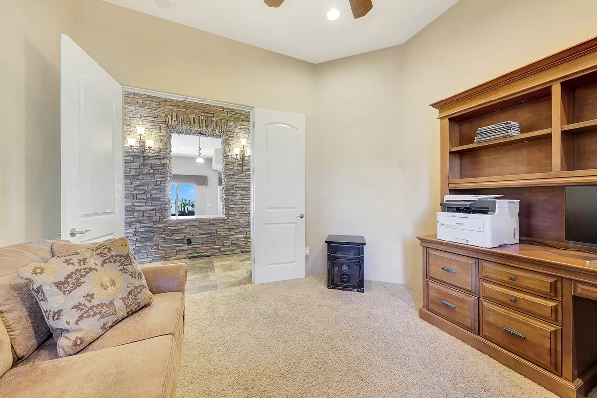 Discover the perfect lock-and-leave retreat, seasonal getaway, or easy-care full-time villa residence in the exclusive gated community of Tusayan at Troon Village. Spanning over 2,600 square feet, this beautifully crafted home offers two bedrooms, a private den, and two and a half baths. Built by Monterey Homes in 2005, the open-concept design showcases stunning architectural details, unique stonework, and breathtaking city light and mountain views.