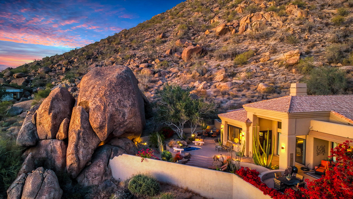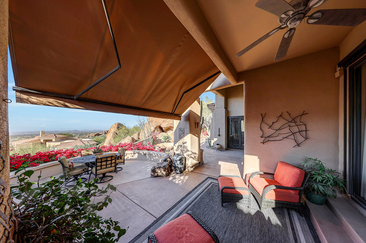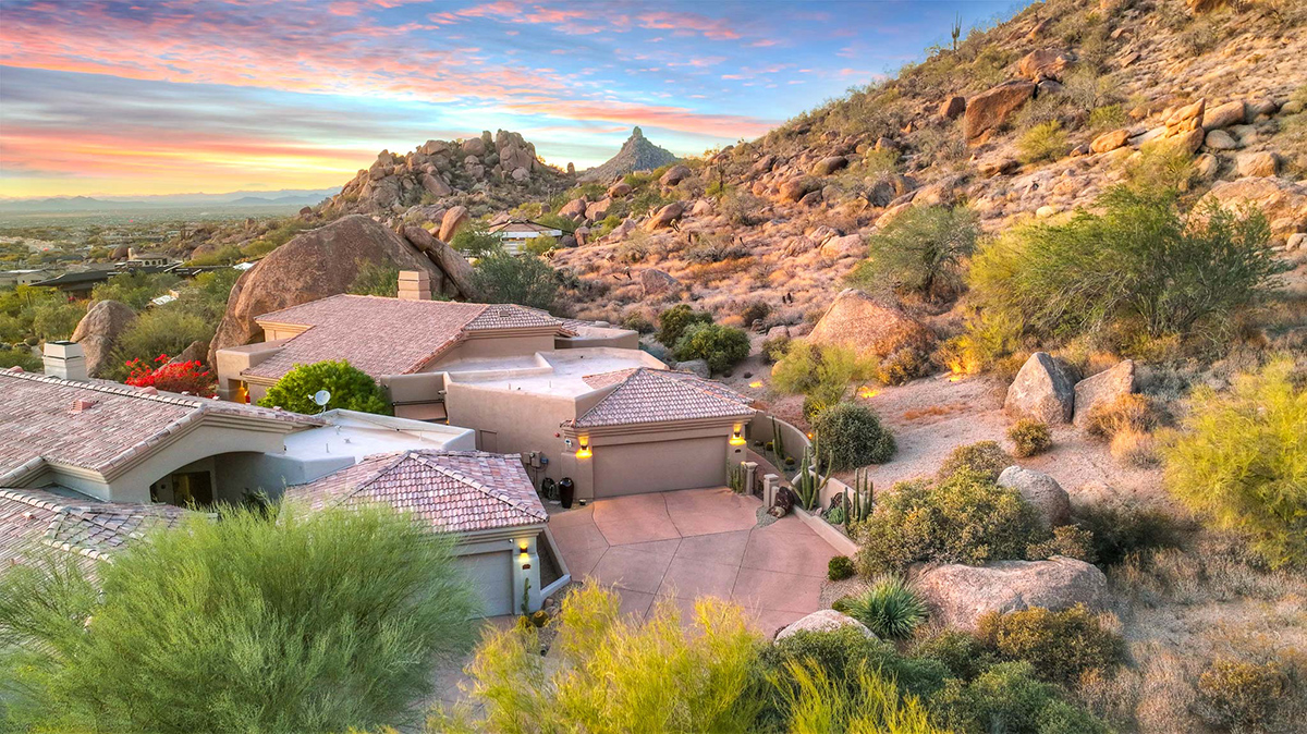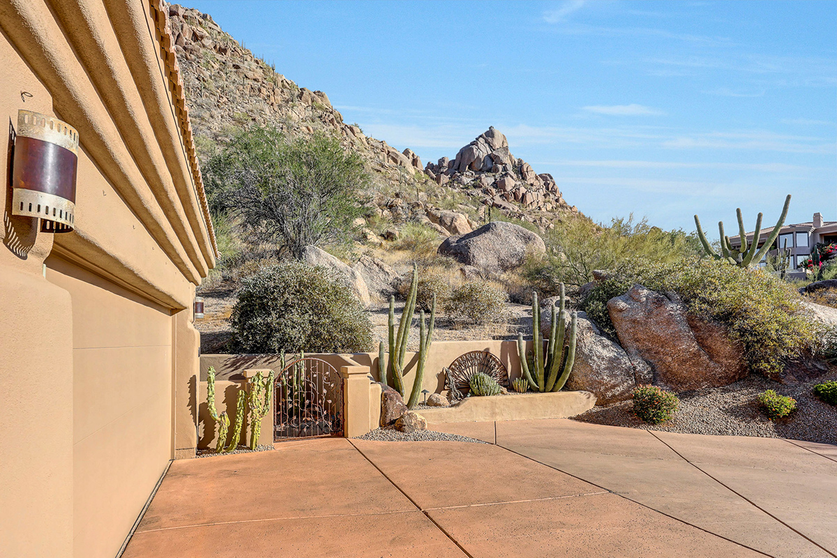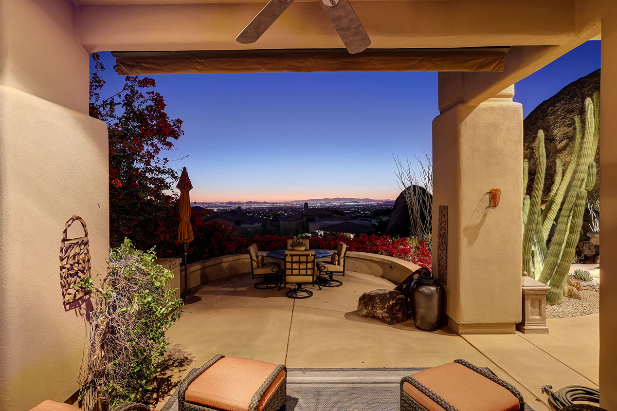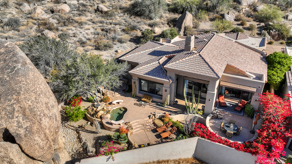 At the top of the hillside, experience unparalleled views and luxurious living in the gated community of Whispering Ridge at Troon Village. Situated on the south side of Troon Mountain, this exclusive homesite offers privacy and stunning mountain and city light views. This 2,943 sq. ft. home is perfectly positioned at the end of a cul-de-sac and near the community pool and spa. Nestled against a backdrop of dramatic boulder outcroppings and protected NAOS land, the property has some of the best views in the area.