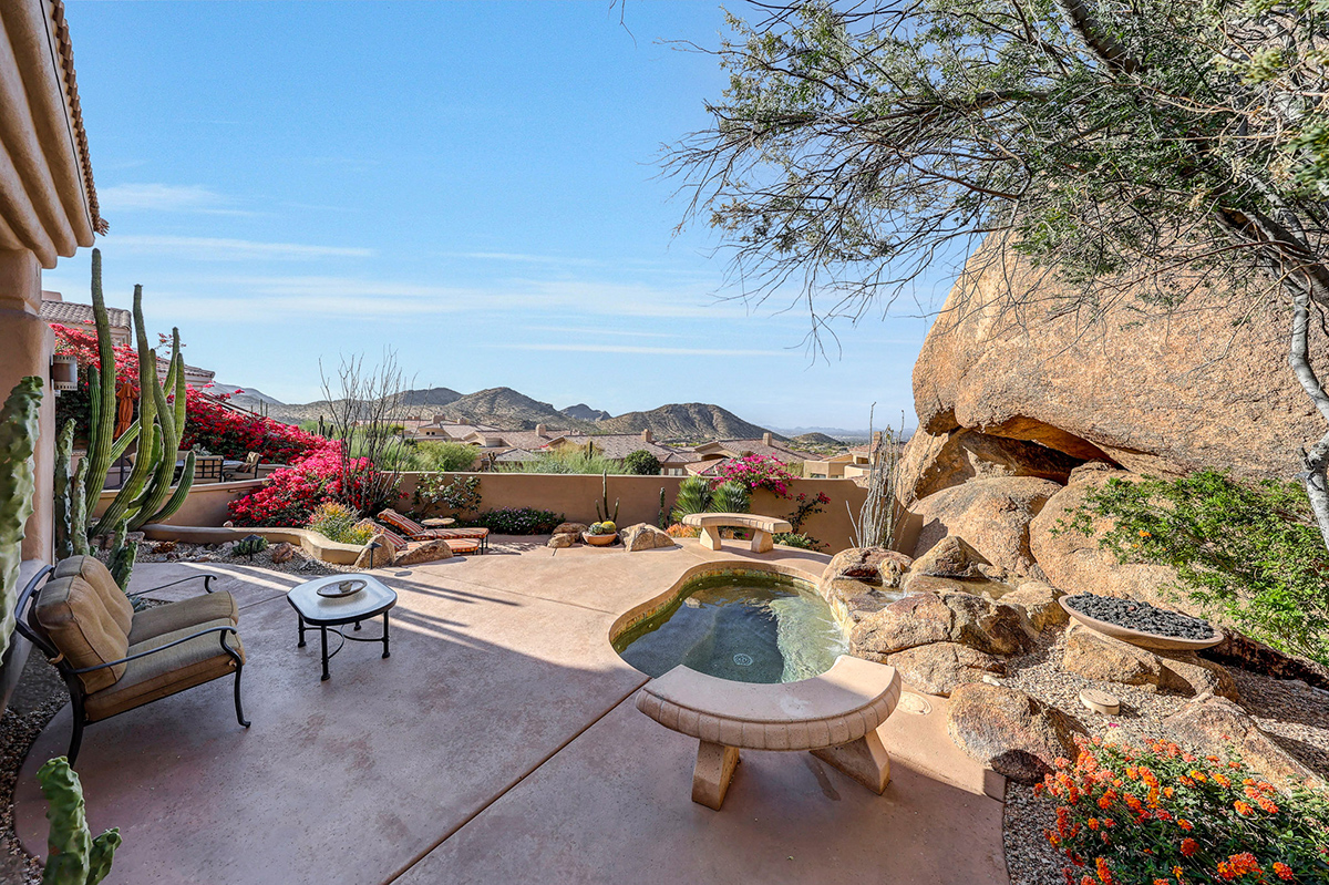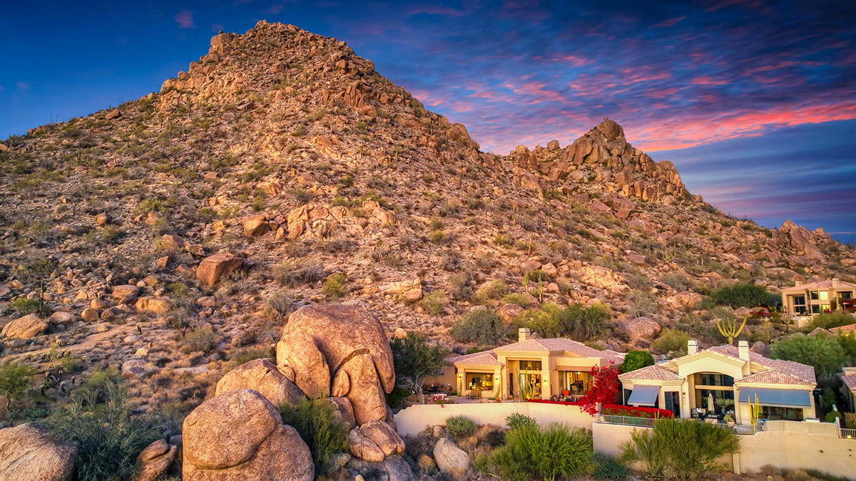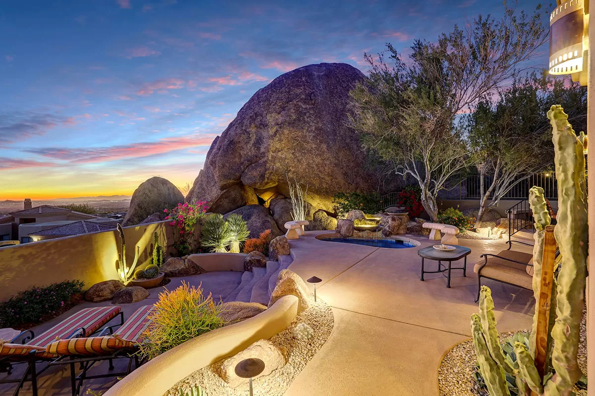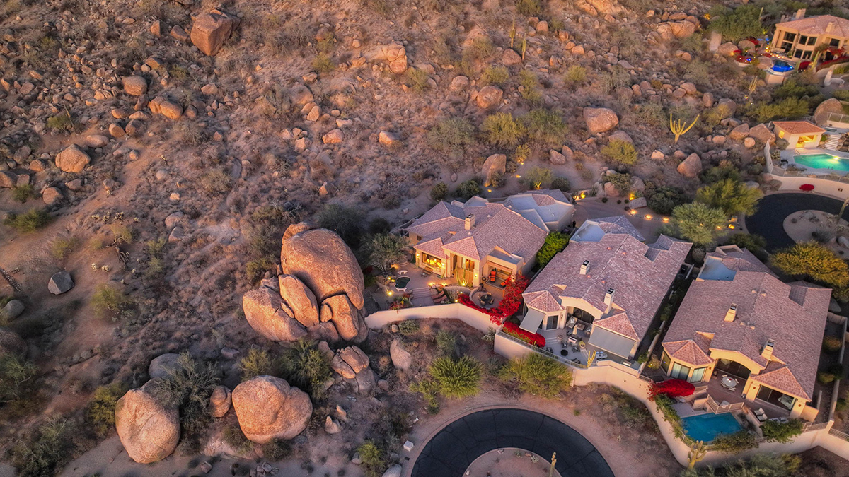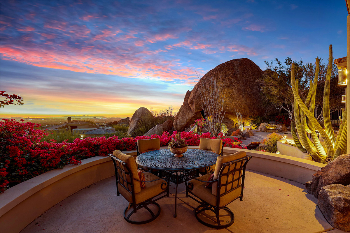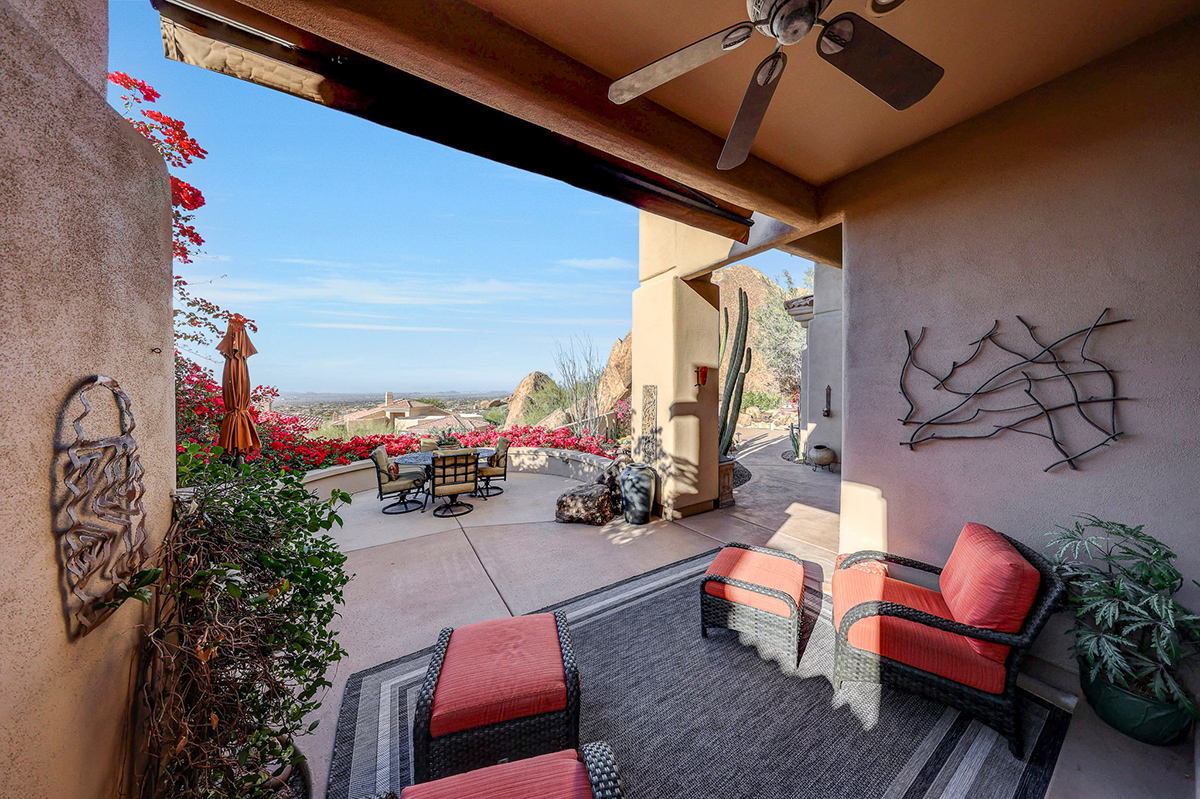 At the top of the hillside, experience unparalleled views and luxurious living in the gated community of Whispering Ridge at Troon Village. Situated on the south side of Troon Mountain, this exclusive homesite offers privacy and stunning mountain and city light views. This 2,943 sq. ft. home is perfectly positioned at the end of a cul-de-sac and near the community pool and spa. Nestled against a backdrop of dramatic boulder outcroppings and protected NAOS land, the property has some of the best views in the area.