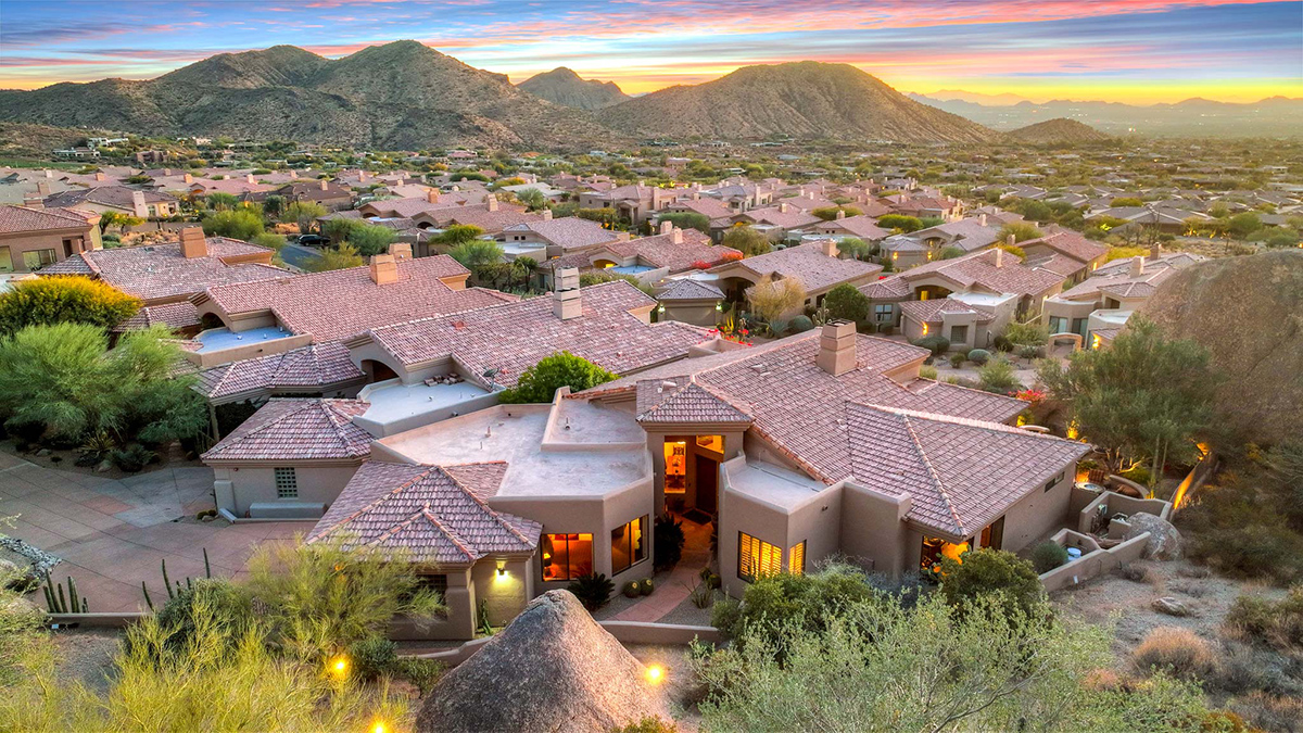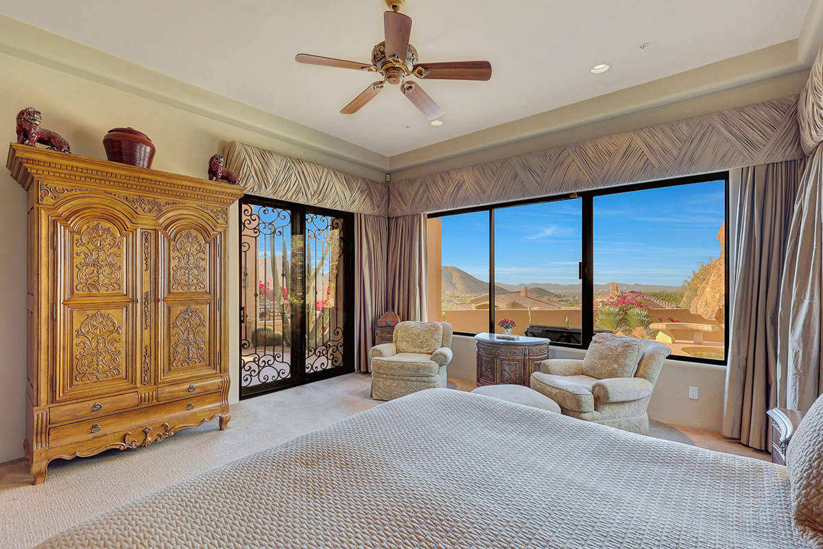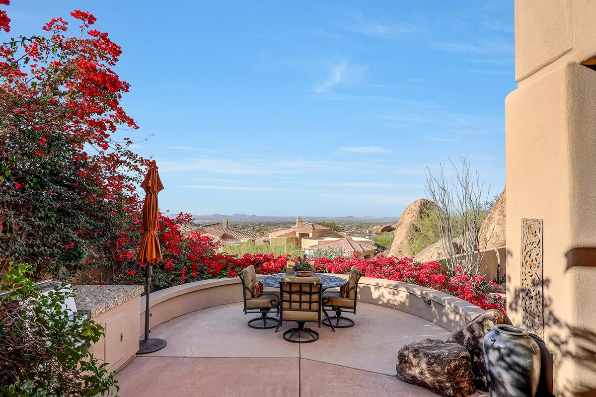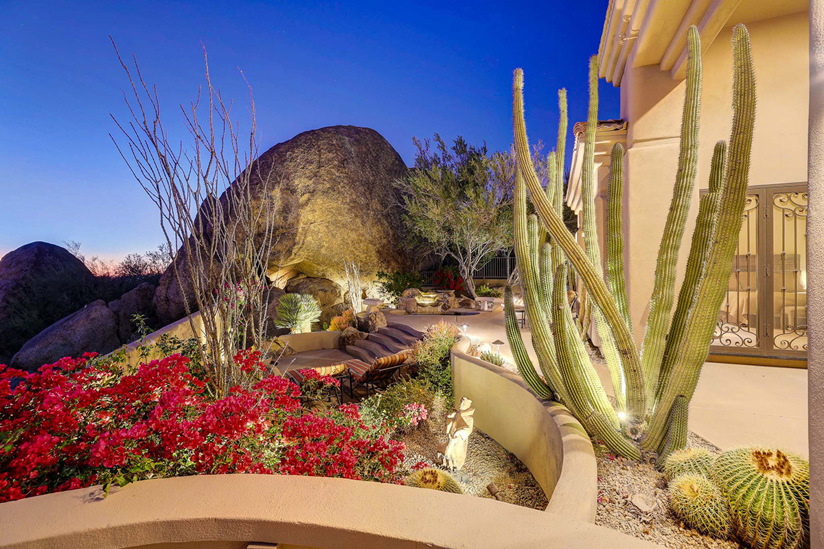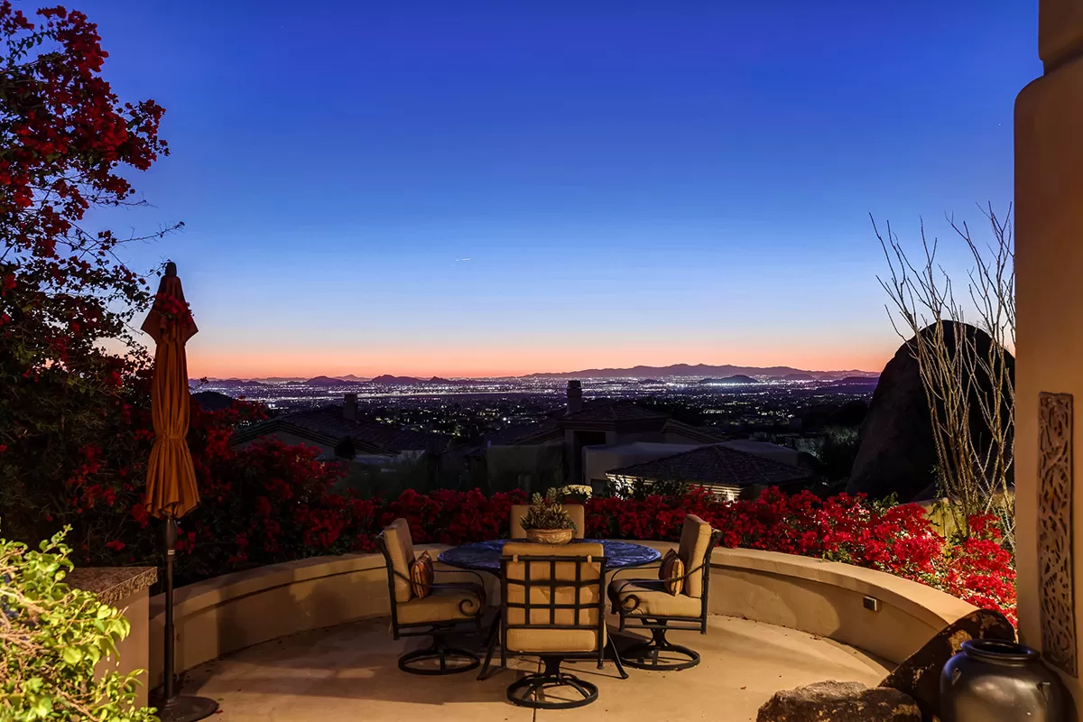 At the top of the hillside, experience unparalleled views and luxurious living in the gated community of Whispering Ridge at Troon Village. Situated on the south side of Troon Mountain, this exclusive homesite offers privacy and stunning mountain and city light views. This 2,943 sq. ft. home is perfectly positioned at the end of a cul-de-sac and near the community pool and spa. Nestled against a backdrop of dramatic boulder outcroppings and protected NAOS land, the property has some of the best views in the area.