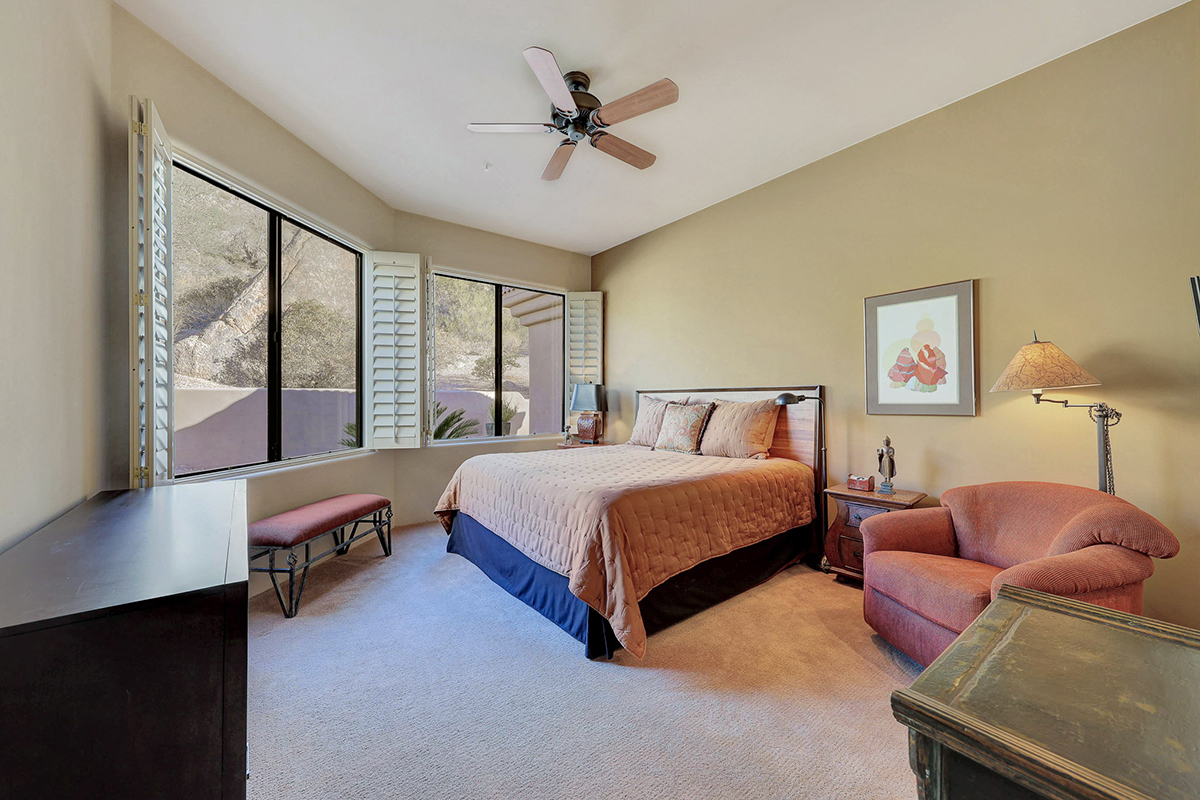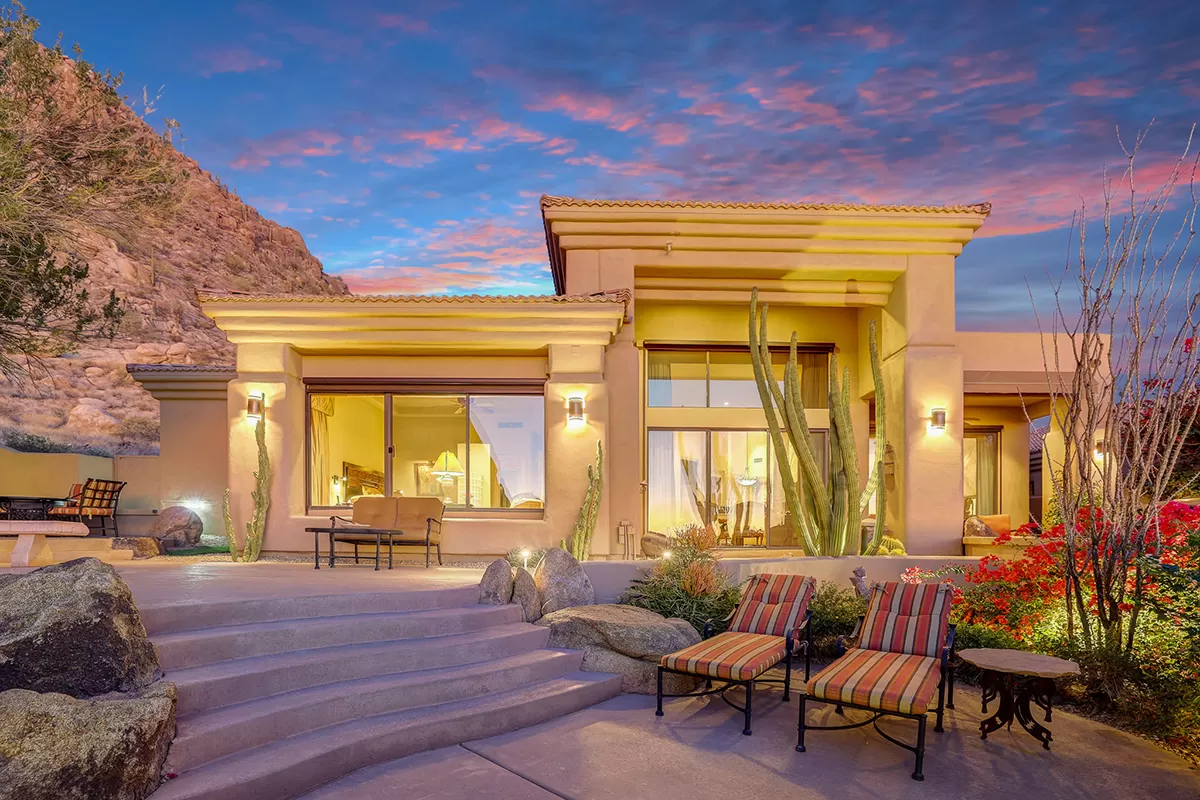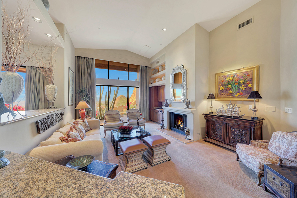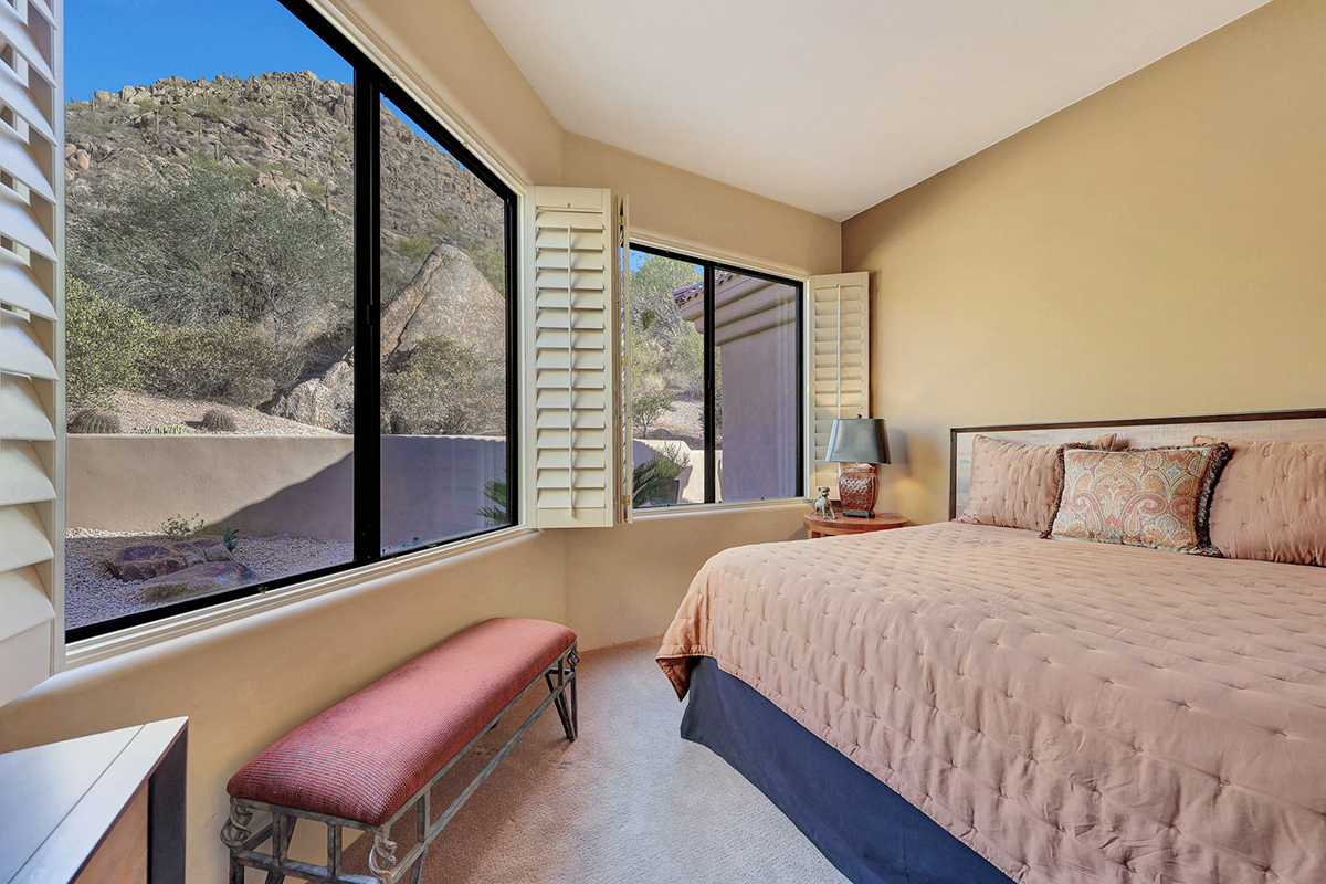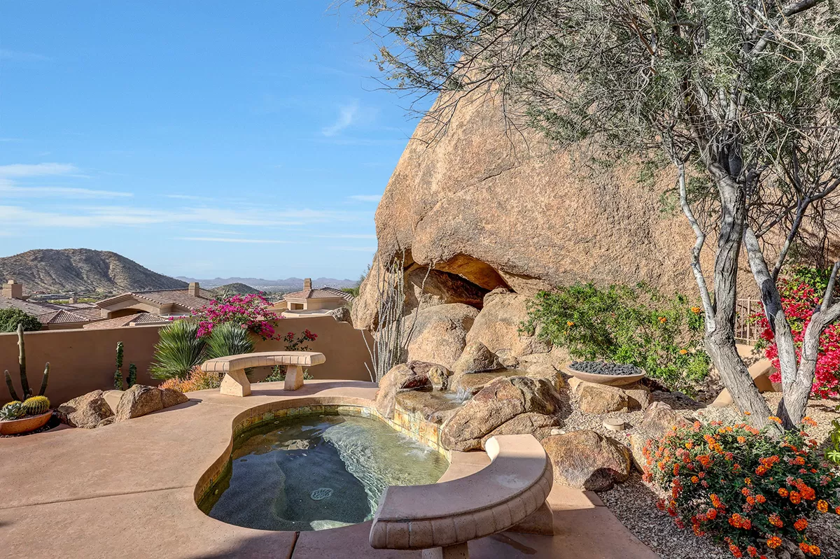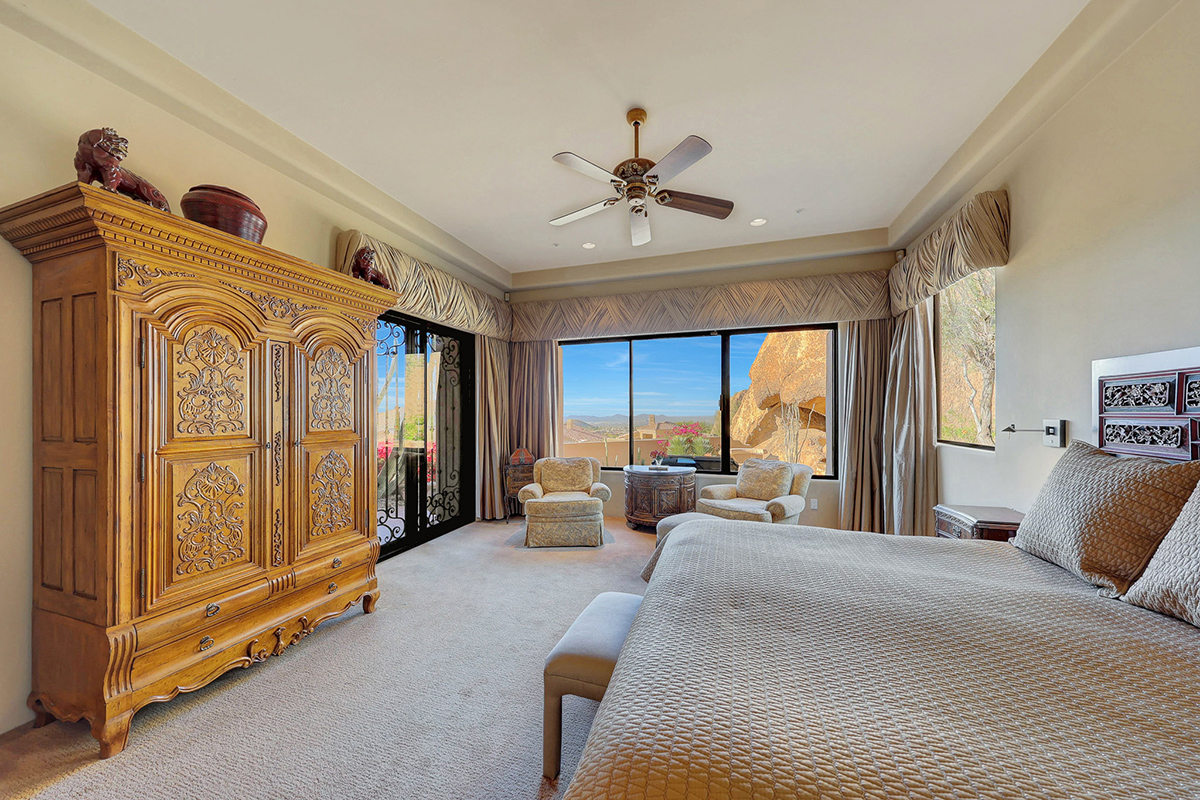 At the top of the hillside, experience unparalleled views and luxurious living in the gated community of Whispering Ridge at Troon Village. Situated on the south side of Troon Mountain, this exclusive homesite offers privacy and stunning mountain and city light views. This 2,943 sq. ft. home is perfectly positioned at the end of a cul-de-sac and near the community pool and spa. Nestled against a backdrop of dramatic boulder outcroppings and protected NAOS land, the property has some of the best views in the area.